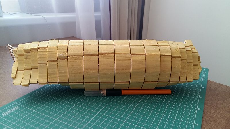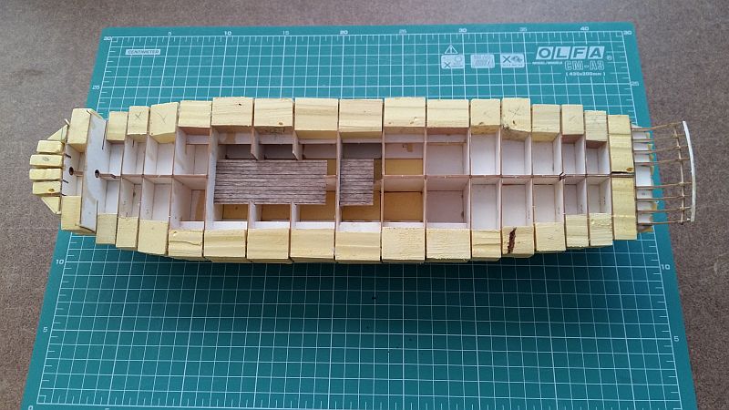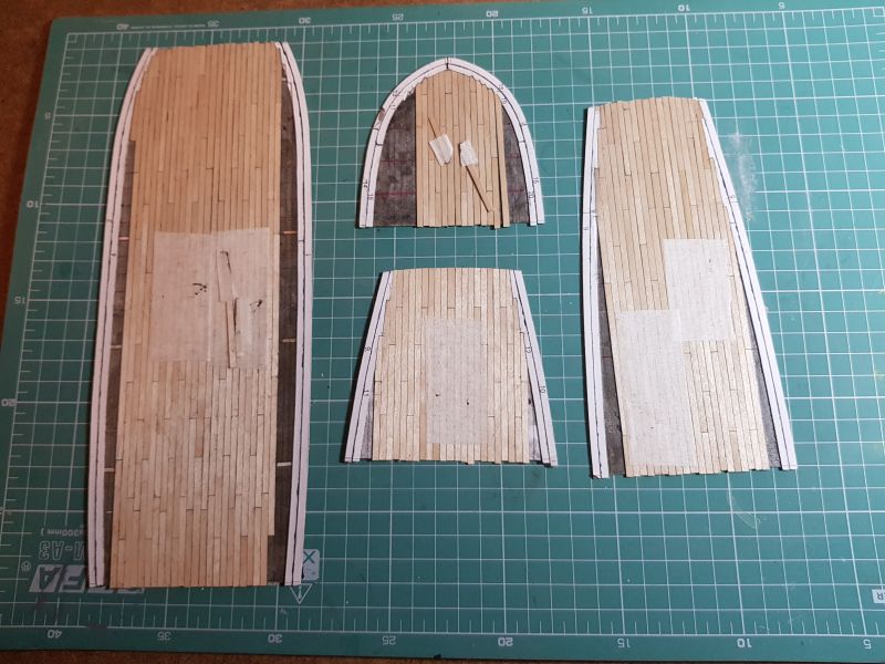Rozpocząłem wykonywanie pokładów. Korzystałem z porad zamieszczonych na KODZE oraz z książki Mondfelda.. Planki z forniru brzozowego gr. 0.6, szer. 3 mm, dł. 72 mm., klejone butaprenem do tektury 0.5 mm., boki malowane czarną farbą akrylową x2, na podkładzie z kleju Pattex.