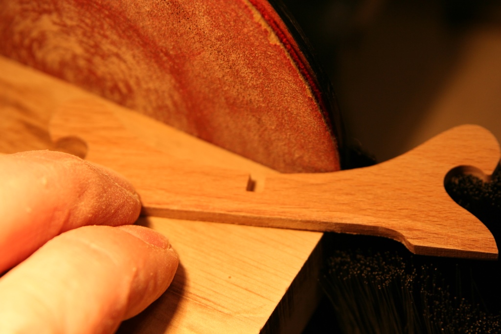 Powoli zaczną się prace na pokładzie więc myślę, że dobry moment na wykonanie podstawki. Drewno bukowe, po odrysowaniu kształtu większość wyszlifowana na szlifierce tarczowej natomiast wewnętrzny mały łuk za pomocą wiertarki z "patykiem szlifierskim" wykonanym z kołka bukowego 8mm oklejonego paskiem papieru gr120 (pokazany na zdj.). Wycinanie piłką włosową trwałoby kilka razy dłużej.