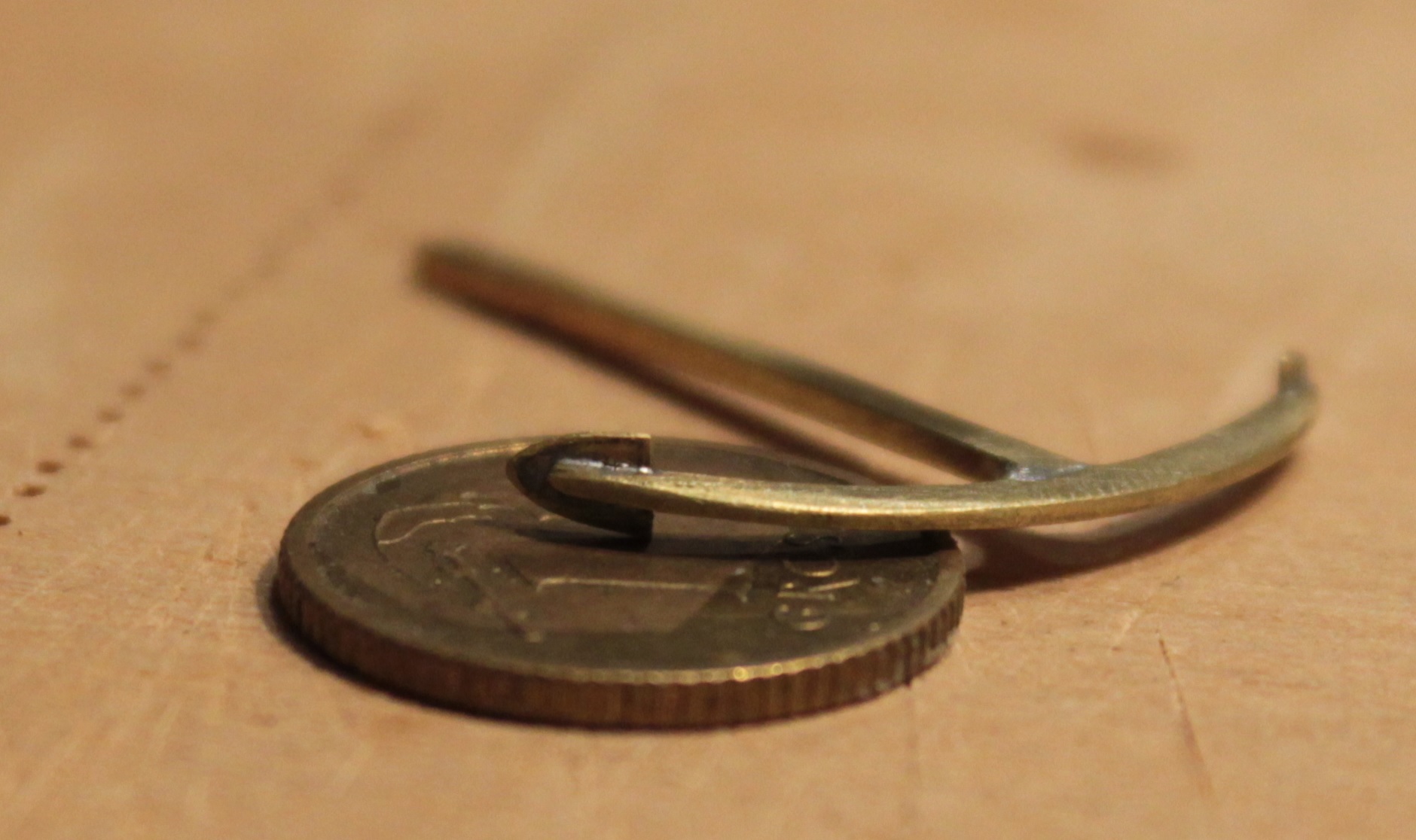 Pozazdrościłem pięknych kotwic z Alerta Piotrka, no i zrobiłem swoje dużo mniej piękne dwie kotwice. Z braku tak grubej mosiężnej blachy podstawowe elementy odkułem z drutu mosiężnego (1,6 mm i 1,2 mm), łapy to blaszka 0,25 mm.