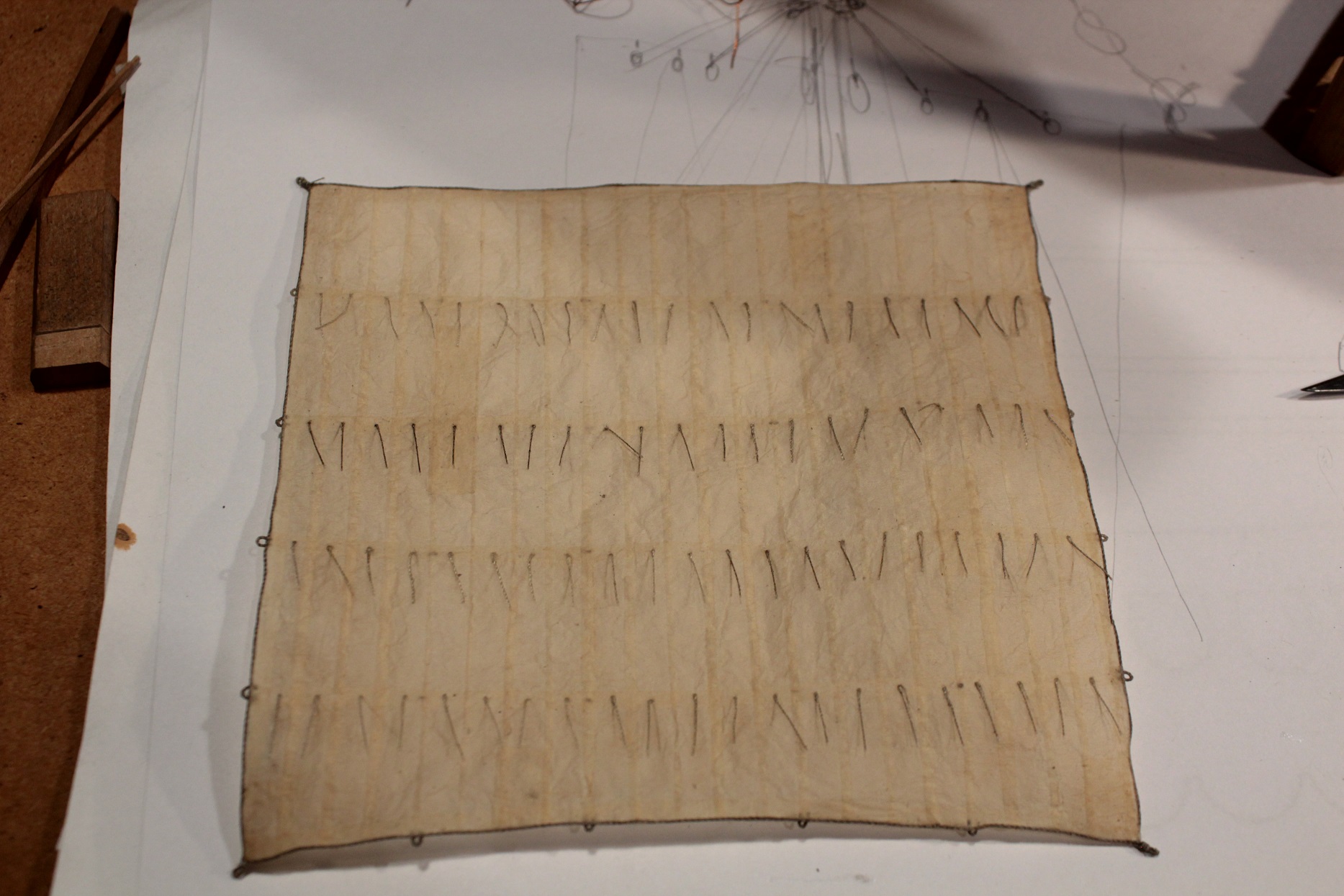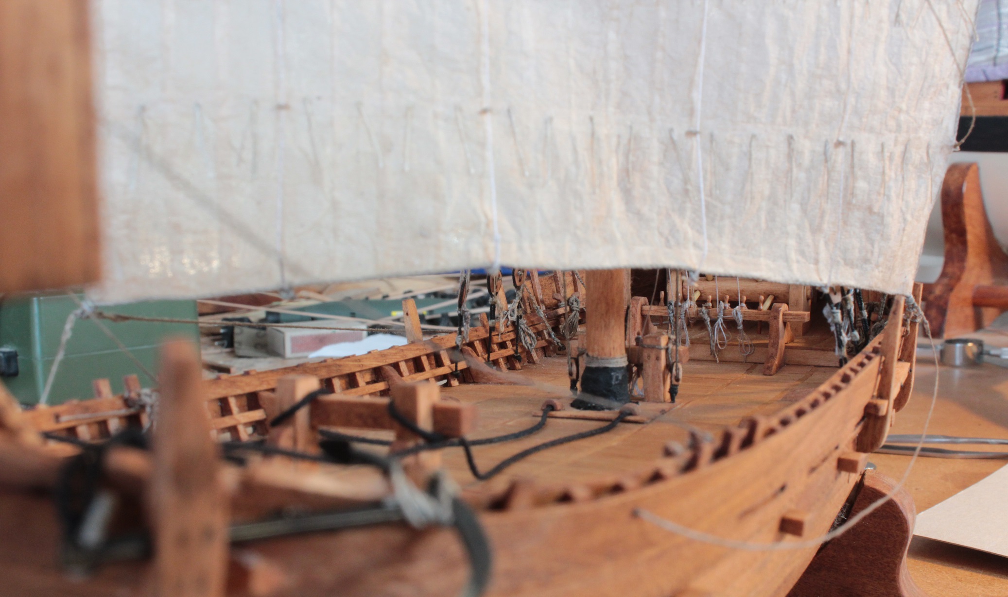 Kotwice podwiesiłem, żagiel też mam gotowy. Żagiel zrobiłem na tych samych zasadach co mikromodelarze, ale brytów nie rysowałem, tylko sklejałem jeden na drugi.