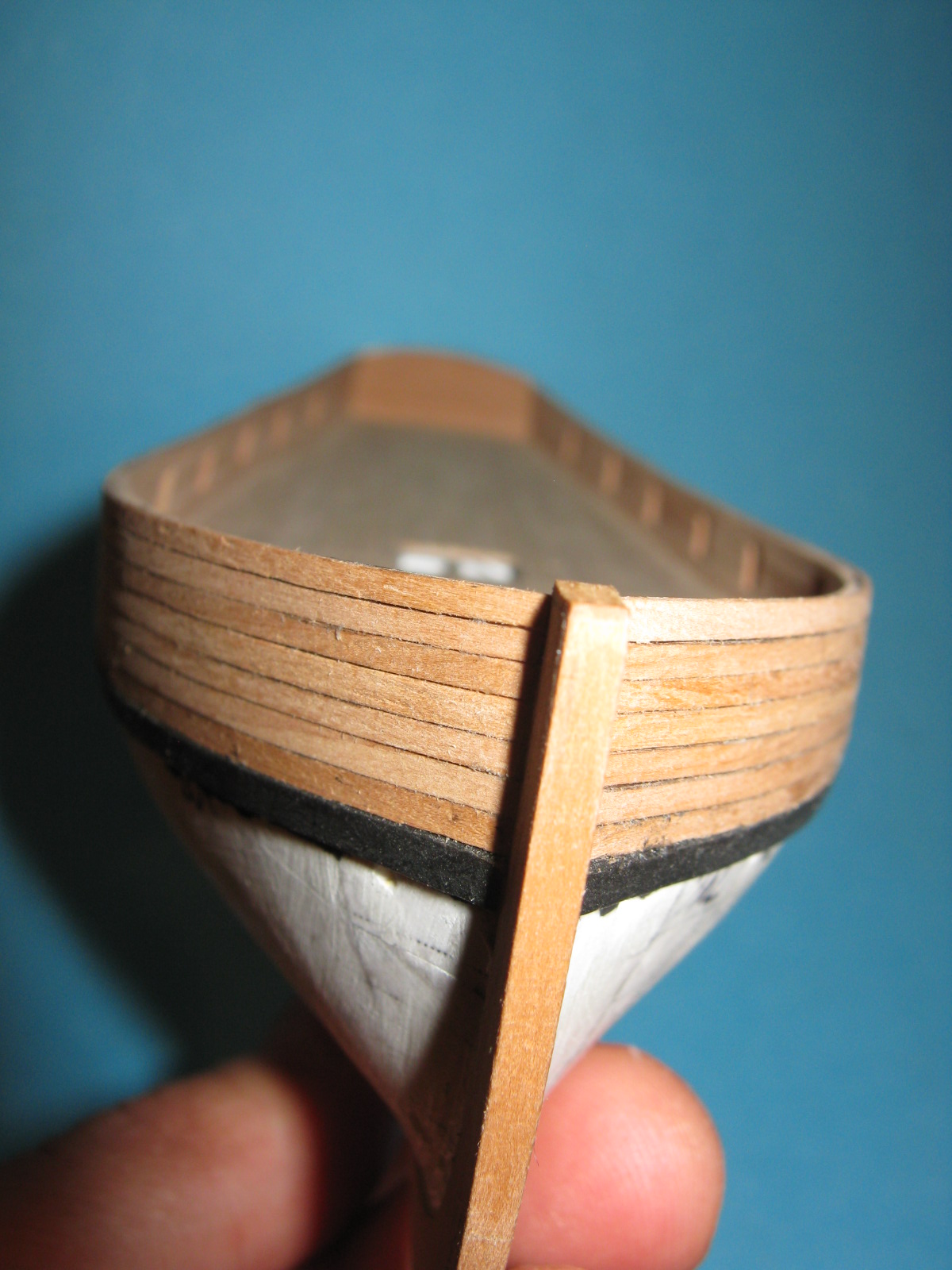 Zamontowałem odbojnicę z trochę grubszego forniru. Fornir gruszowy na poszyciu ma ok 0,5mm a ten na odbojnicy brzozowy ok 0,8mm i nie wiem czy odbojnica nie będzie zbyt płaska bo wystawać będzie tylko 0,3mm co w realu dawałoby 3cm. Z drugiej strony będzie odznaczała się czarną barwą więc moim zdaniem będzie widoczna i dobrze wyeksponowana. Odbojnica pomalowana czarnym humbrolem mat, podczas prac trochę się farba pościerała ale kosmetyka będzie na końcu. Zapomniałem w ogóle przetestować jakby sprawował się zwykły tusz kreślarski.