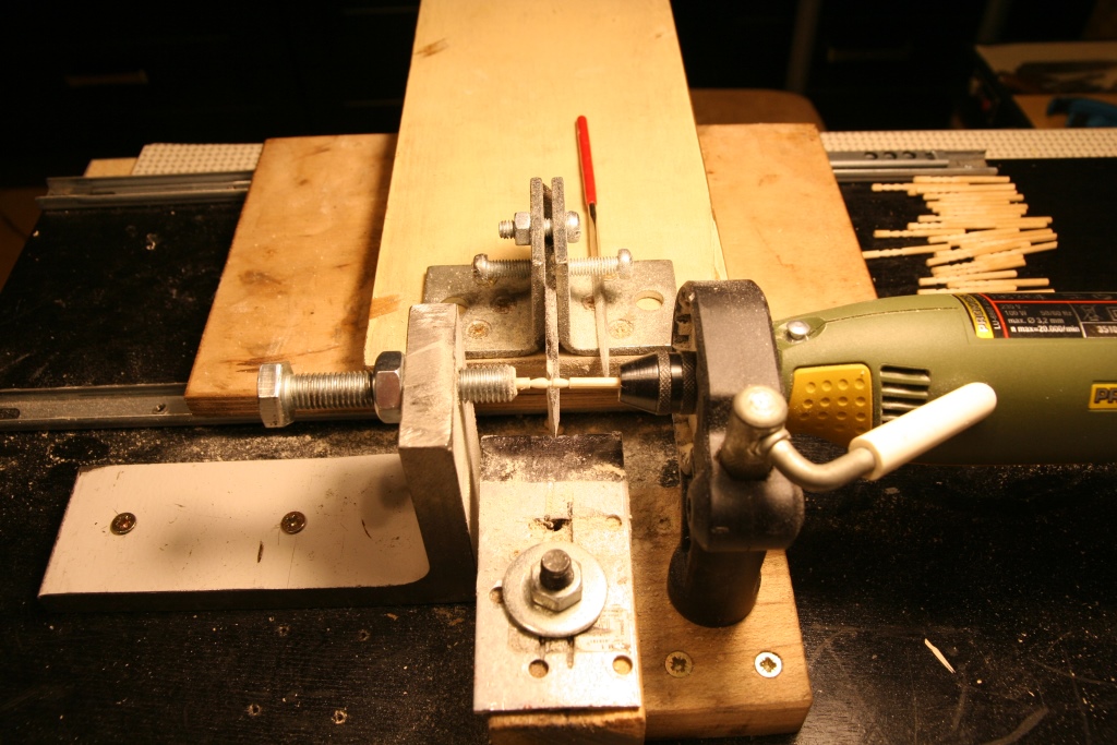 Zrealizowałem kolejny ważny krok - zrobiłem sobie mini tokarko-kopiarkę i wytoczyłem tralki do balkonu na rufie :D Tralki z patyka szaszłykowego, ostateczna dł to ok 13mm i średnica 2,5. Jak zwykle pomocne i niezastąpione okazały się relacje kolegów z forum. Tokareczka na bazie prowadnic do szuflad. Zastanawiałem się jak zrobić konik i kieł do tak małych średnic i ostatecznie wykonałem nawierconą śrubę. Rozwiązanie okazało się proste i skuteczne. Nóż od heblarki przy czym dolna część spełnia zarazem funkcję wodzika po wzorniku.