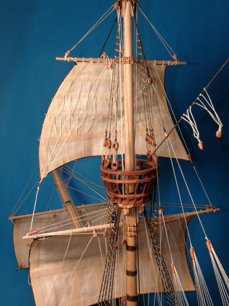 Do zawieszania żagli potrzebne było wykonanie więźby ruchomych rei. Koraliki zrobiłem z modeliny, kuleczki ok 2mm i otworek robiony igłą. W deseczkach wyfrezowałem zagłębienie i następnie pocięte z użyciem stołu krzyżowego. Większość olinowania przednich żagli na swoim miejscu.