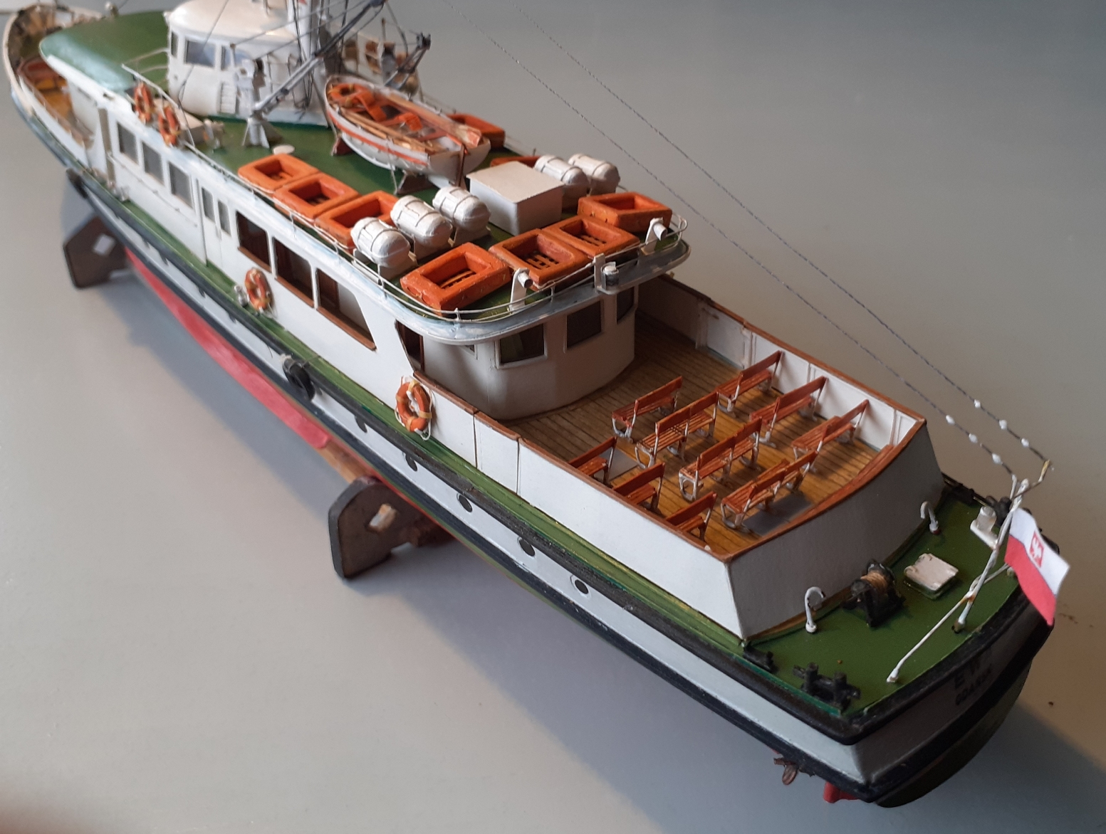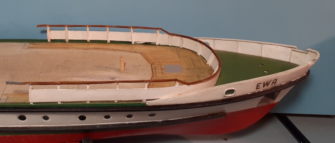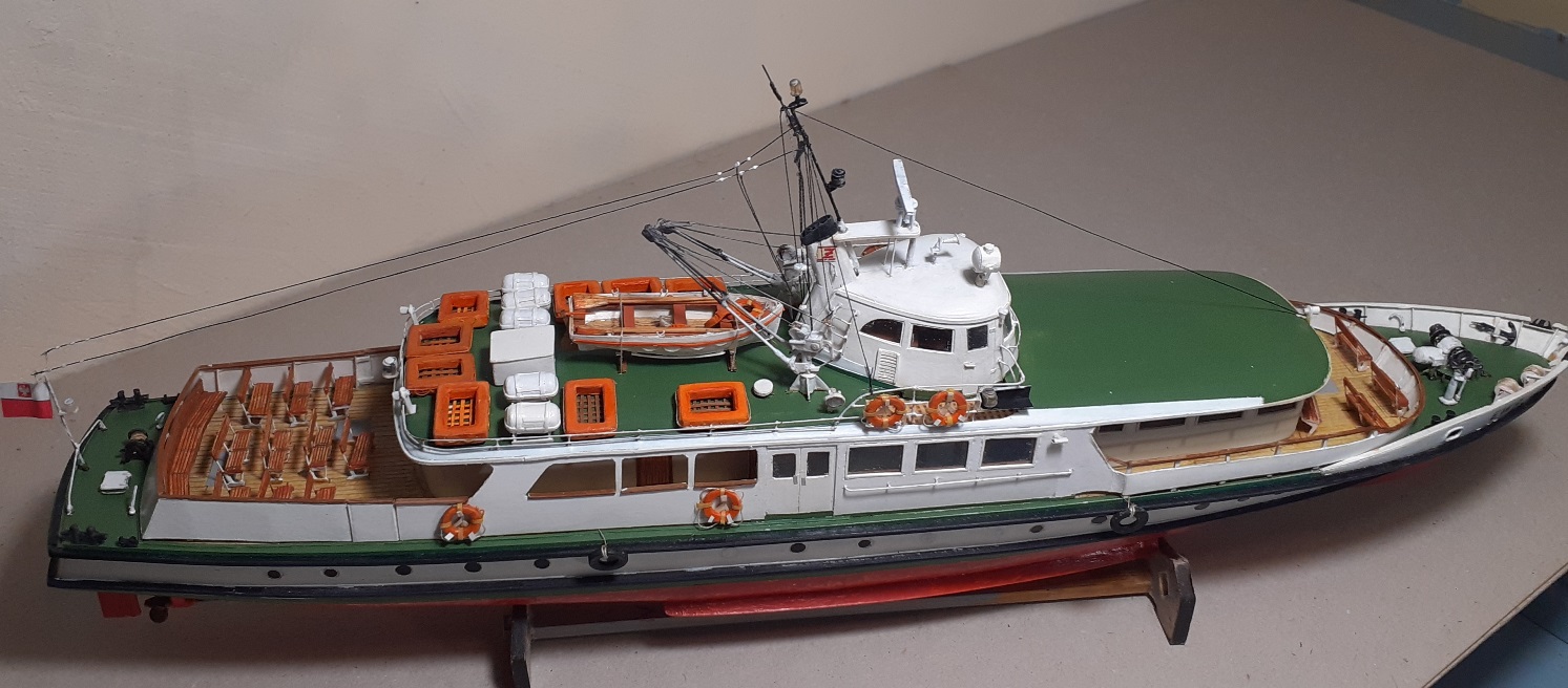 Witam, wykonałem stępkę przeciwpochyłową na podstawie zdjęcia jednostki na slipingu ,w końcu udało się wpasować i wkleić barierę przedniego pokładu widokowego ,pozdrawiam Marek
