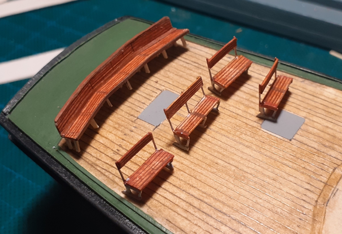 Witam,coś tam dodłubałem ,choć poprawniej by było ulepiłem jak mawia klasyk.Są siedziska,ławki na pokład spacerowy.W pierwszym poście pokazałem prawie sklejony model,,teraz to naprawiam, pokażę jak powstało wnętrza na pokładzie i sterówka, pozdrawiam Marek