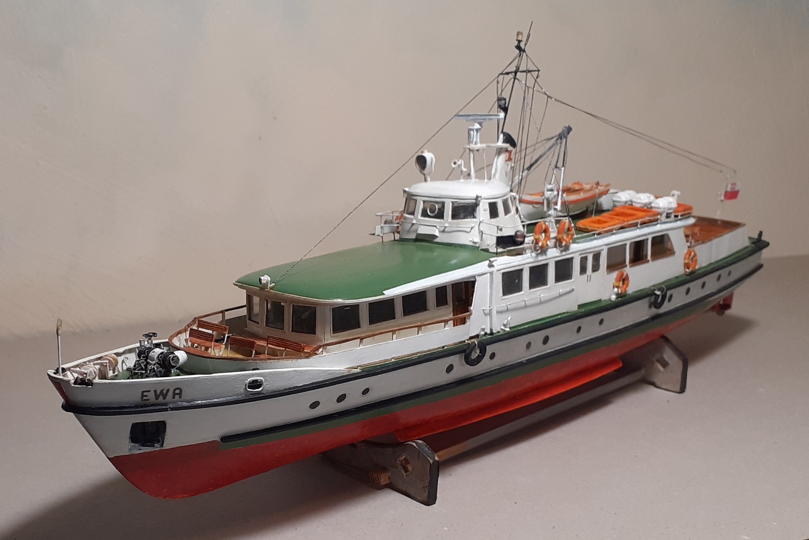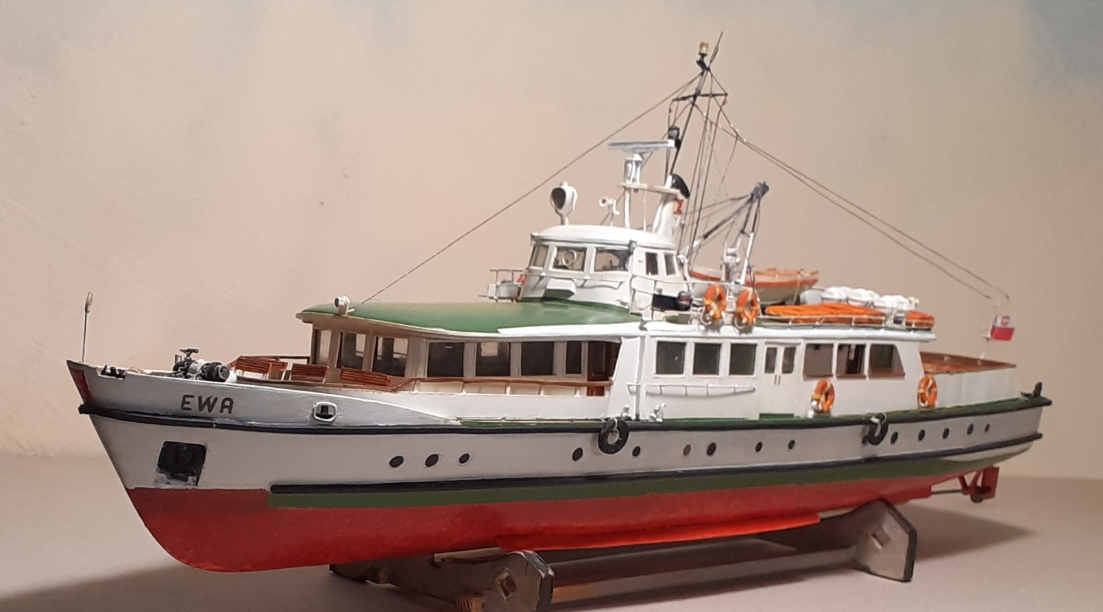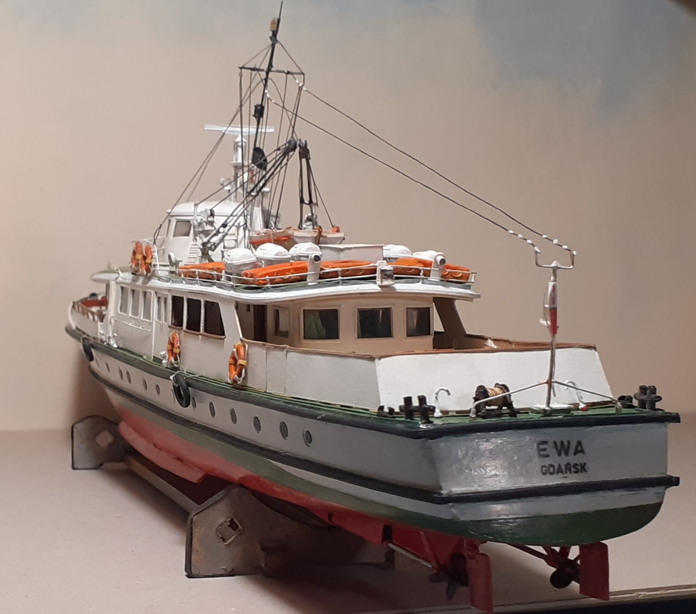Witam,sprzęt ratunkowy gotowy,przy okazji kół ratunkowych Garland otrzymał również swoje,zrezygnowałem z adaptacji szalupy,wykonałem drugą na kopytku.pozdrawiam Marek