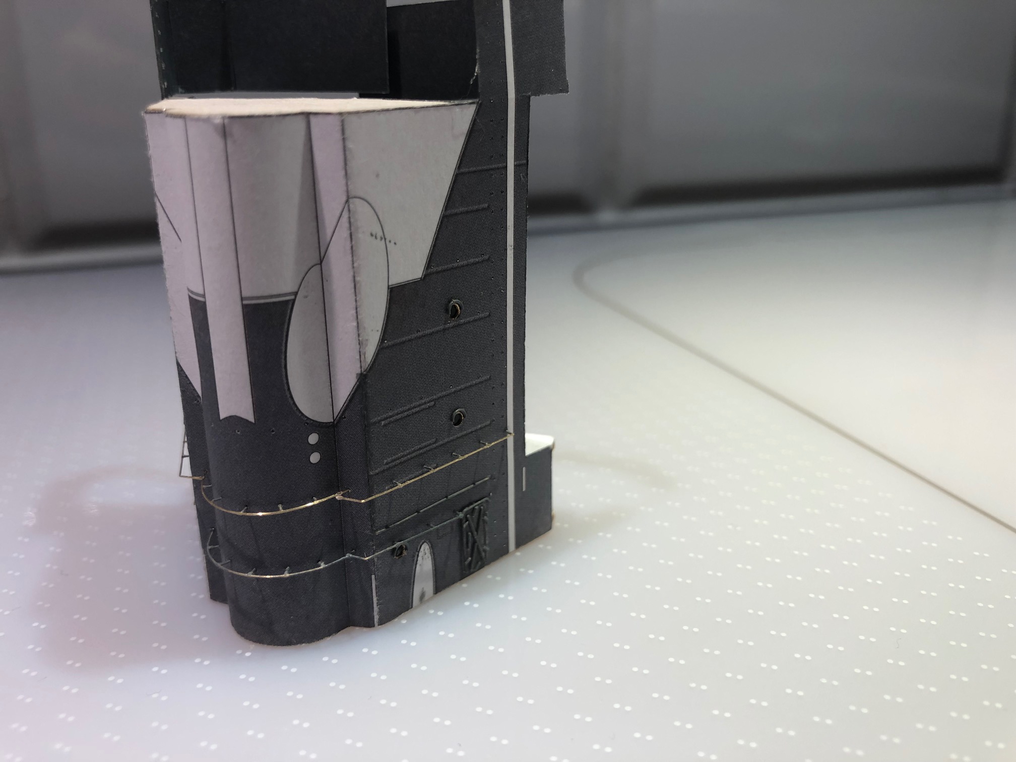Piotrek. Spróbuj przed zaginaniem krawędzi wycinać delikatny rowek w kształcie litery "V" po wewnętrznej stronie oklejki i nasączać go niewielką ilością BCG. To spowoduje, że karton będzie cieńszy, bardziej elastyczny i nie będzie tak się łamać podczas zaginania. Dodatkowo klej BCG usztywni krawędzie od wewnątrz i wzmocni strukturę elementu. Jak mnie kusi, aby rozgrzebać jakiegoś japońca