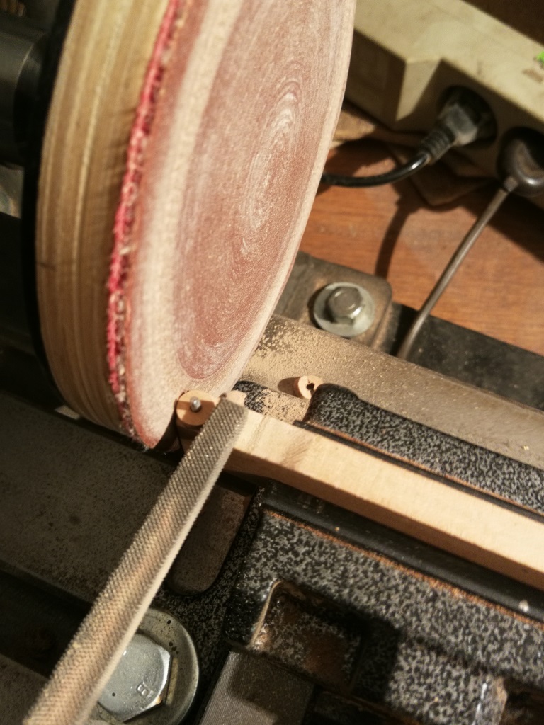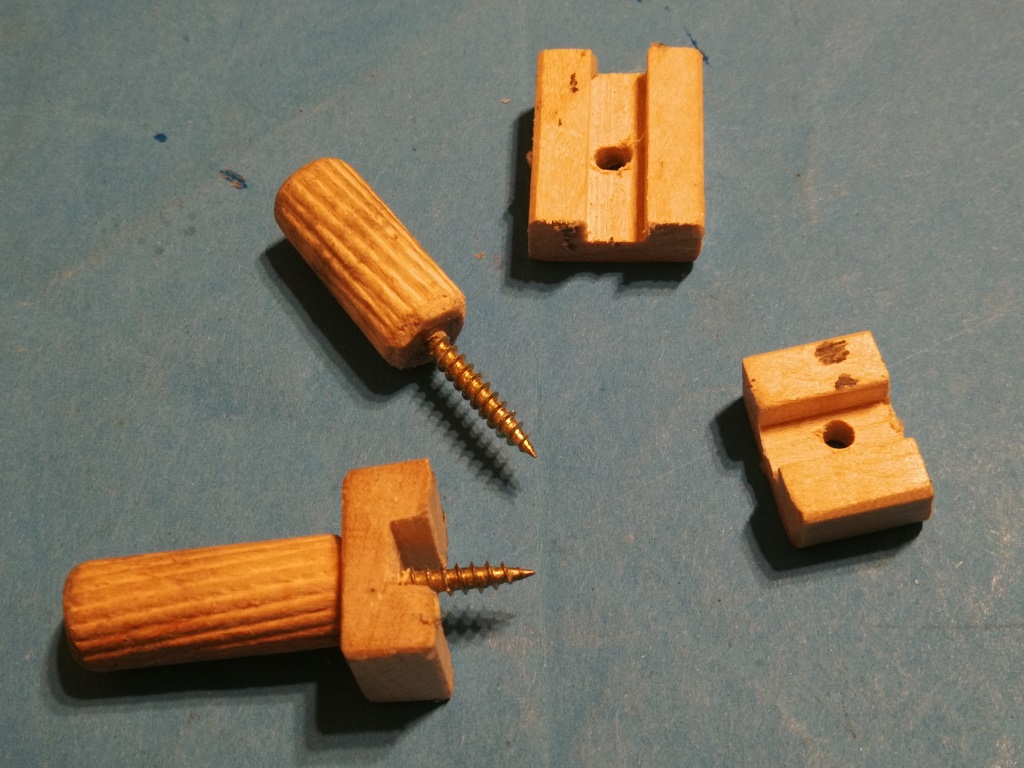 W zasadzie cała filozofia pokazana jest na zdjęciu. Ucięty wkręt wrkecony i wklejony na CA w kołek bukowy. Docisk frezowałem, ale kolejne zrobię z prostej listewki i tylko podkleję w razie potrzeby te stopki.