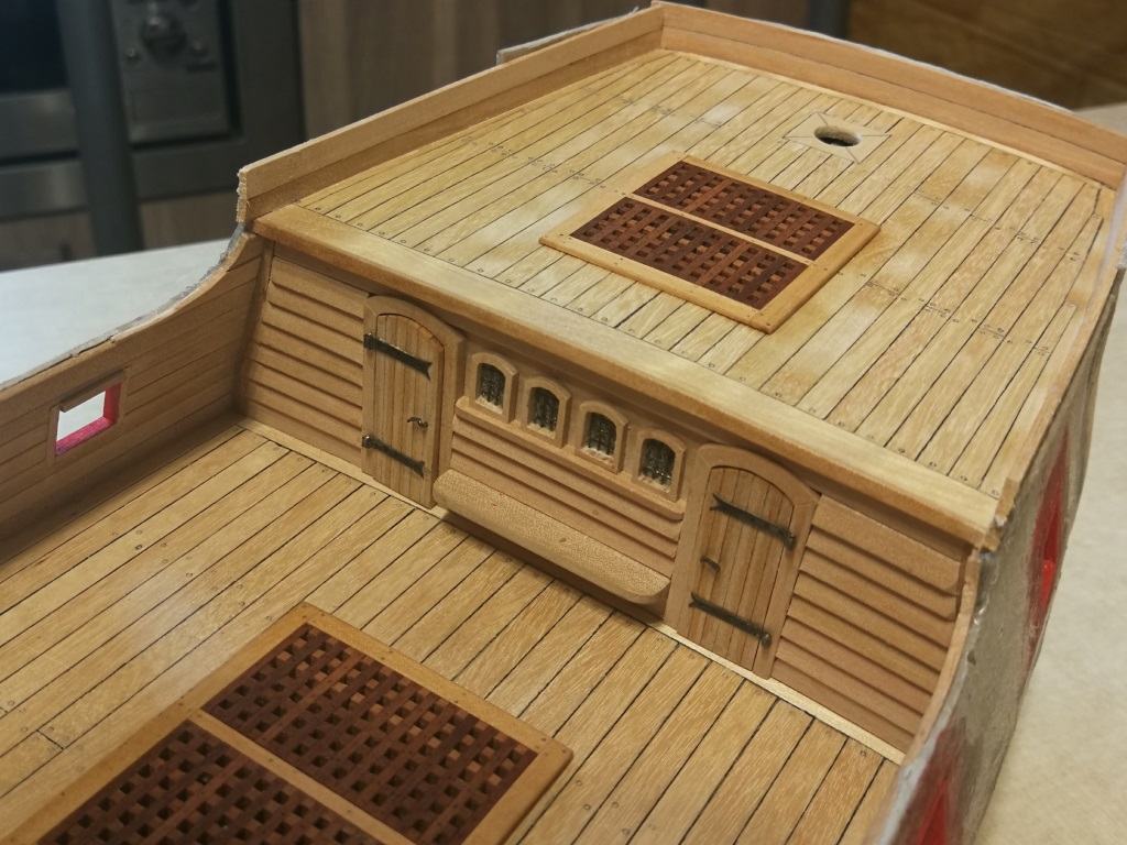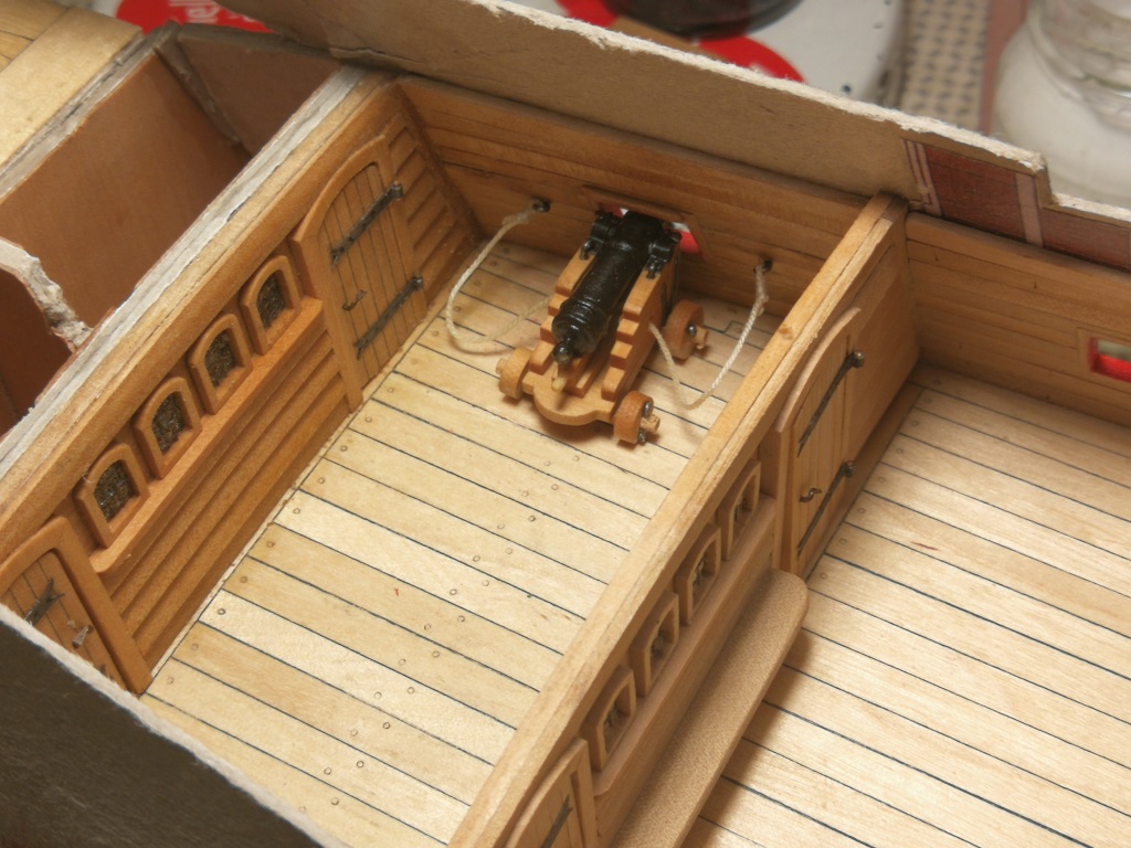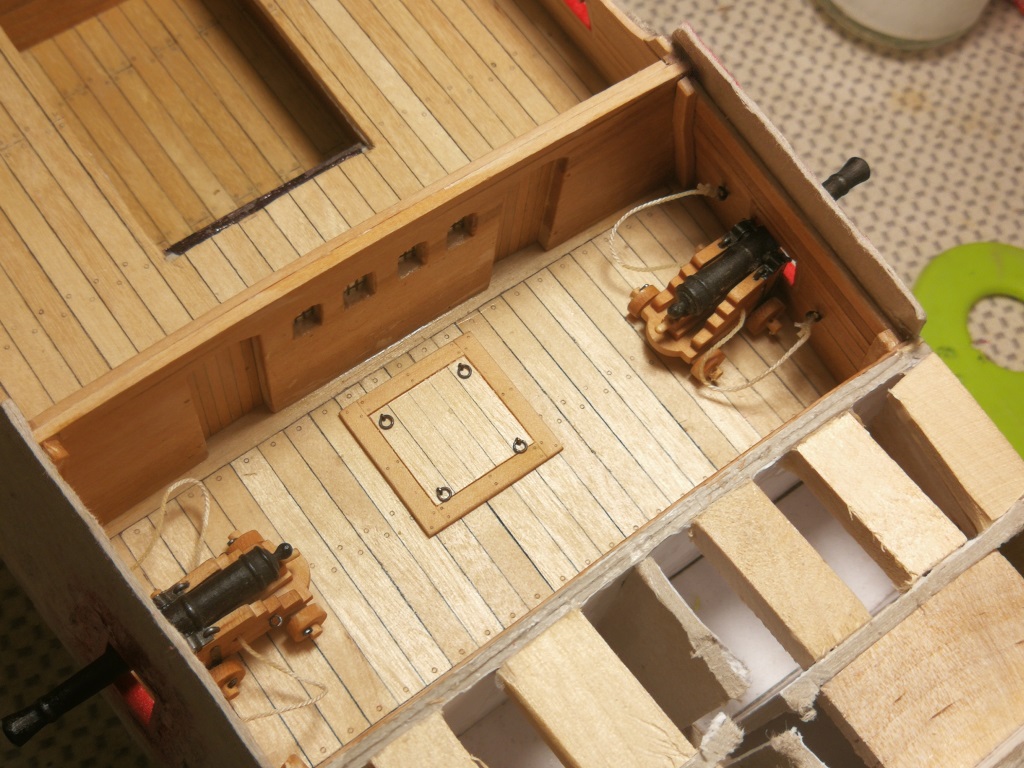 Armaty umieszczone pod pokładami i zamocowane na linach odrzutowych. Burty od wewnątrz wydeskowane. Gretingi na razie przymierzone "na sucho" jeszcze powędrują do pudełka.