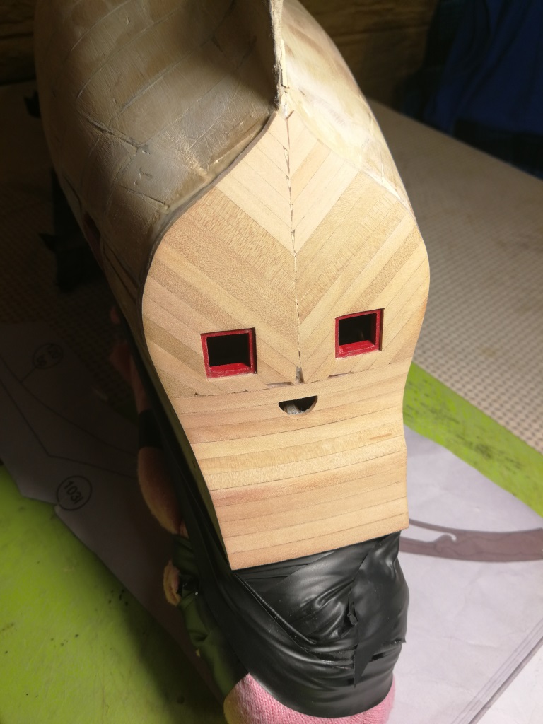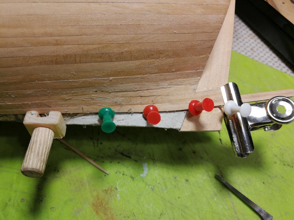 Pierwszy raz poszywam kadłub listewkami z gruszy ( wcześniej bawiłem się z formirem ) Zdecydowanie na plus łatwość wyginania listewek. Większe łuki części dziobowej kształtuję żelazkiem parowym - bardzo łatwo podoginać jak tylko potrzeba. Postanowiłem również, że zacznę od przyklejenia stewy dziobowej z wykonanym rowkiem, tak aby łatwo spasować listwy na dziobie. Rowek nie jest frezowany, wkleiłem od wewnątrz węższą listwę. Listwy dociskam wykonanymi wcześniej przydaśkami jak na zdj. Bardzo pomocne okazuje się wcześniejsze wypełnienie przestrzeni pomiędzy wręgami drewnem. Jest do czego porządnie dokręcić docisk.