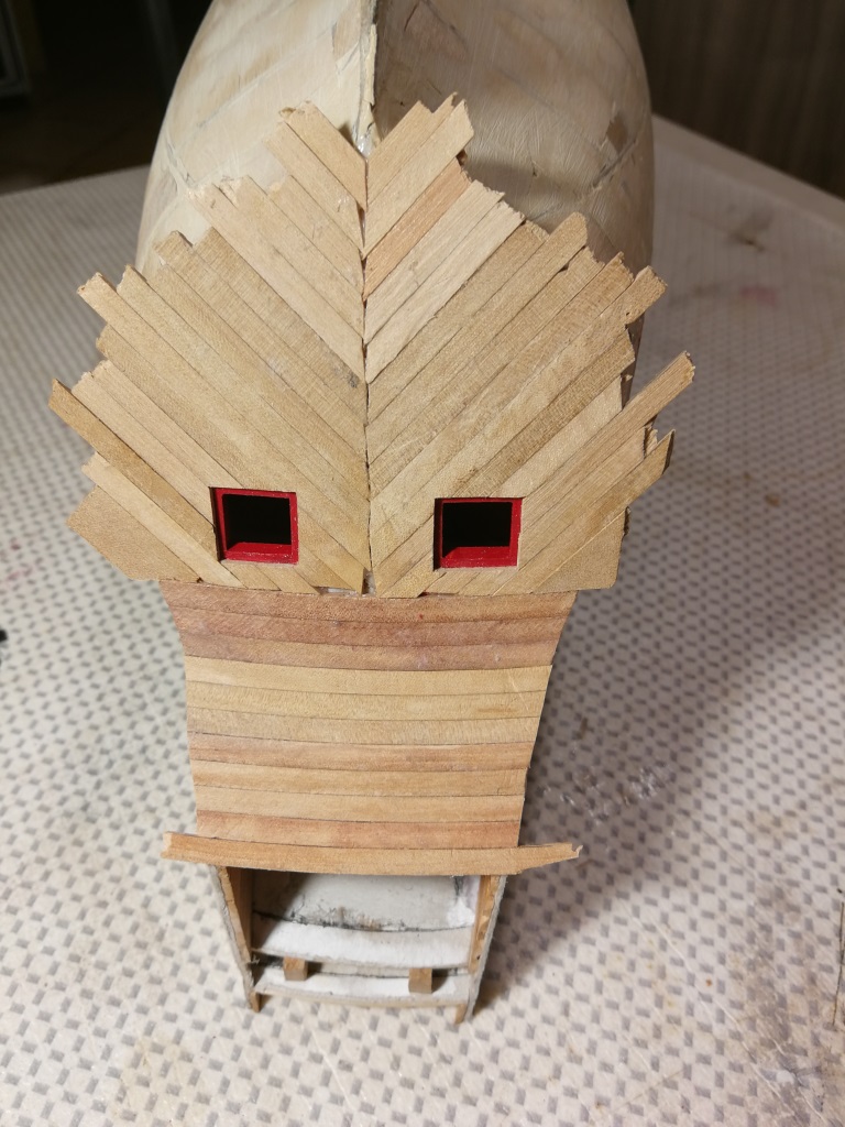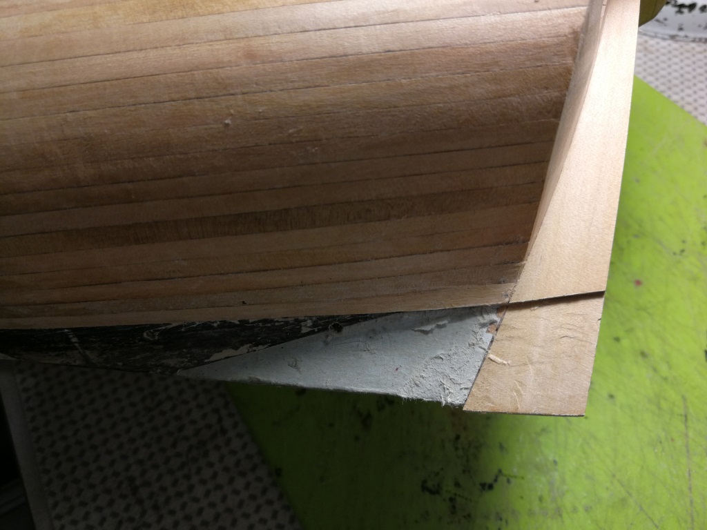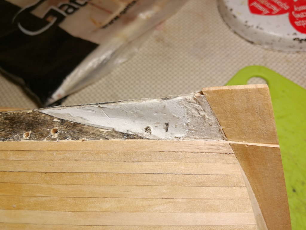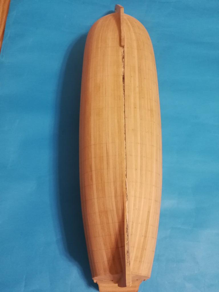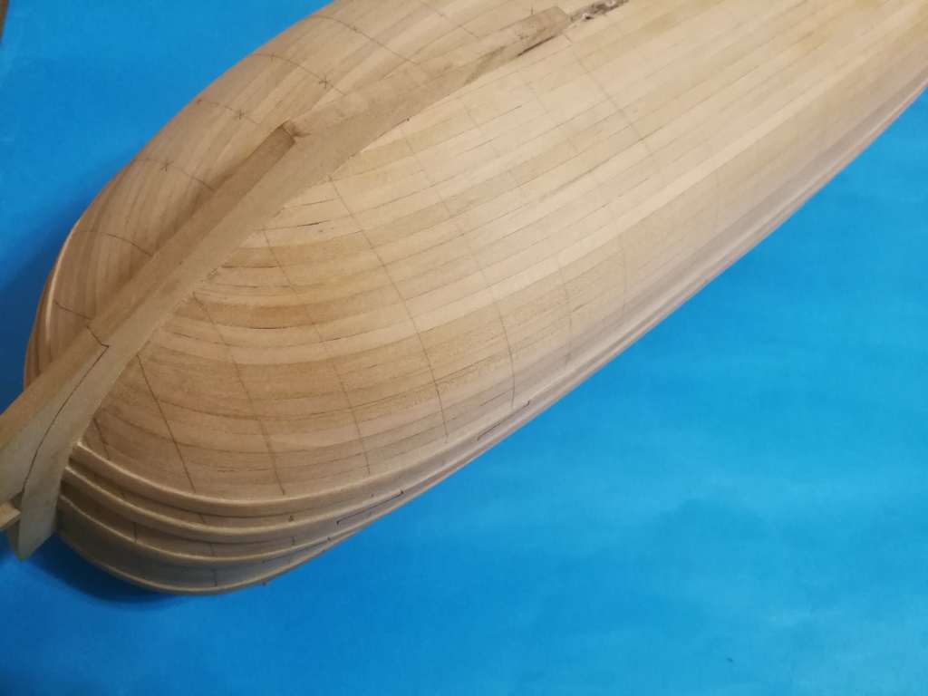 Poszywanie kadłuba powoli dobiega do końca. Ostatnie kilka planek biegnie po stewie rufowej, dlatego wkleiłem ją przed zakończeniem poszywania. W miejscu gdzie biegną planki oczywiście musiała zostać pocieniona.