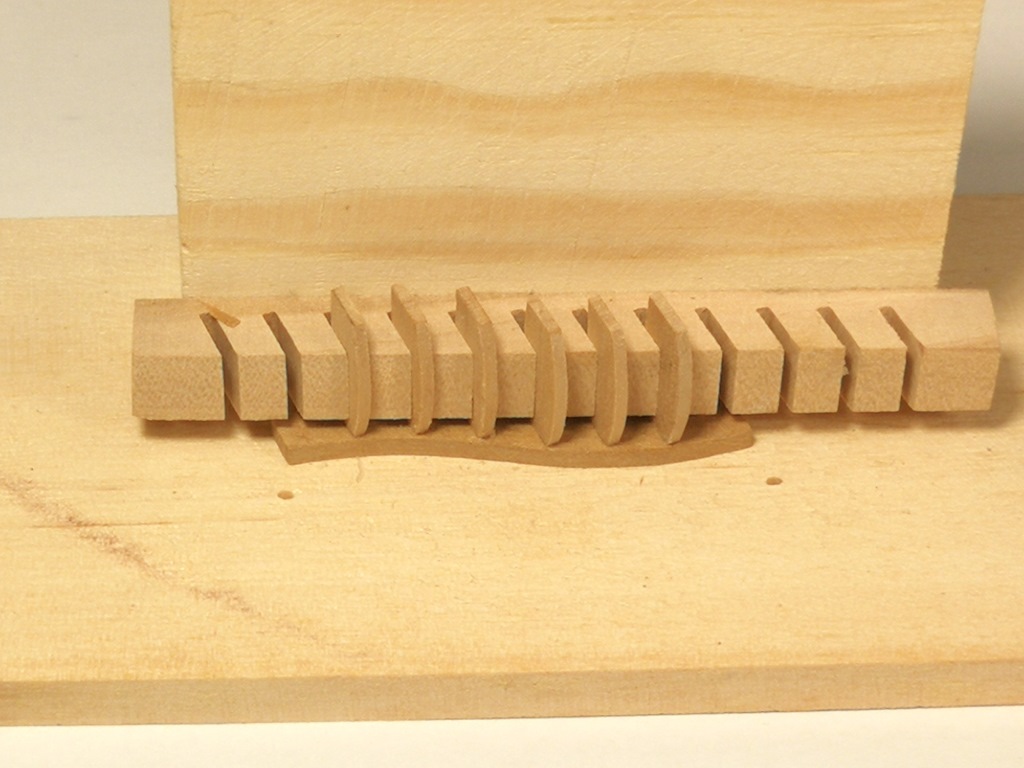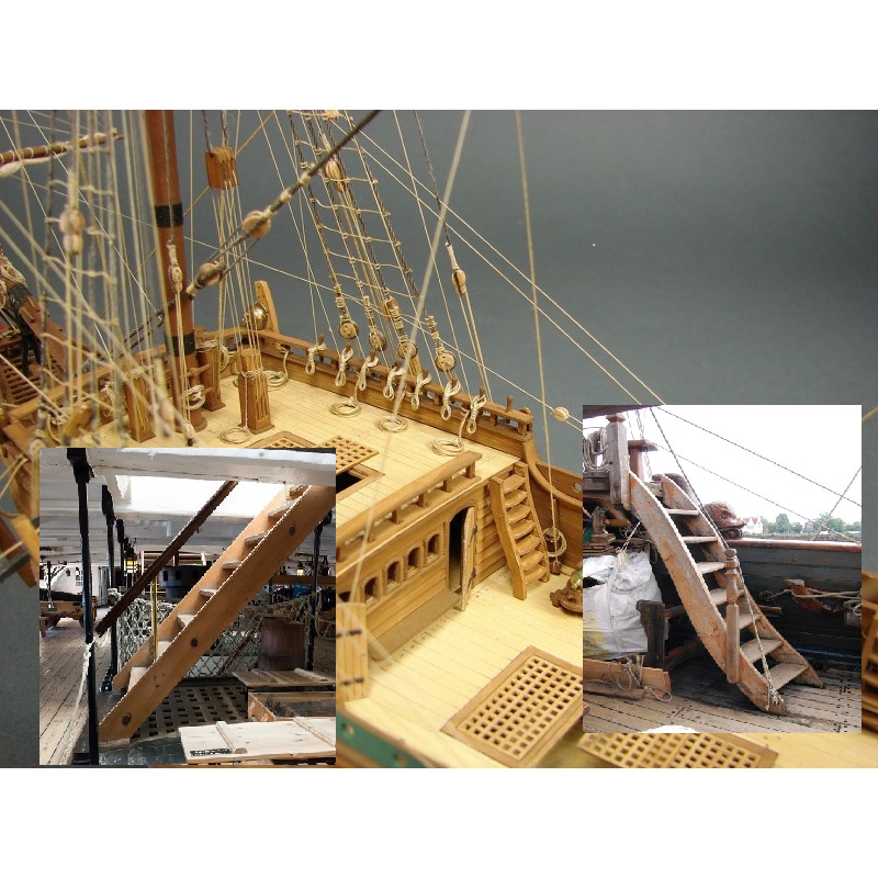 Do wykonania trapów wykonałem sobie wcześniej przyrząd jak na zdjęciu ( nacięcia zrobione na stole krzyżowym ). Przyznam, że miałem dylemat czy robić nacięcia przez całość w wangach i montować w nie schodnie czy skleić bez widocznego połączenia - tak jak ostatecznie to zrobiłem. Czy oba sposoby były używane w tym okresie? Ja nie wiem. Na zdjęciu jest to co pokazuje instrukcja obok zdjęcie z jakieś repliki gdzie nie widać nacięcia przez całość ( na dodatek krzywizny biegną w drugą stronę ) i też wklejone zdj z Victory – to już późniejszy okres ale też schodnie montowane bardziej na współczesny sposób. Mam nadzieję że nie popełniłem jakieś profanacji