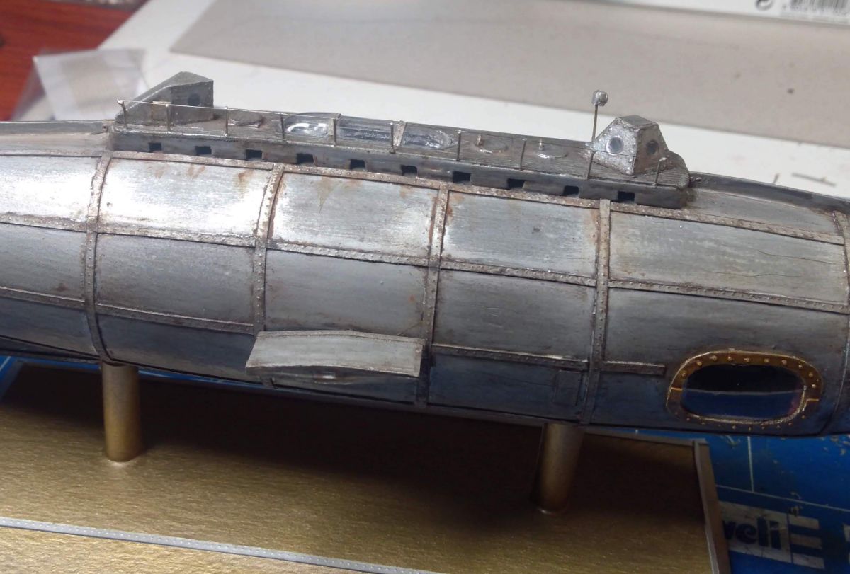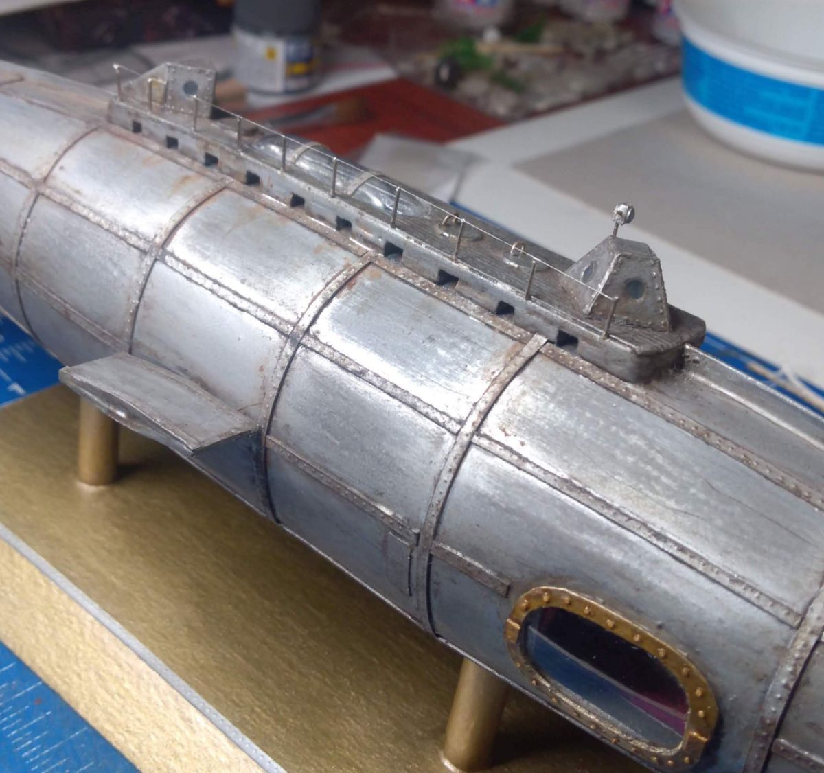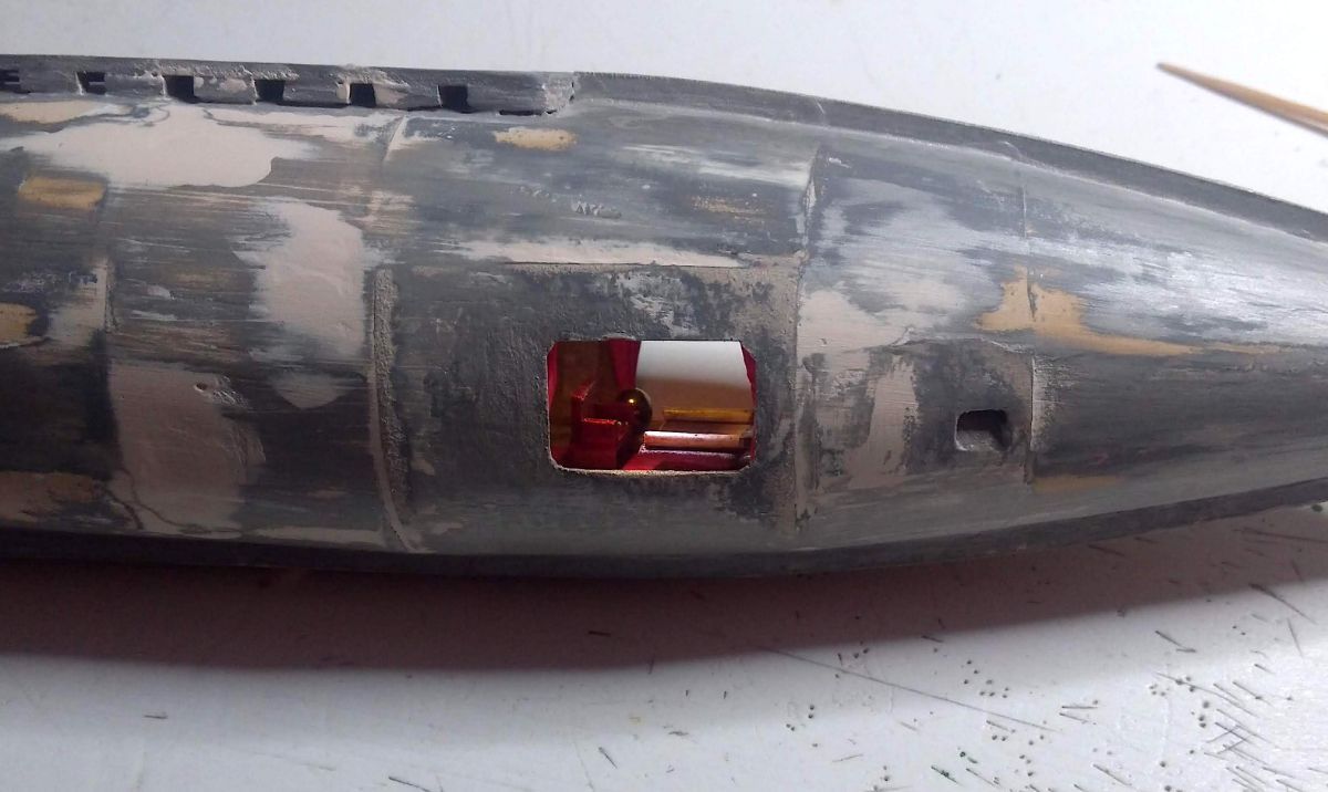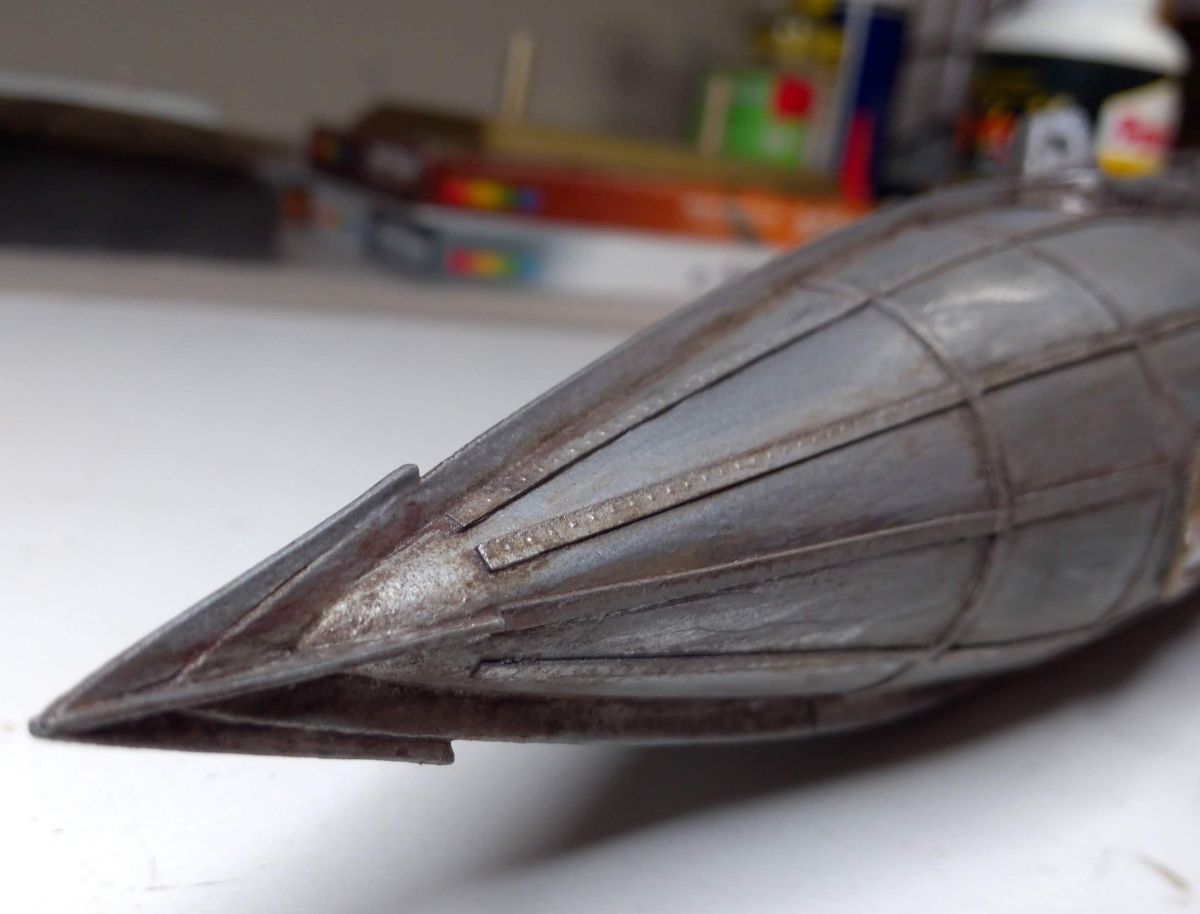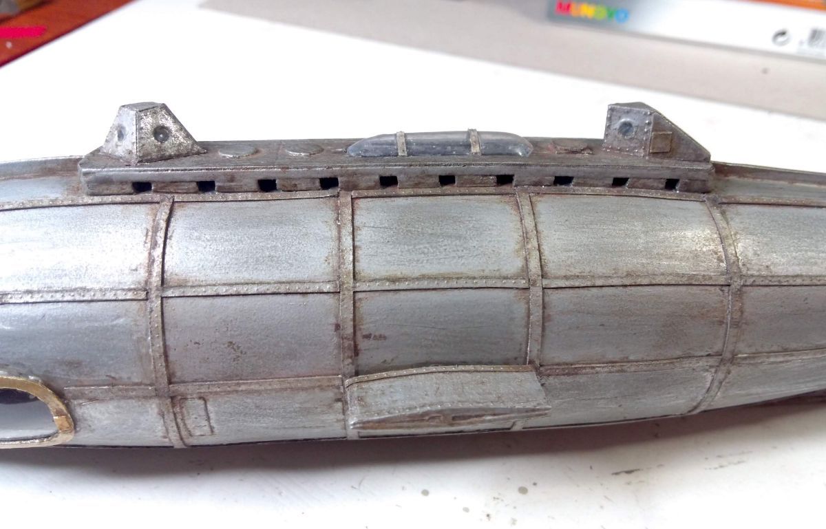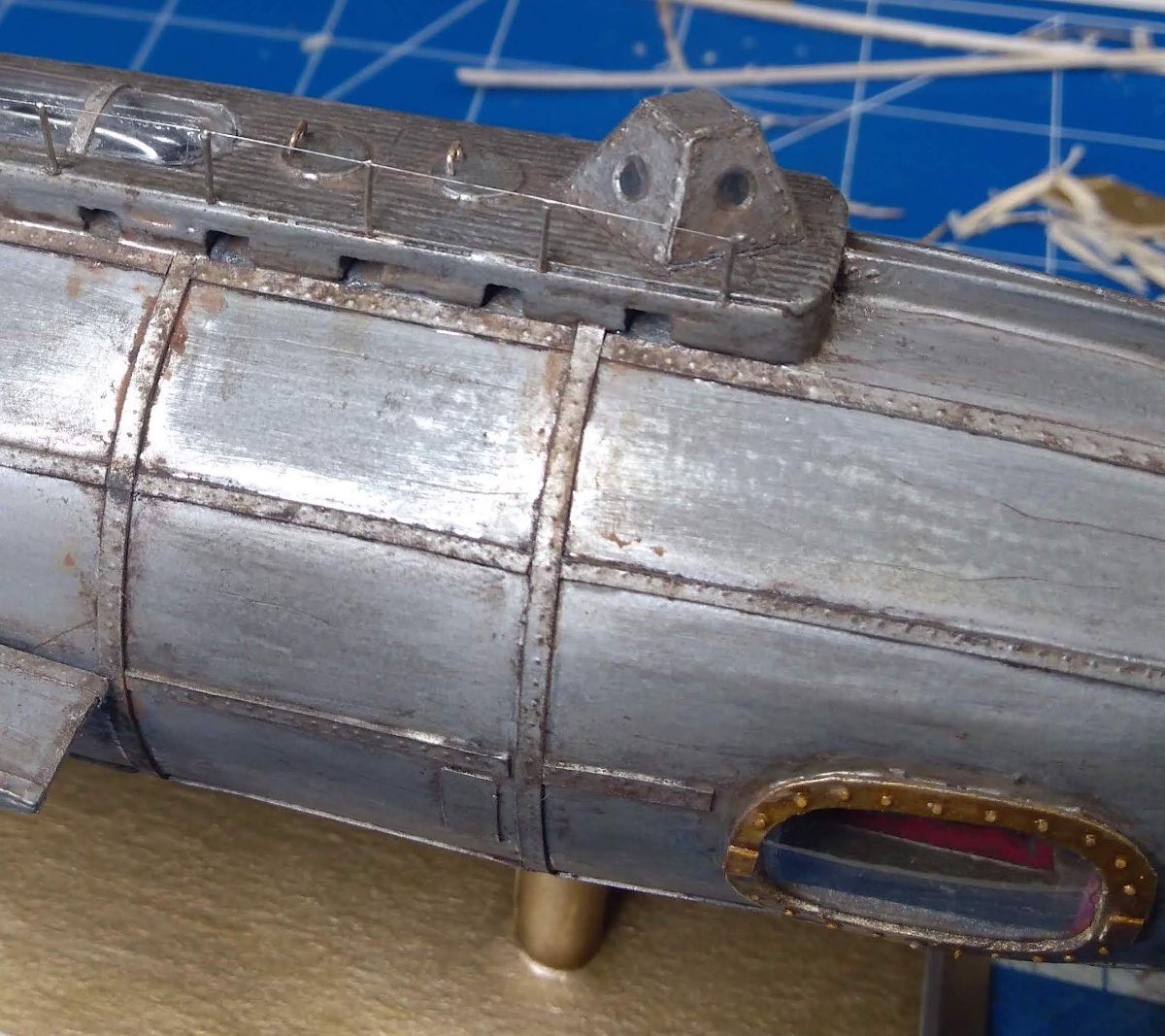 A teraz czas na dodanie śladów eksploatacyjnych: brudzenia, otarć i rdzy. Dodałem więcej na pokładzie, zacząłem robić podstawkę. Stery głębokości i kierunku są ruchome. Zrobiłem relingi.