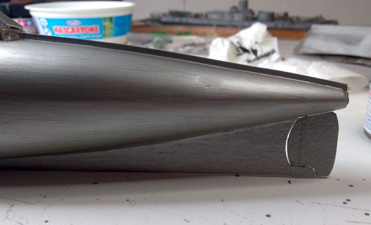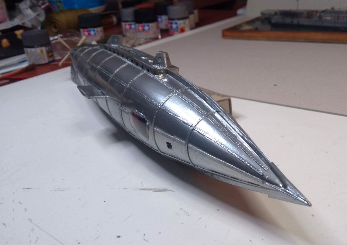 Jedziemy dalej z tematem, dorobiłem wzmocnienia poszycia z nitowaniami i prysnąłem lakierem srebrnym, ale nie podobało mi się to zbytnio, był jak z 'fabryki'. Dodałem śrubę, elementy na dziobie i pokład ze sterówką.