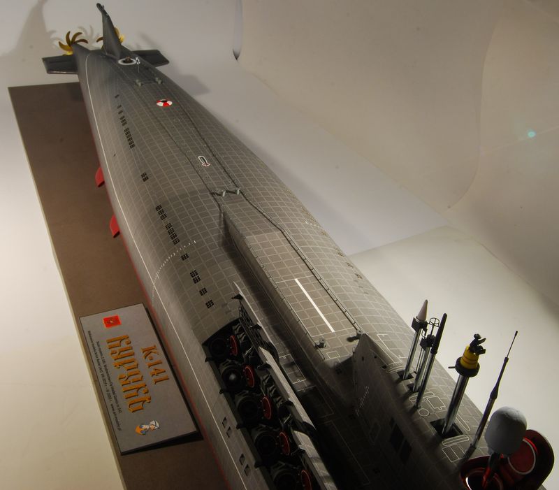 Przepiękny model i mistrzowskie wykonanie, przy tej wielkości modelu nienaganne kształtowanie kartonu, jestem pod wielkim wrażeniem. Bardzo lubię podwodniaki. Przy tej wielkości nie widać żadnych wgnieceń, odciśniętych wręg. Sam Kursk strzela salwą z prawej burty, pięknie, gratulacje!