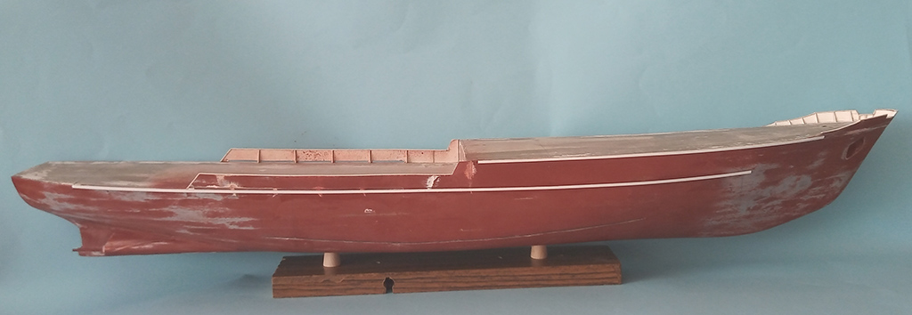 Udało się poszyć cały kadłub . Pomalowałem wstępnie caponem i po przeszlifowaniu zaszpachlowałem. Jak wyschła szpachlówka szlifowanie a następnie pryśnięcie podkładem . Kadłub schnie to zabrałem się za lepienie nadbudówki.