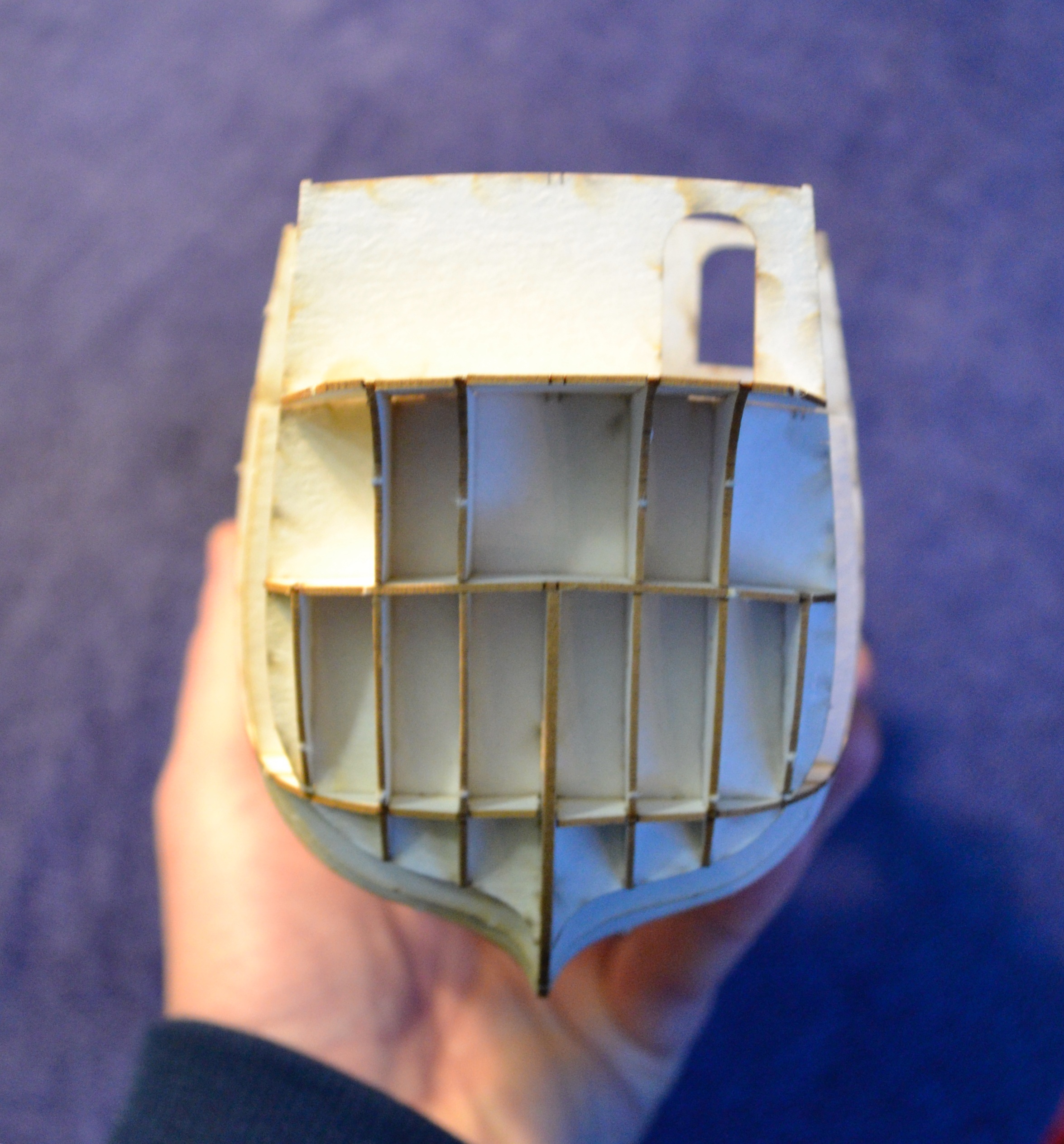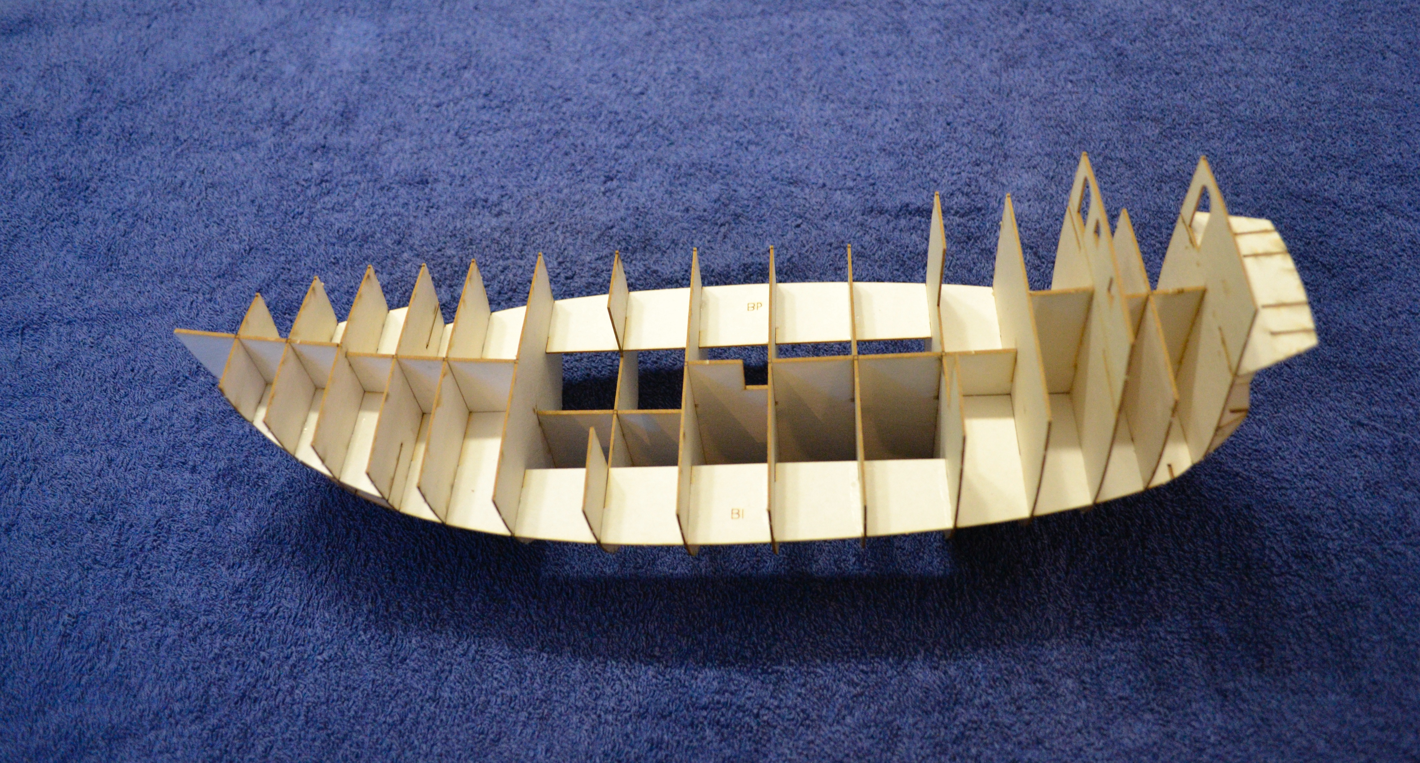 Mam już zrobiony szkielet i położone 2 poszycia (z trzech). Sam szkielet z racji tego, że jest cięty laserowo składa się bardzo prosto: Ponieważ karton jest bardzo gruby, szkielet też wydaje się przypominać statek a nie śmigło (podobnie jak przy Kodze bremeńskiej, gdzie szkielet tak samo się ładnie składał): Zatem nie będę się nad nim rozwodził.