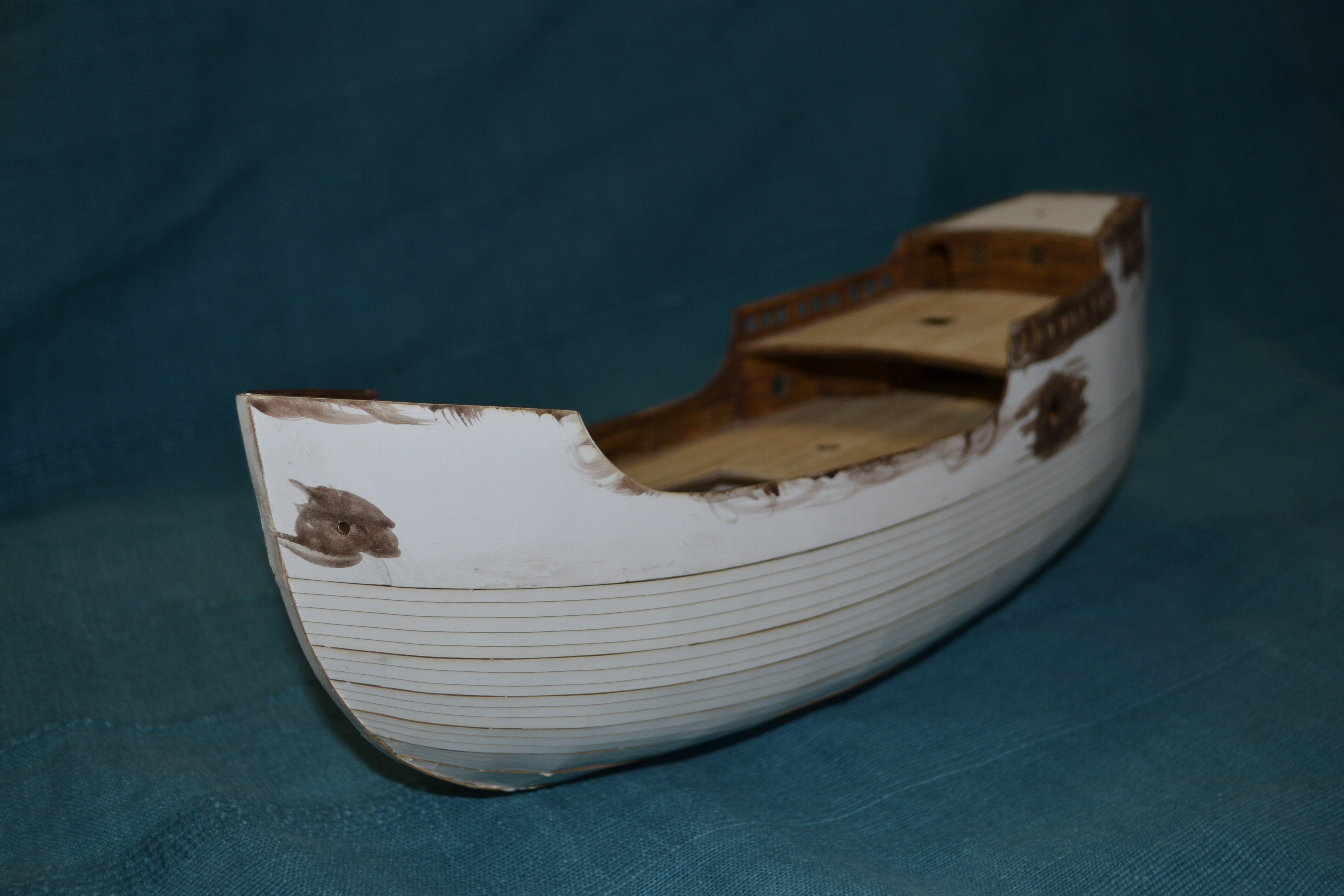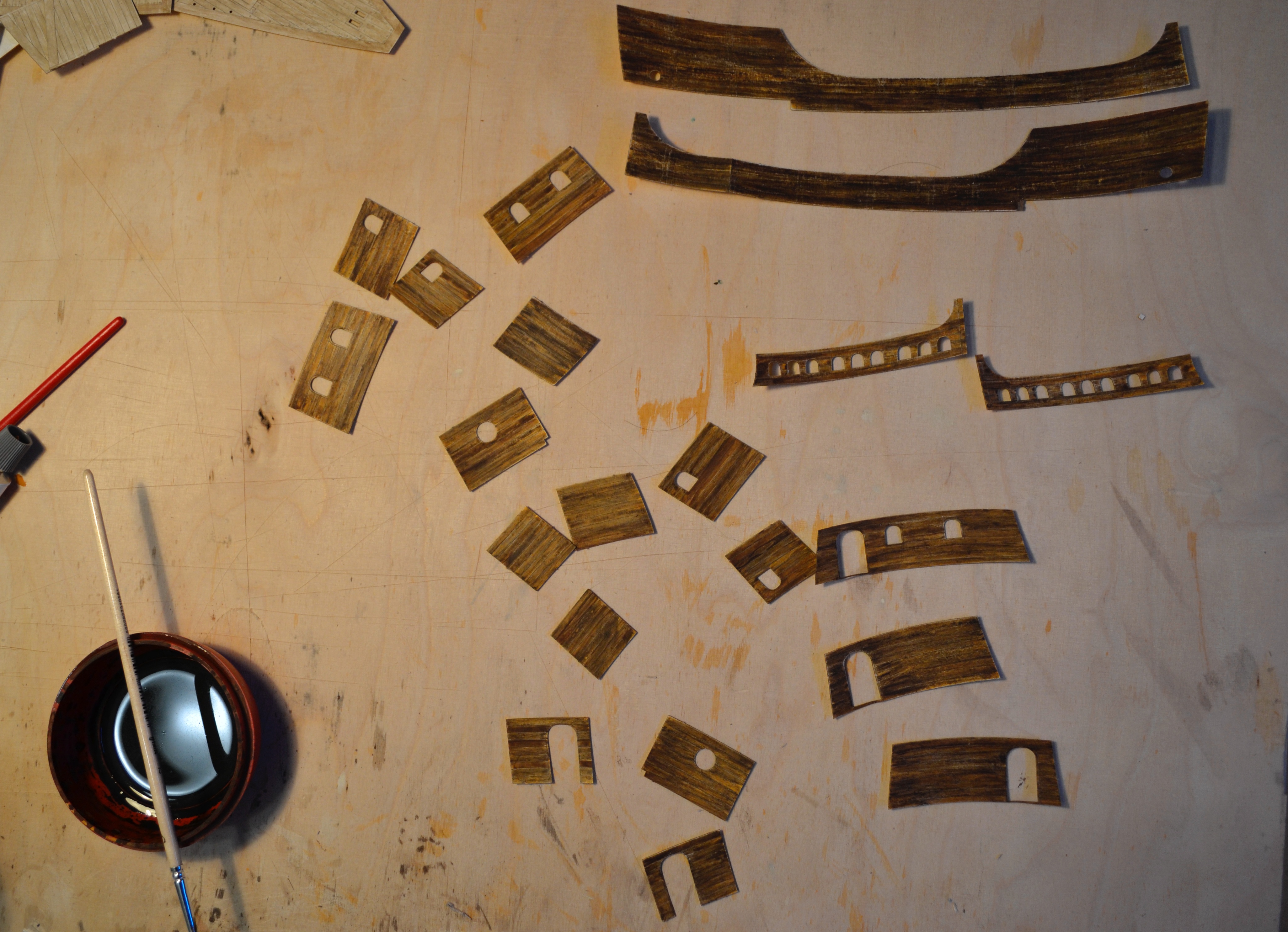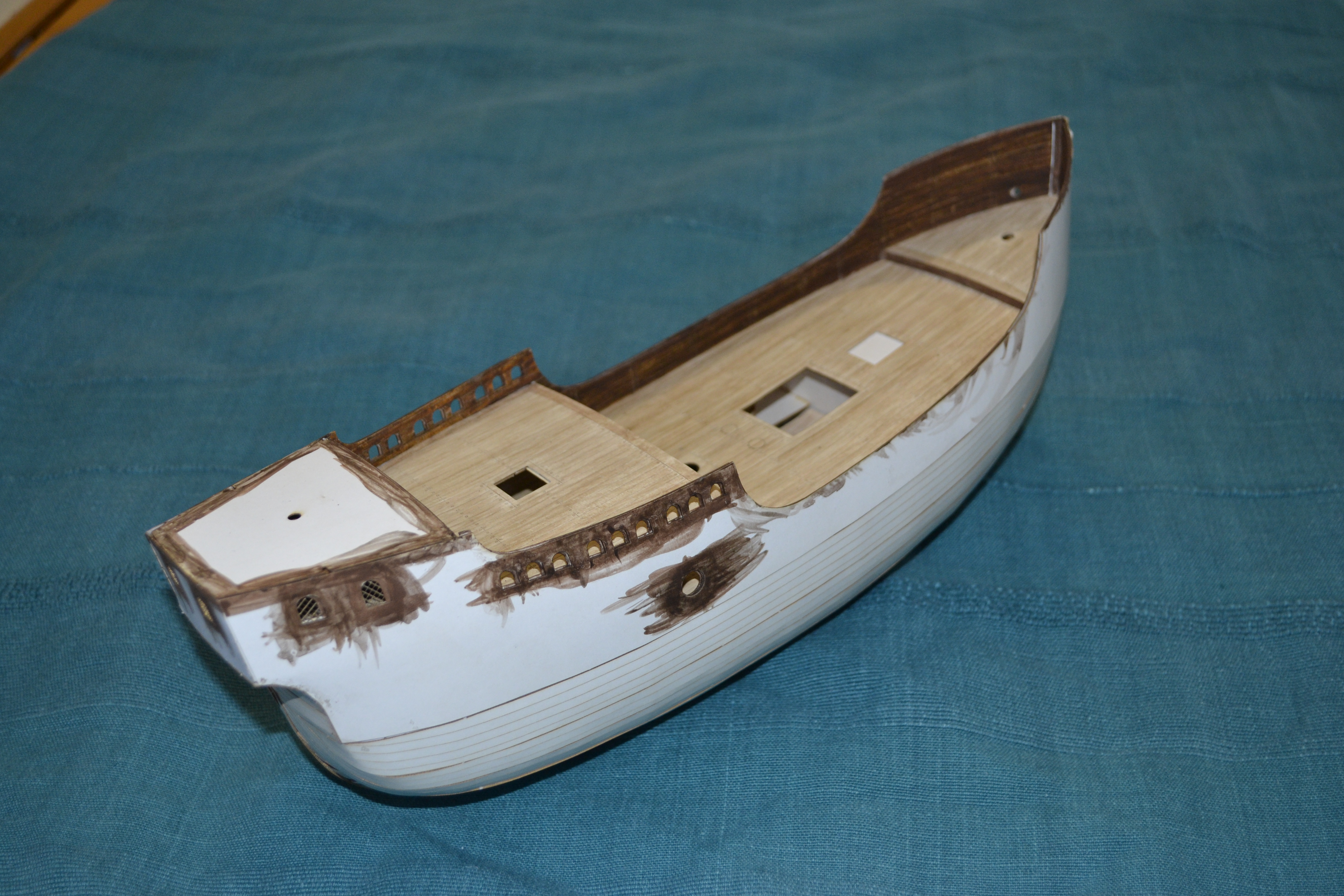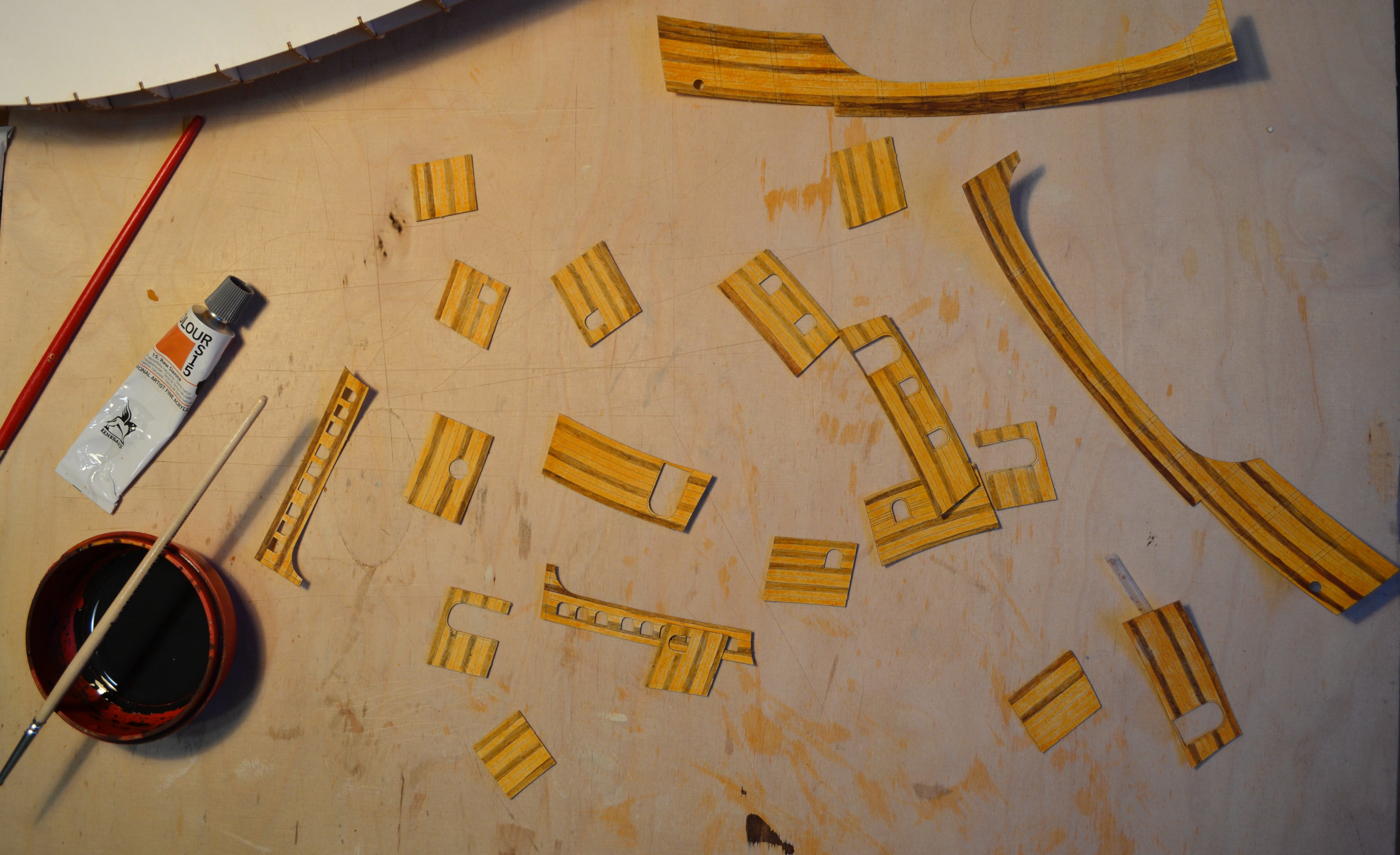 Elementem, który tu zawsze sprawia większą trudność to jest malowanie elementów, tu cały statek w zasadzie trzeba pomalować samemu. Zastosowałem technikę taką samą jak w przypadku kogi bremeńskiej, tj. każdą deseczkę maluję oddzielnie. Oto etapy prac przy malowaniu: No i muszę przyznać, że niestety jak dla mnie wychodzi to nieco zbyt pstrokato. Metoda sprawdziła się przy malowaniu pokładów: Na szczęście elementy, które pomalowałem w większości są elementami wewnętrznymi. Przy malowaniu kadłuba nie będę już malować każdej deseczki oddzielnie, a najpierw pomaluję cały kadłub w całości a potem dopiero pozaznaczam tylko niektóre deski poszycia (a nie każdą). Dzięki czemu mam nadzieję że uzyskam odpowiednią imitacje drewna.