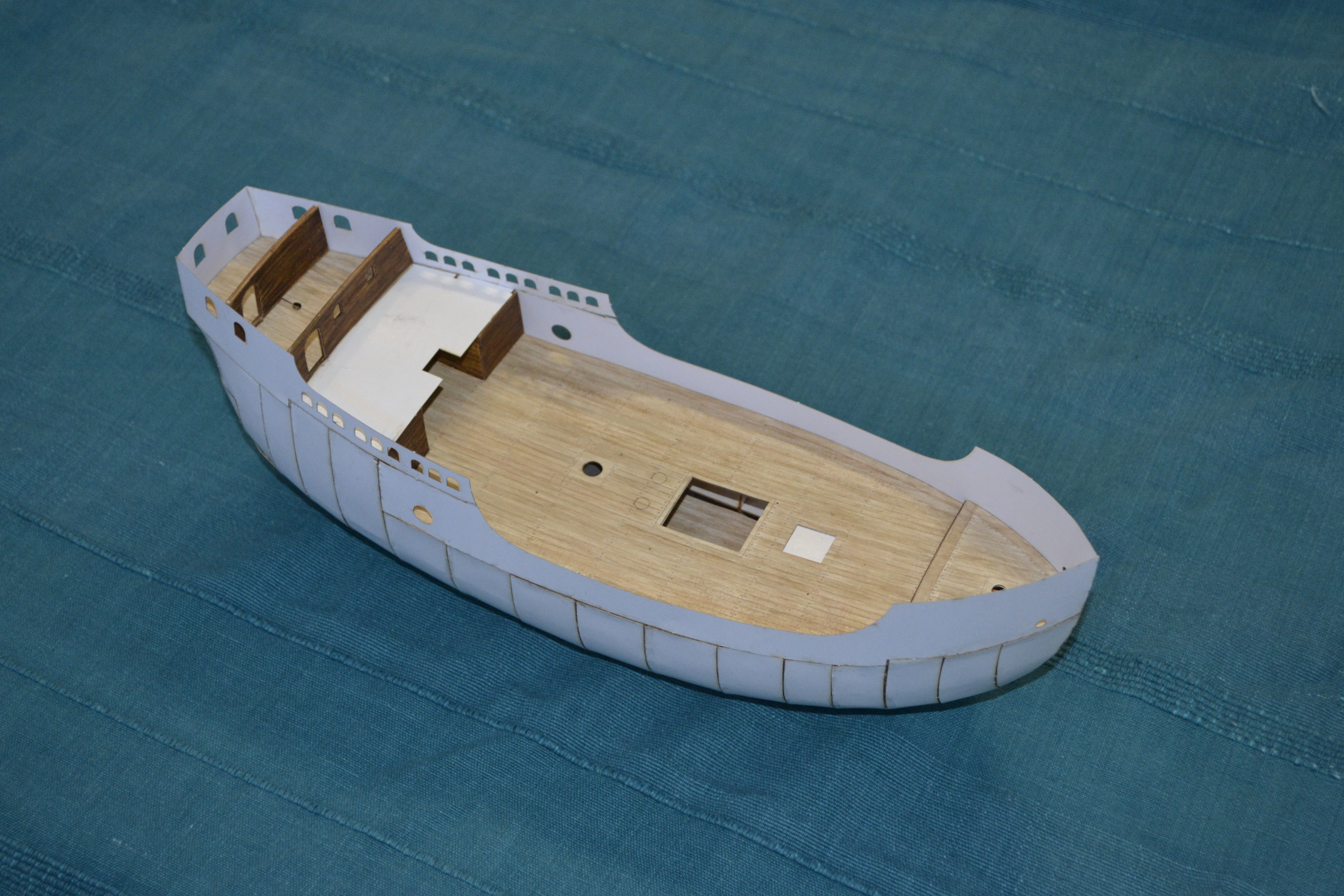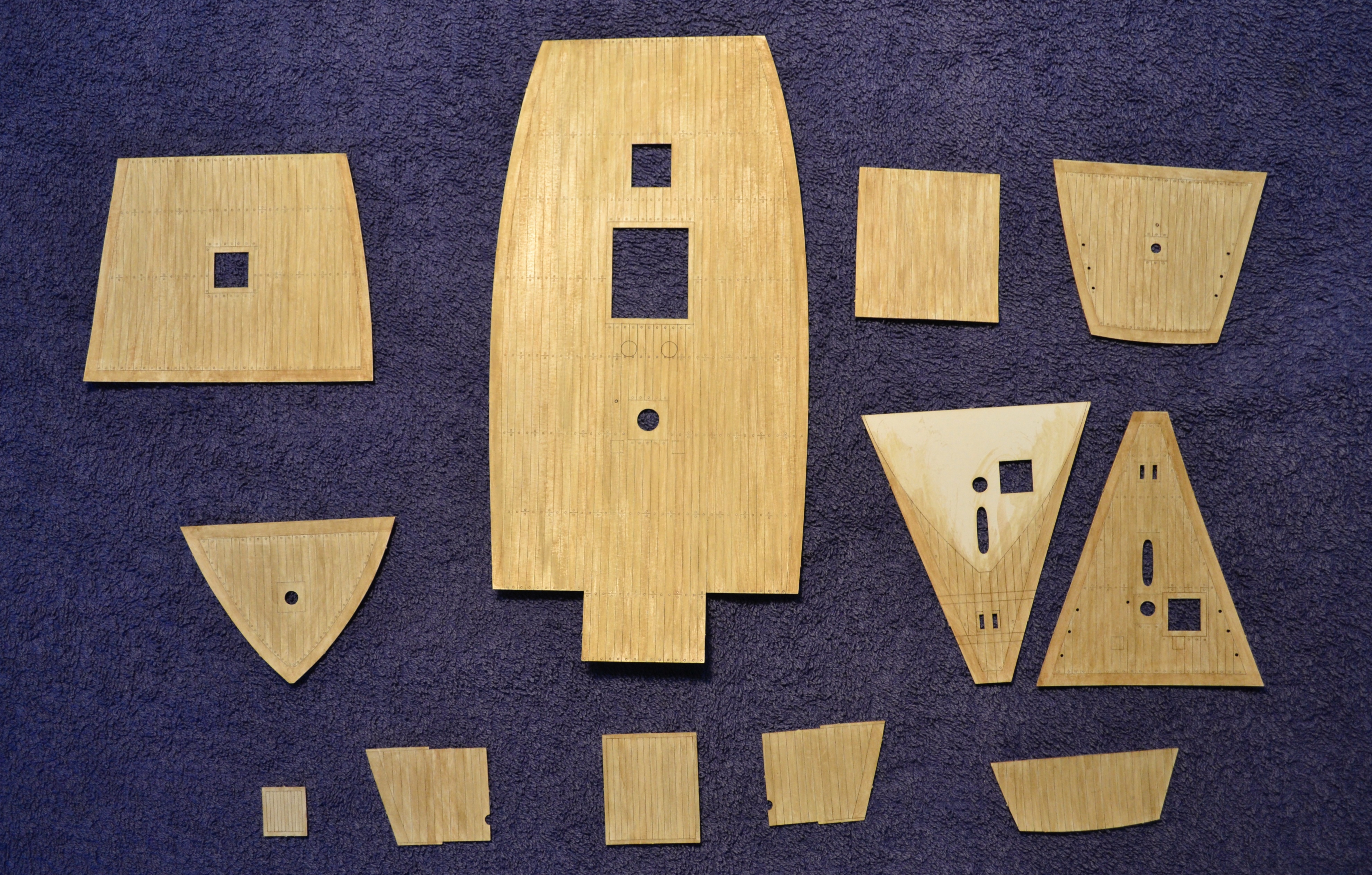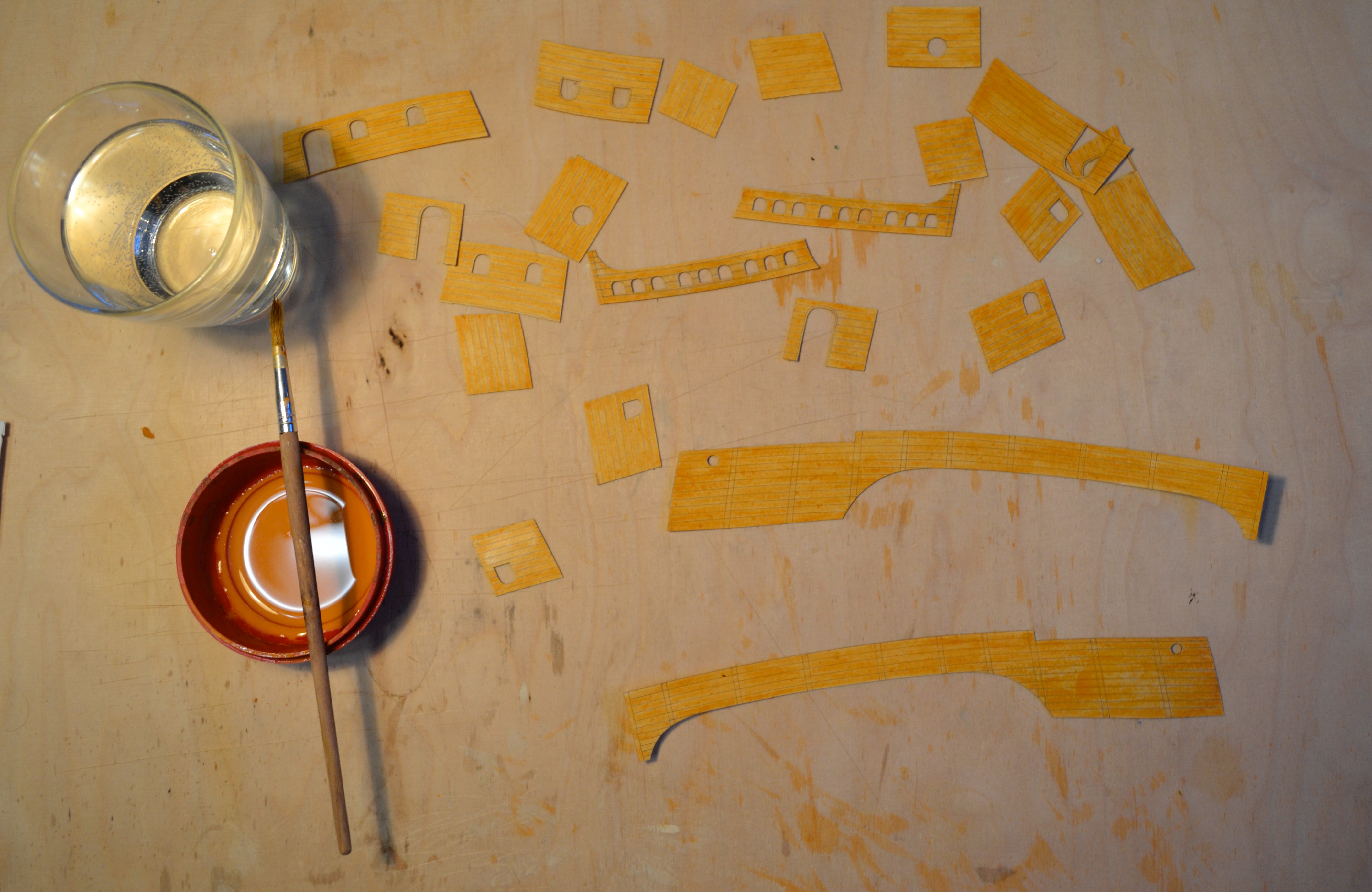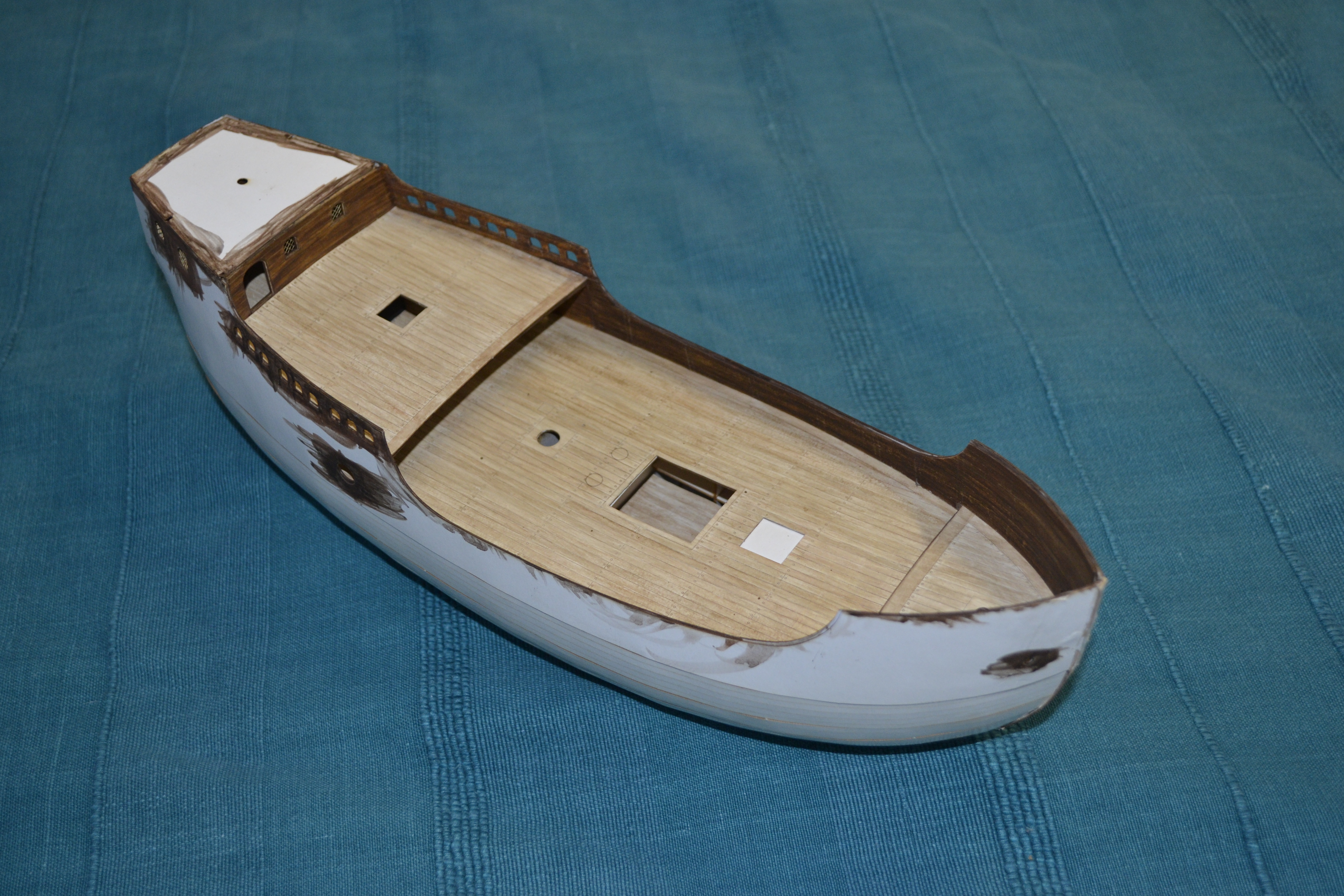Elementem, który tu zawsze sprawia większą trudność to jest malowanie elementów, tu cały statek w zasadzie trzeba pomalować samemu. Zastosowałem technikę taką samą jak w przypadku kogi bremeńskiej, tj. każdą deseczkę maluję oddzielnie. Oto etapy prac przy malowaniu: No i muszę przyznać, że niestety jak dla mnie wychodzi to nieco zbyt pstrokato. Metoda sprawdziła się przy malowaniu pokładów: Na szczęście elementy, które pomalowałem w większości są elementami wewnętrznymi. Przy malowaniu kadłuba nie będę już malować każdej deseczki oddzielnie, a najpierw pomaluję cały kadłub w całości a potem dopiero pozaznaczam tylko niektóre deski poszycia (a nie każdą). Dzięki czemu mam nadzieję że uzyskam odpowiednią imitacje drewna.
