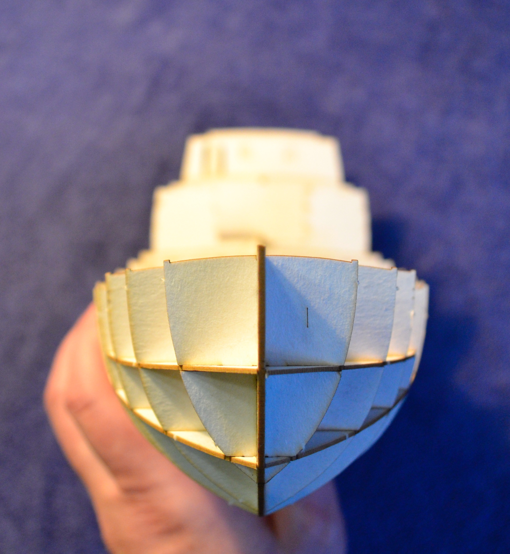 Mam już zrobiony szkielet i położone 2 poszycia (z trzech). Sam szkielet z racji tego, że jest cięty laserowo składa się bardzo prosto: Ponieważ karton jest bardzo gruby, szkielet też wydaje się przypominać statek a nie śmigło (podobnie jak przy Kodze bremeńskiej, gdzie szkielet tak samo się ładnie składał): Zatem nie będę się nad nim rozwodził.