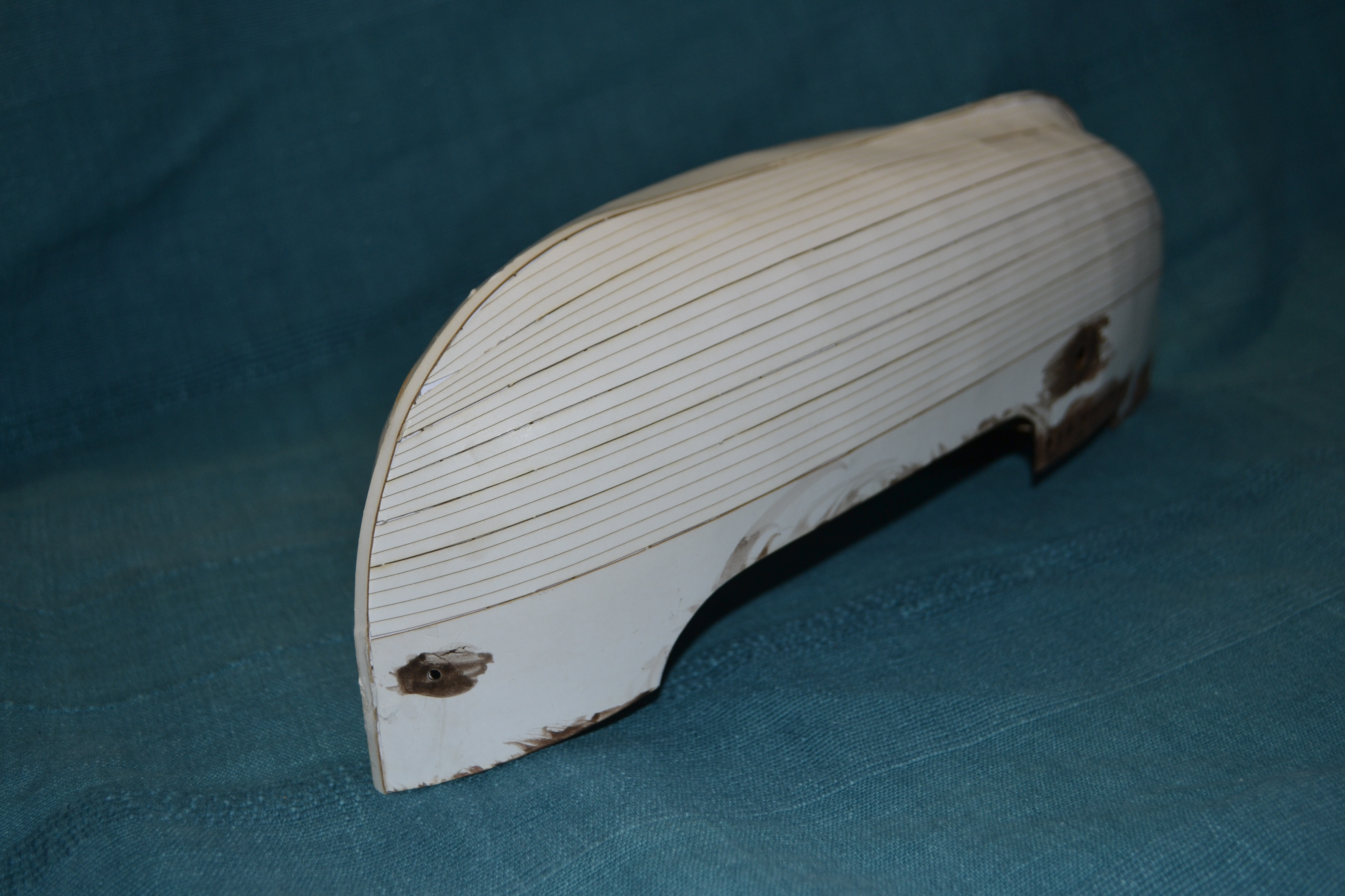 Elementem, który tu zawsze sprawia większą trudność to jest malowanie elementów, tu cały statek w zasadzie trzeba pomalować samemu. Zastosowałem technikę taką samą jak w przypadku kogi bremeńskiej, tj. każdą deseczkę maluję oddzielnie. Oto etapy prac przy malowaniu: No i muszę przyznać, że niestety jak dla mnie wychodzi to nieco zbyt pstrokato. Metoda sprawdziła się przy malowaniu pokładów: Na szczęście elementy, które pomalowałem w większości są elementami wewnętrznymi. Przy malowaniu kadłuba nie będę już malować każdej deseczki oddzielnie, a najpierw pomaluję cały kadłub w całości a potem dopiero pozaznaczam tylko niektóre deski poszycia (a nie każdą). Dzięki czemu mam nadzieję że uzyskam odpowiednią imitacje drewna.