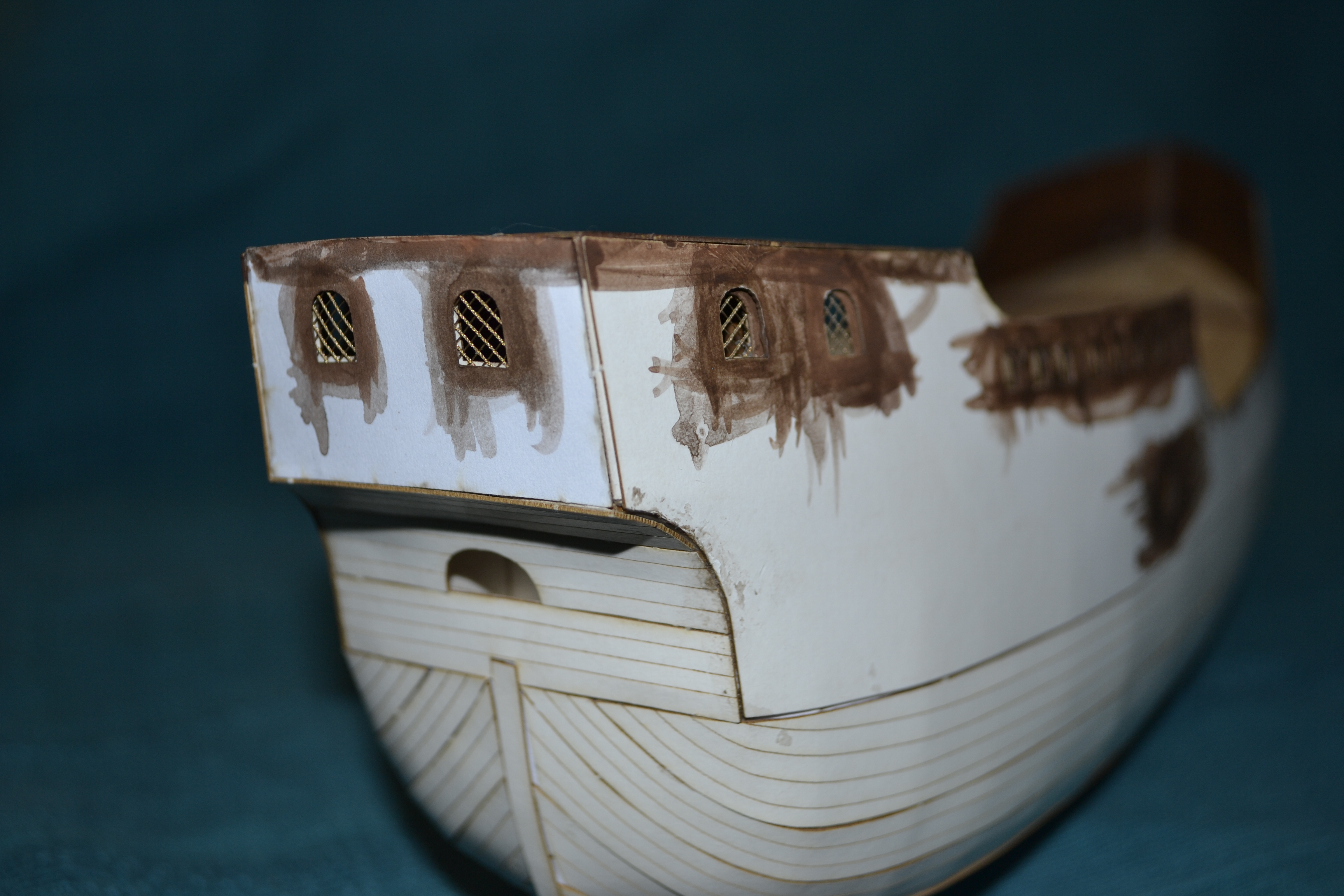 No i po drugim poszyciu nadal wręgi widać, choć mniej. Ciekaw jestem trzeciego poszywania: No i tu pokazuję dlaczego warto retuszować każdy element już na poziomie składania. Tu raz nie pomalowałem białych krawędzi papieru i od razu wybiło (obrys okna, momentami przebija biały). Postaram się to naprawić retuszowaniem małym pędzelkiem, w sumie to widać tylko z bliska, ale ma być dobrze: Wreszcie ogólny pogląd na model, zabieram się za trzecie poszycie:
