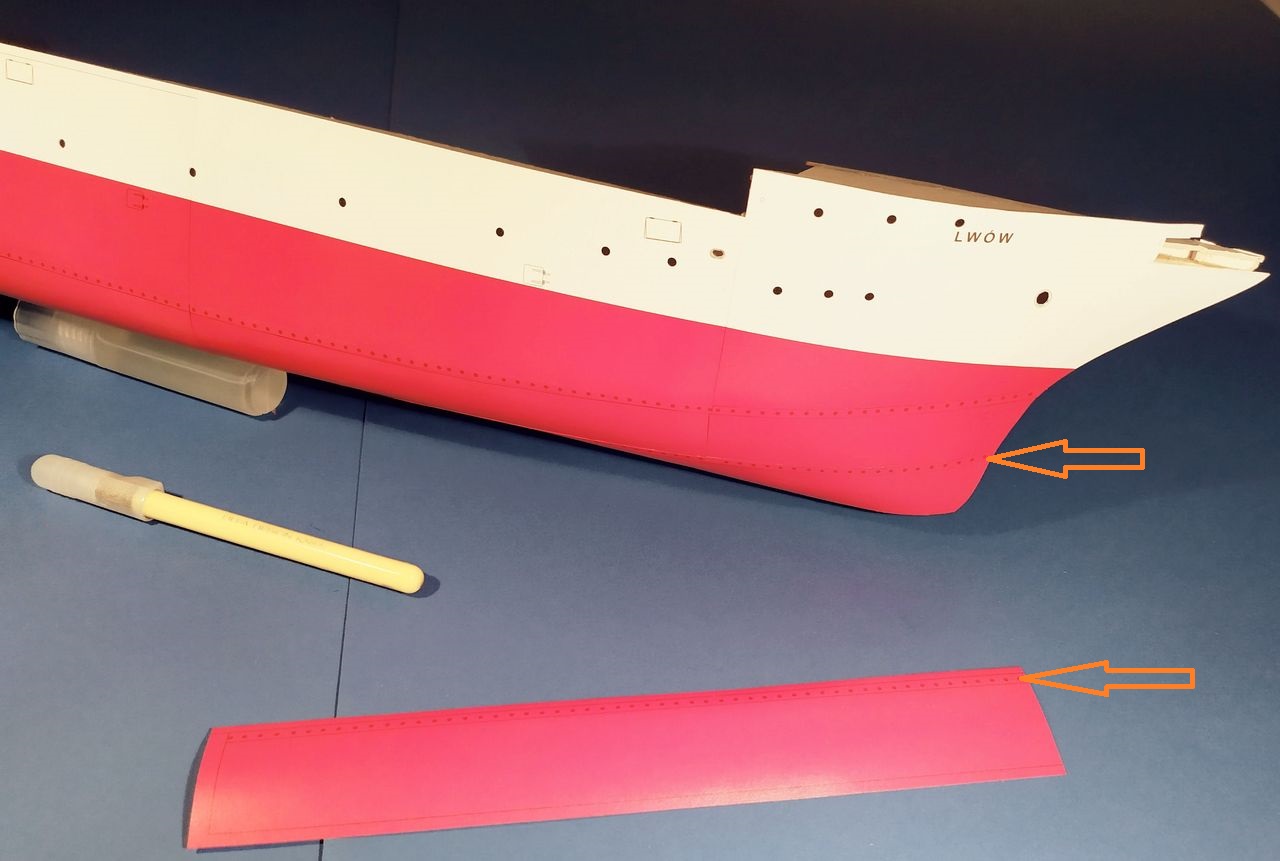 Poszycie dna jest nietypowe jak na kartonowy model statku. Składa się z szerokich planek łączonych na zakładkę imitacją nitów. LWÓW miał takie poszycie, ale ja oddzieliłem paski i nieco je zmodyfikowałem
