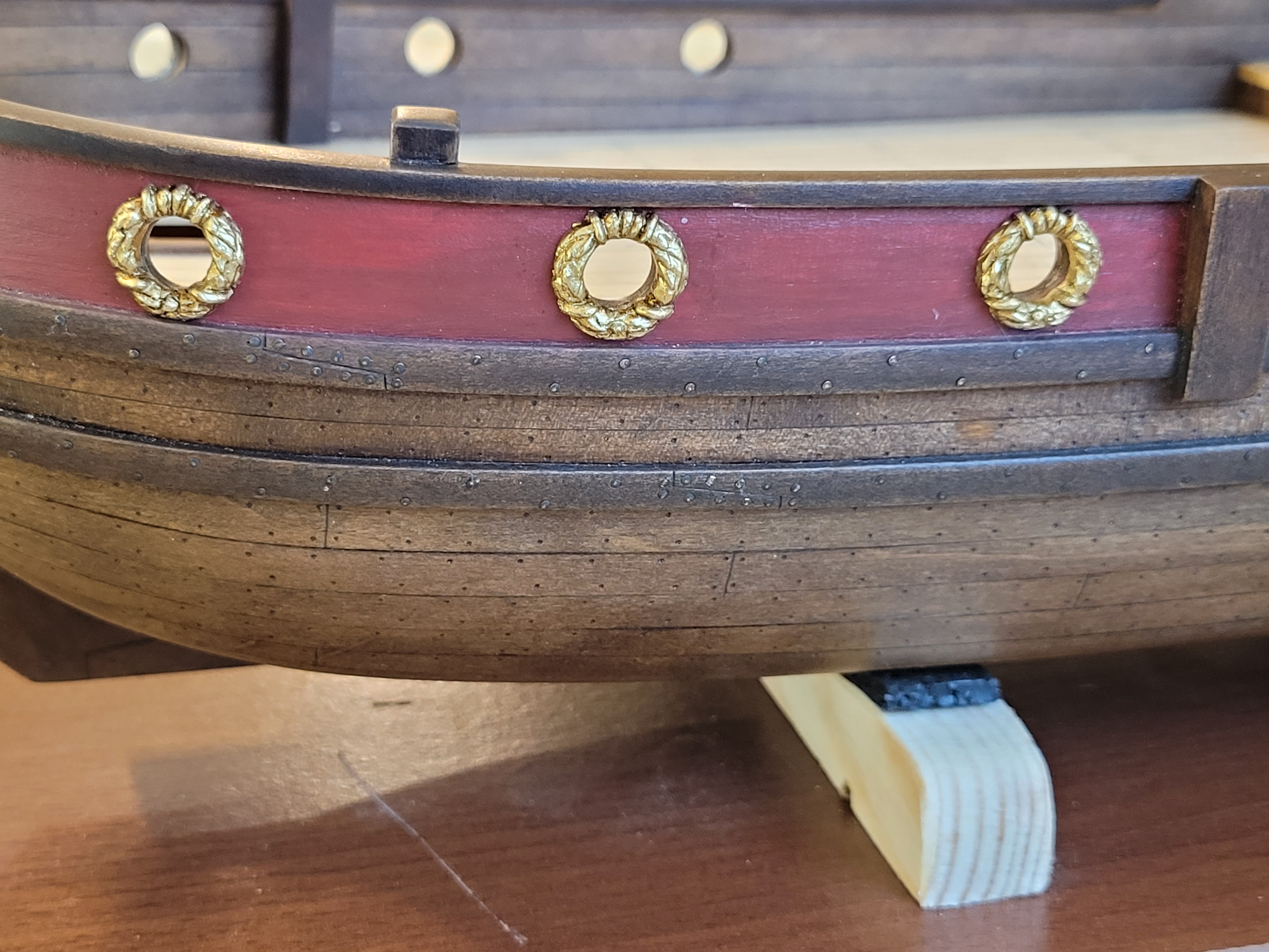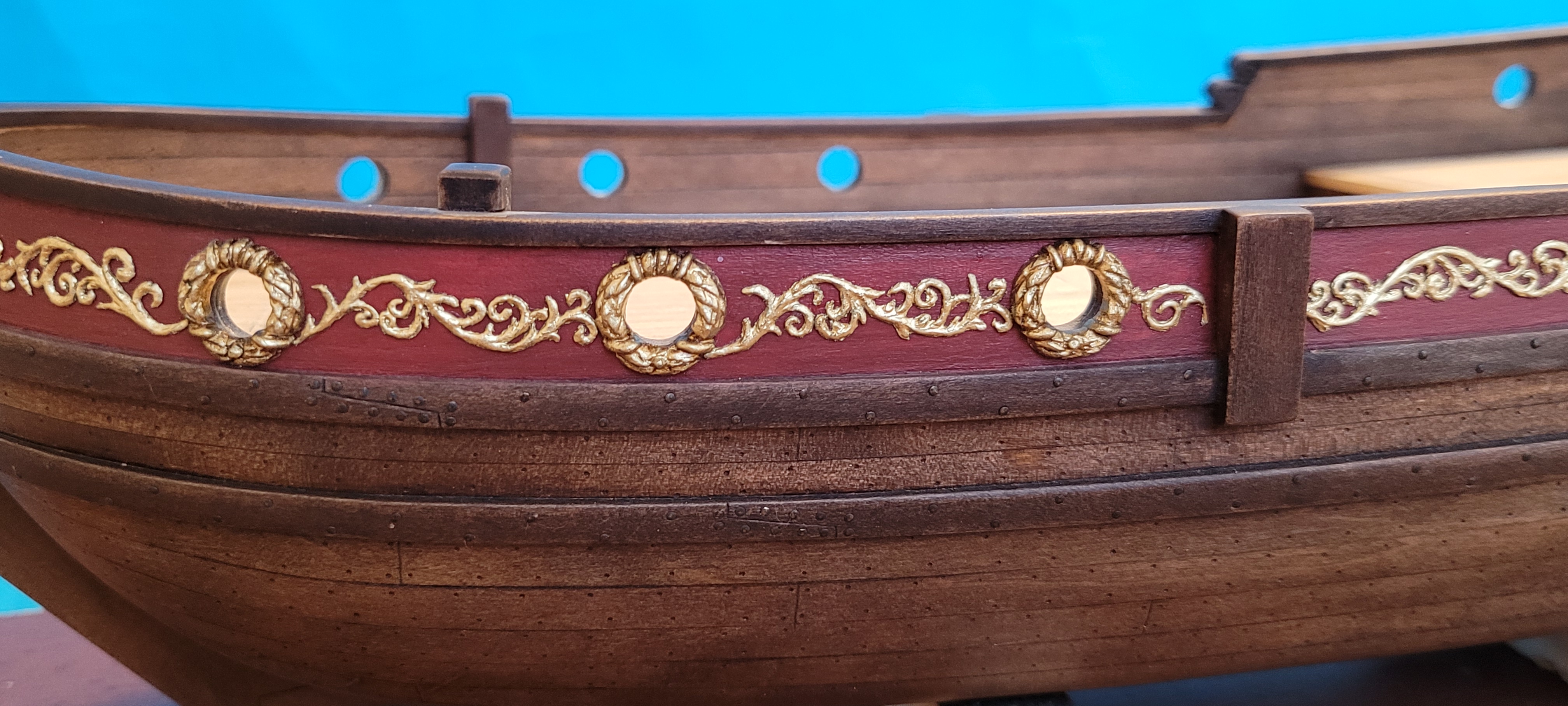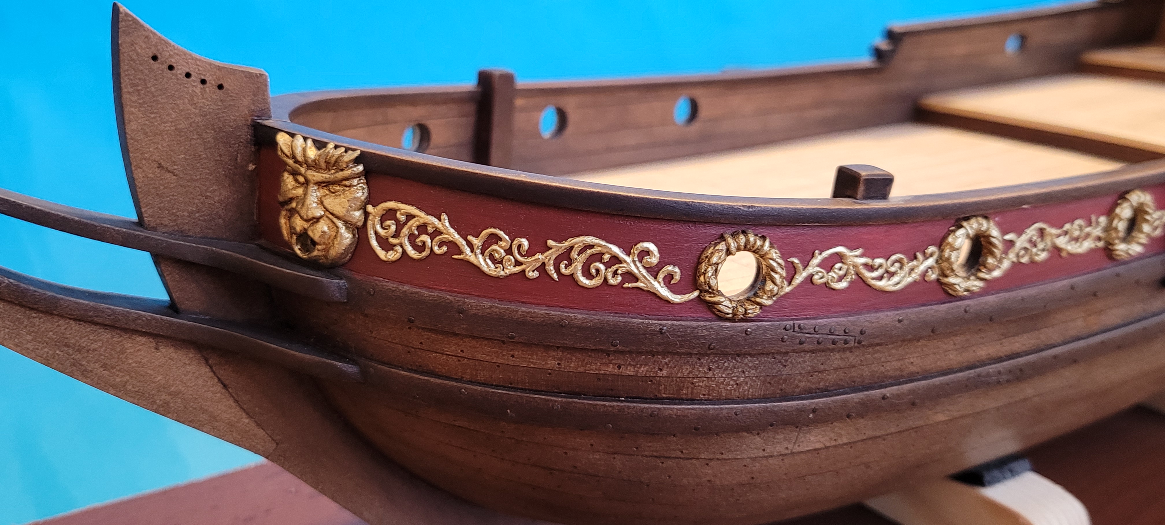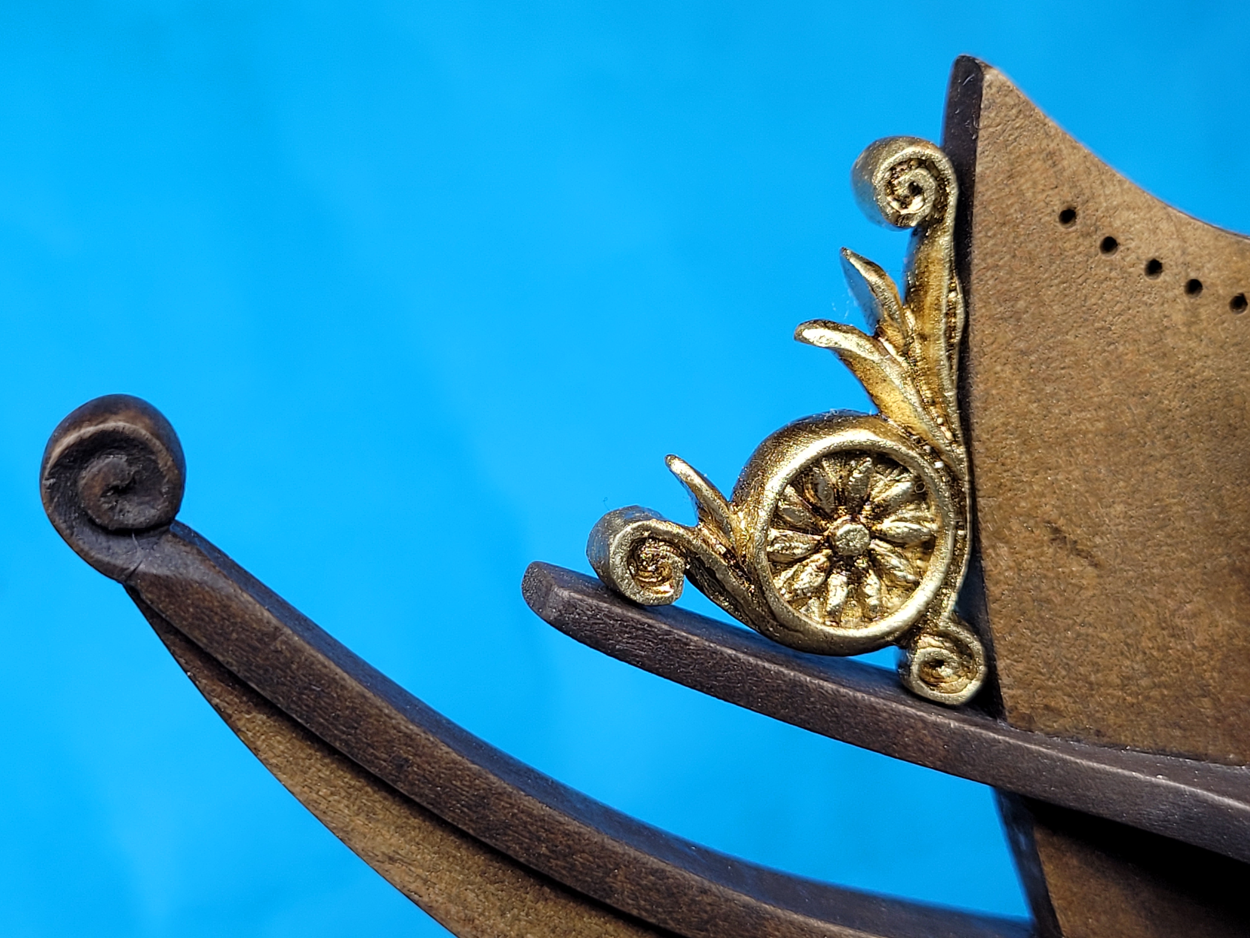 Sporo czasu zeszło mi przy wykonaniu ornamentów wzdłuż burt i wypracowaniu sposobu jak to zrobić. Wykorzystałem masę green stuff, a sposób to przyklejanie na wzór na kartce wałeczków z tej masy o średnicy ok 0,5-1mm i formowanie tych wywijasów. Po stwardnieniu odcięcie skalpelem od kartki, wyrównanie krawędzi i malowanie.