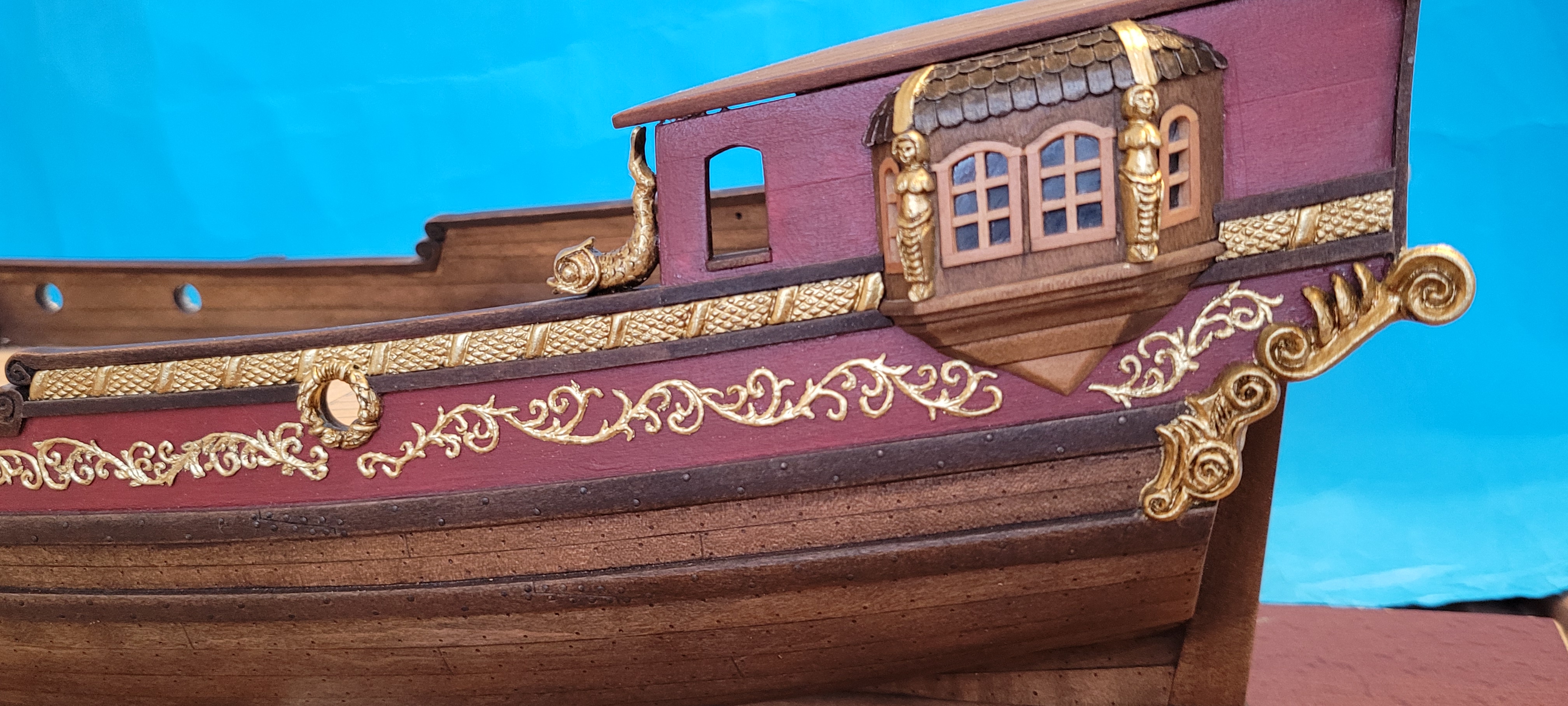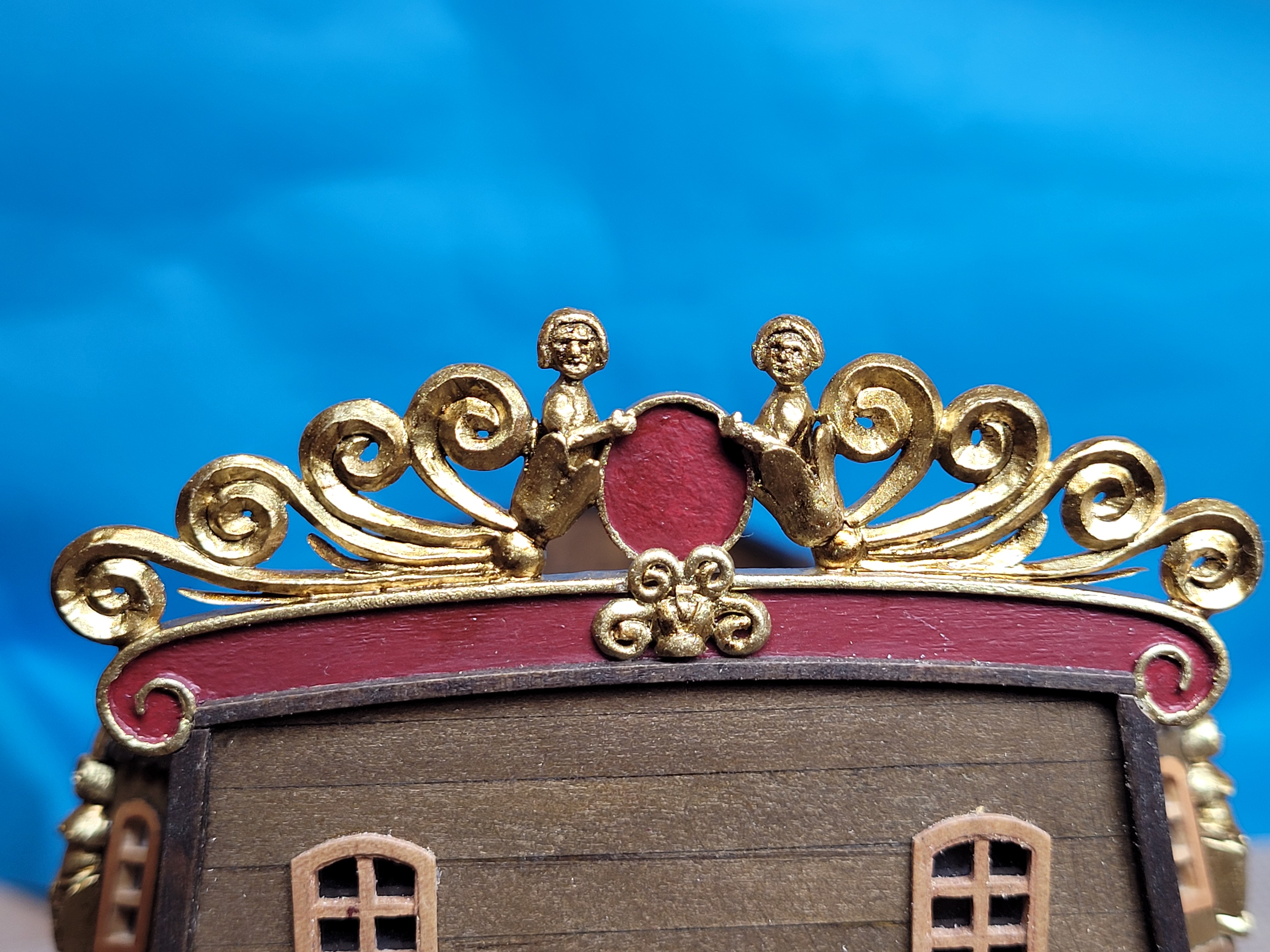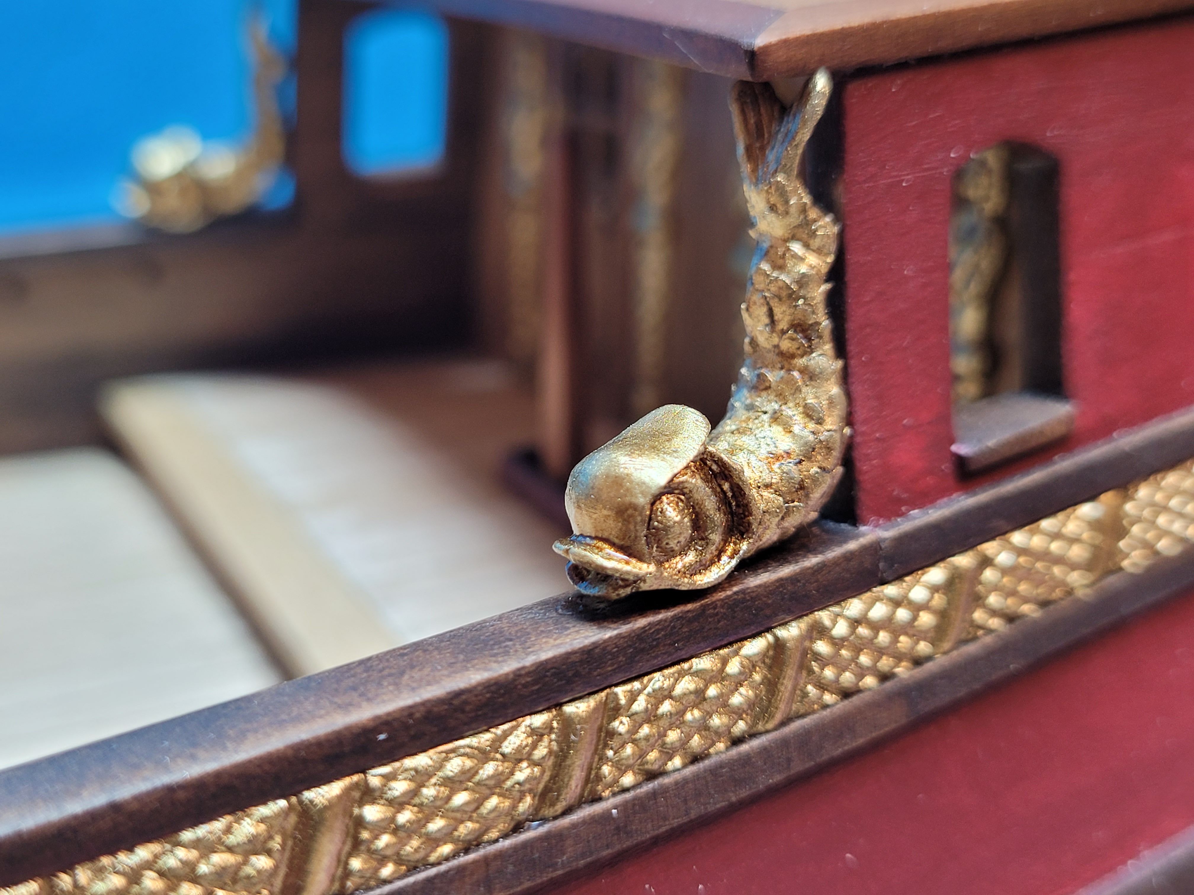 Ciąg dalszy ozdabiania, tym razem stwory rybopodobne i wywijasy na nadbudówce rufowej.