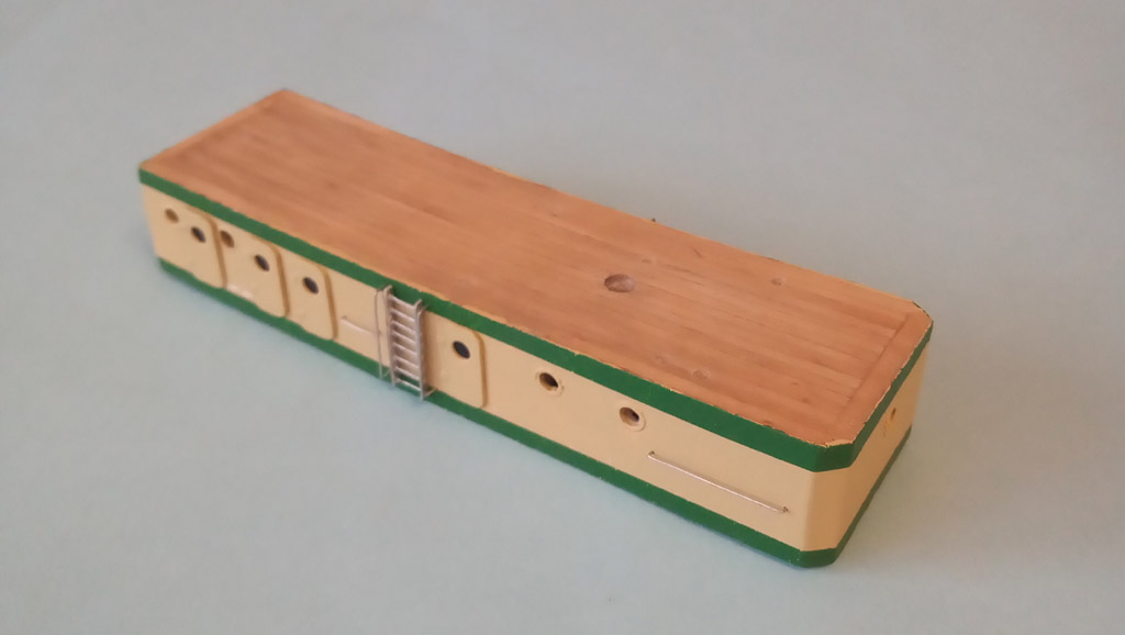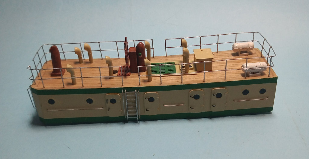 Kadłub pryśnięty podkładem i w takim kolorze chyba zostanie ( zielony kolor części podwodnej trochę mi nie pasuje) . Burta nad linią wodną będzie biała ale do tego jeszcze trochę czasu minie. Nadbudówka zrobiona ,trzeba dalej działać