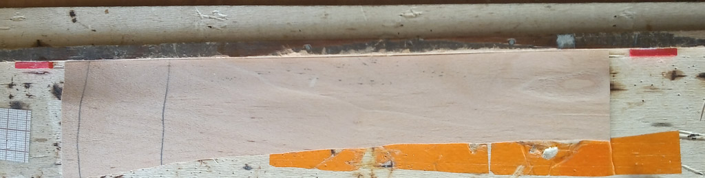 Deski na pokład robie z forniru olchowego . Lekko zwilżam fornir i tnę na odpowiednią szerokość na takim prymitywnym urządzeniu .Przed ucięciem zaznaczam fornir z jednego końca i tne deski . Następnie przycinam na odpowiednią długość zaznaczając zawsze od której strony był początek . Zaczyna się naklejanie w ten sposób że zaznaczone końce mają dotykać do siebie i odwrotnie .Po oklejeniu całego pokładu czyszcze a następnie lekko lakieruje i widać deski .