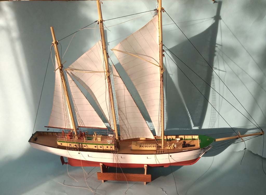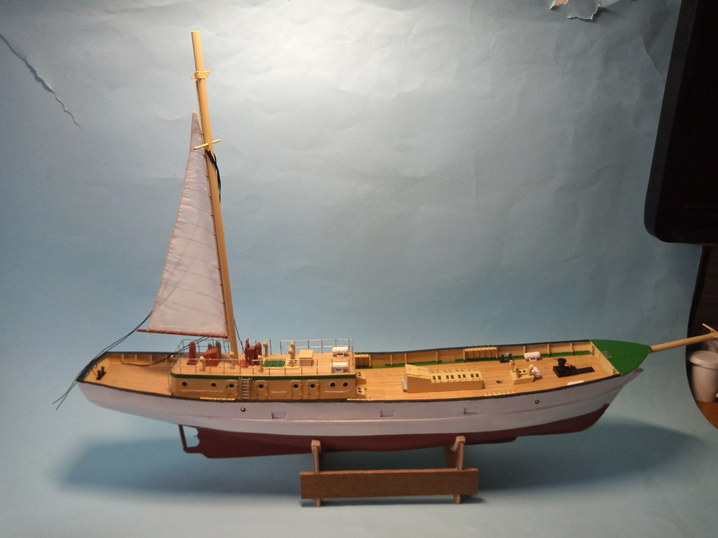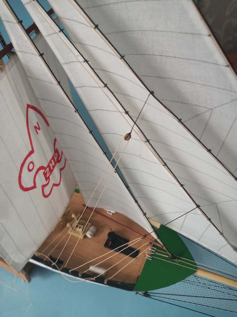 Ostatnio brakuje mi czasu ale udało się zrobić żagielki . Upaprałem też kadłub nad linią wodną na biało . Zastanawiam się czy zrobić zielony pasek na styku białego i podwodnej części .