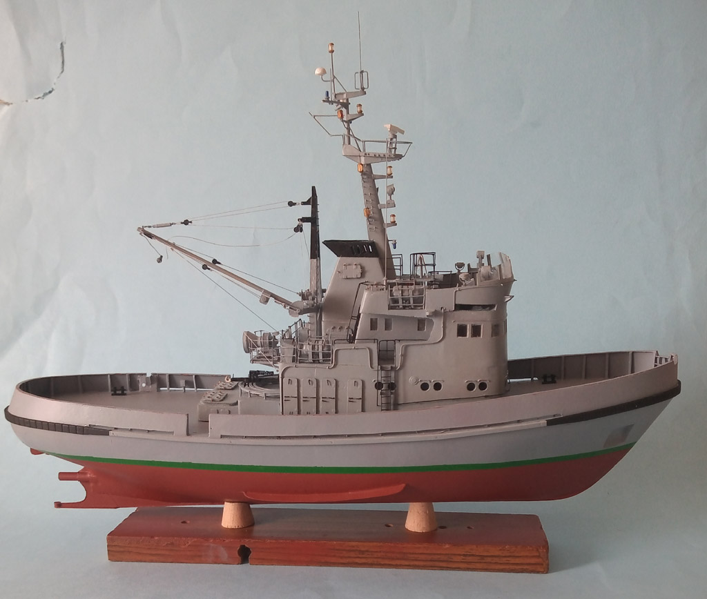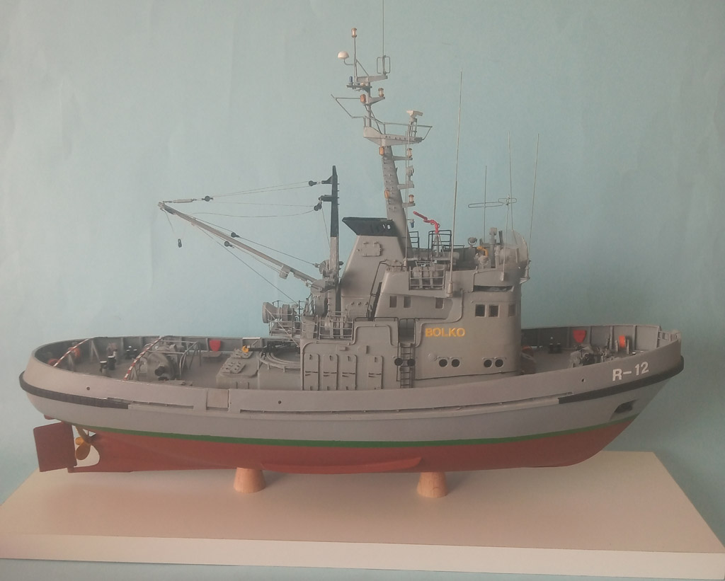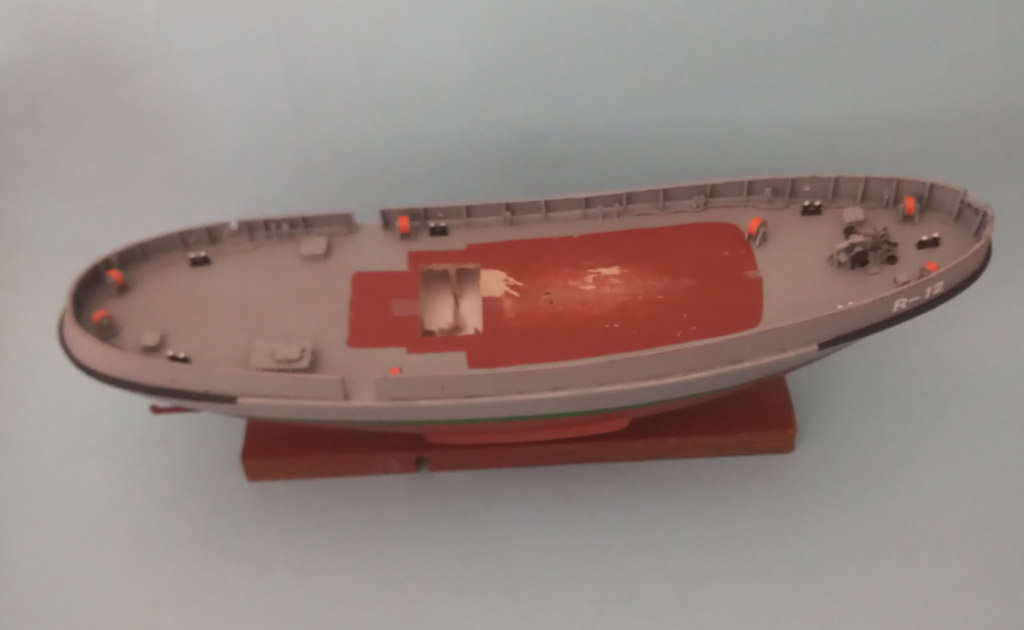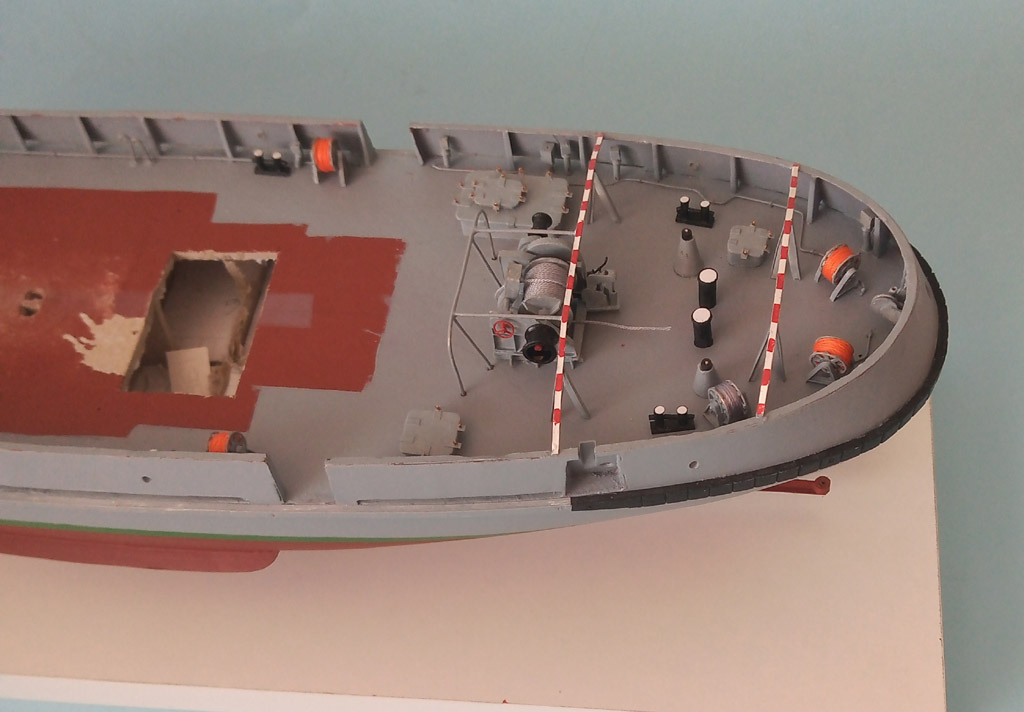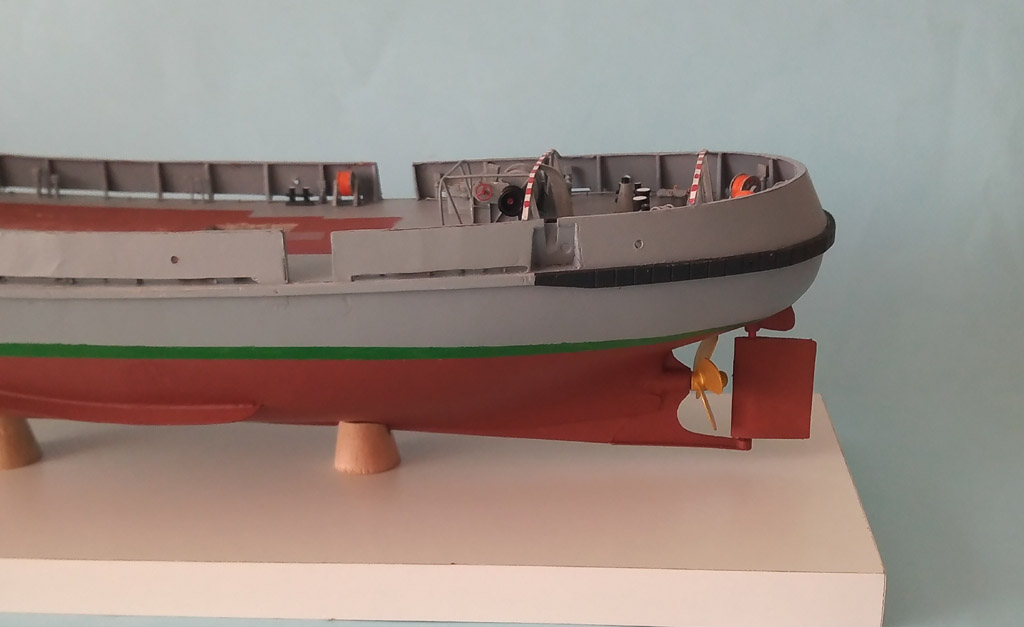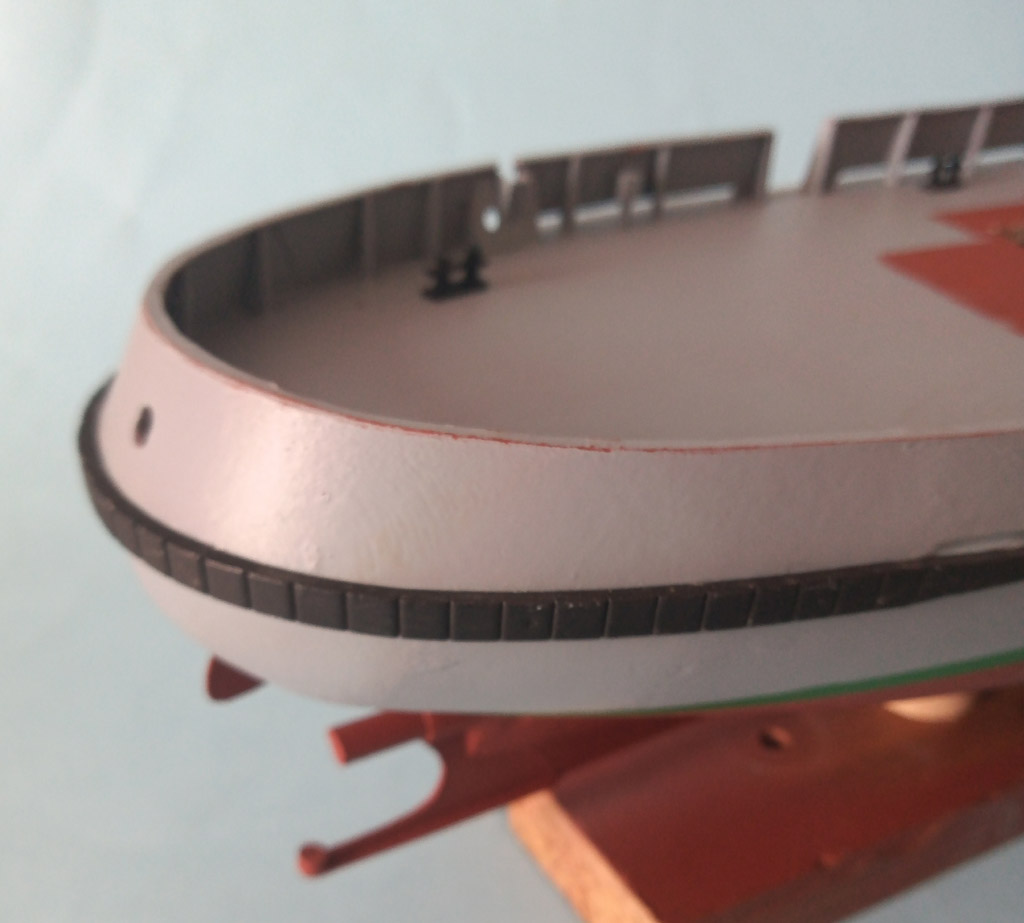 Coraz drobniejsze elementy to wolniej przybywa . Trochę pobawiłem się się z odbojnicami i upaprałem kadłub .Przetarcia na kadłubie będa retuszowane na koniec . Nadbudówka postawiona tylko do fotki do następnego spotkania
