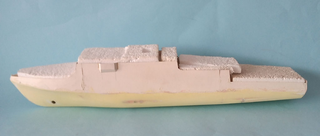 Trochę było zabawy z kadłubem ale już pryśnięty podkładem . Nadbudówka postawiona tylko do fotki jak będzie wyglądała . Pobawiłem się z następnym elementem Do następnego spotkania