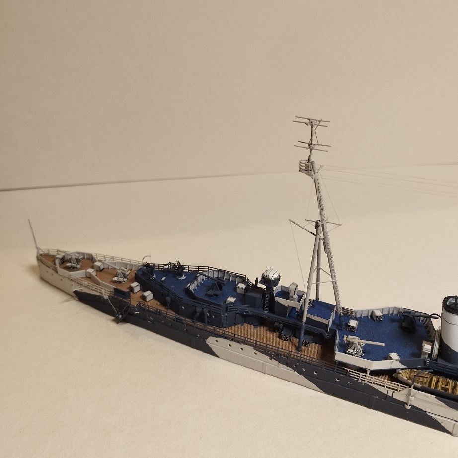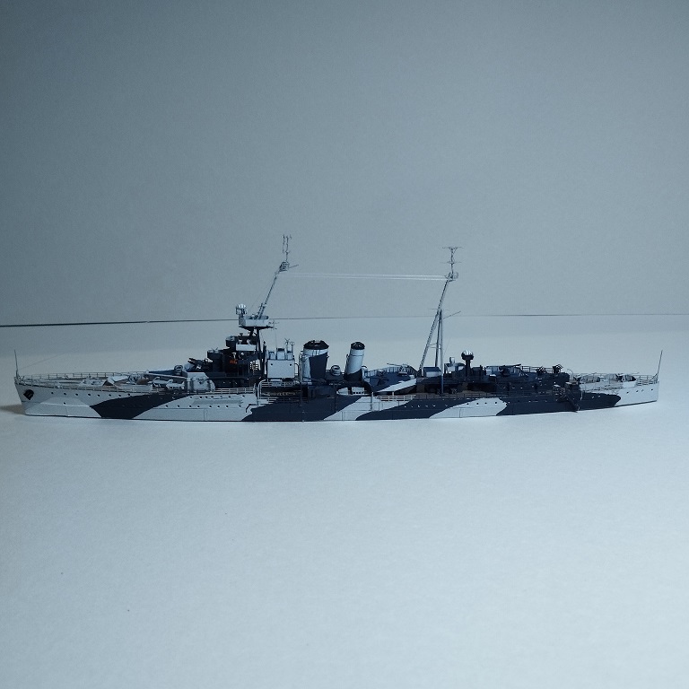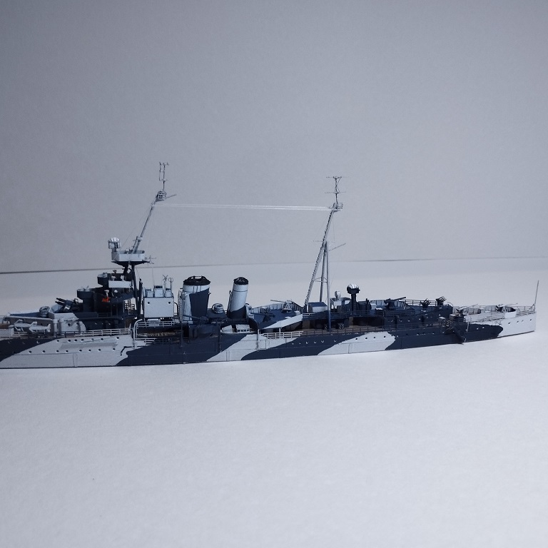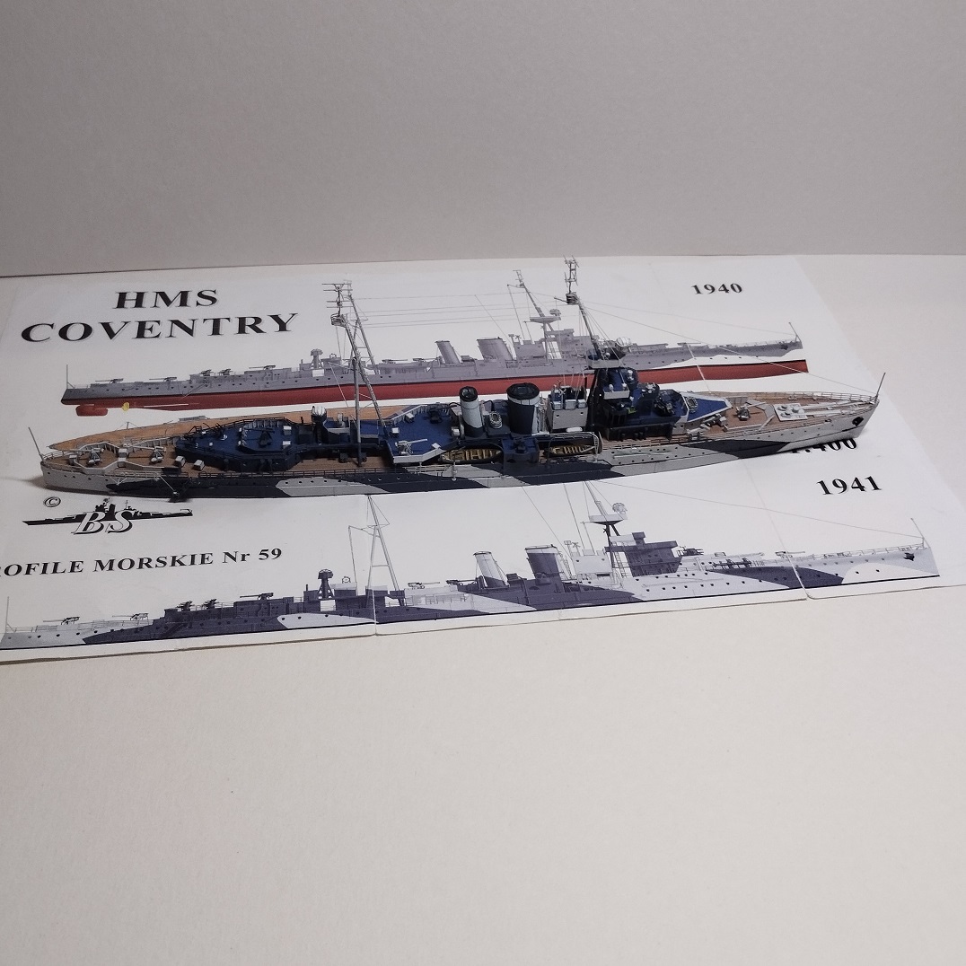 Chciałbym się pochwalić nowym modelem kartonowym ale budowanym od podstaw. Model jak w tytule przedstawia brytyjski krążownik przeciwlotniczy HMS Coventry. Wykonany jest od podstaw na papierze barwionym zbliżonym do podstawowego i farbkami naniesiony kamuflaż, na podstawie takiej fajnej gazetki Profile Morskie nr. 59. Bardzo mi się spodobał okręt a że nie ma go nigdzie wydanego, i chyba za bardzo napatrzyłem się na prace kolegi Sławka który bardzo fajnie robi kartonowe od podstaw nie zawahałem się aby takim sposobem zrobić model. Pragnę podziękować koledze Sławkowi za to że pokazuje swoje prace na których się wzorowałem oraz koledze Wojtkowi który pomógł i opracował kilka elementów komputerowo głownie kadłub. Zapraszam więc do skromnej galerii.