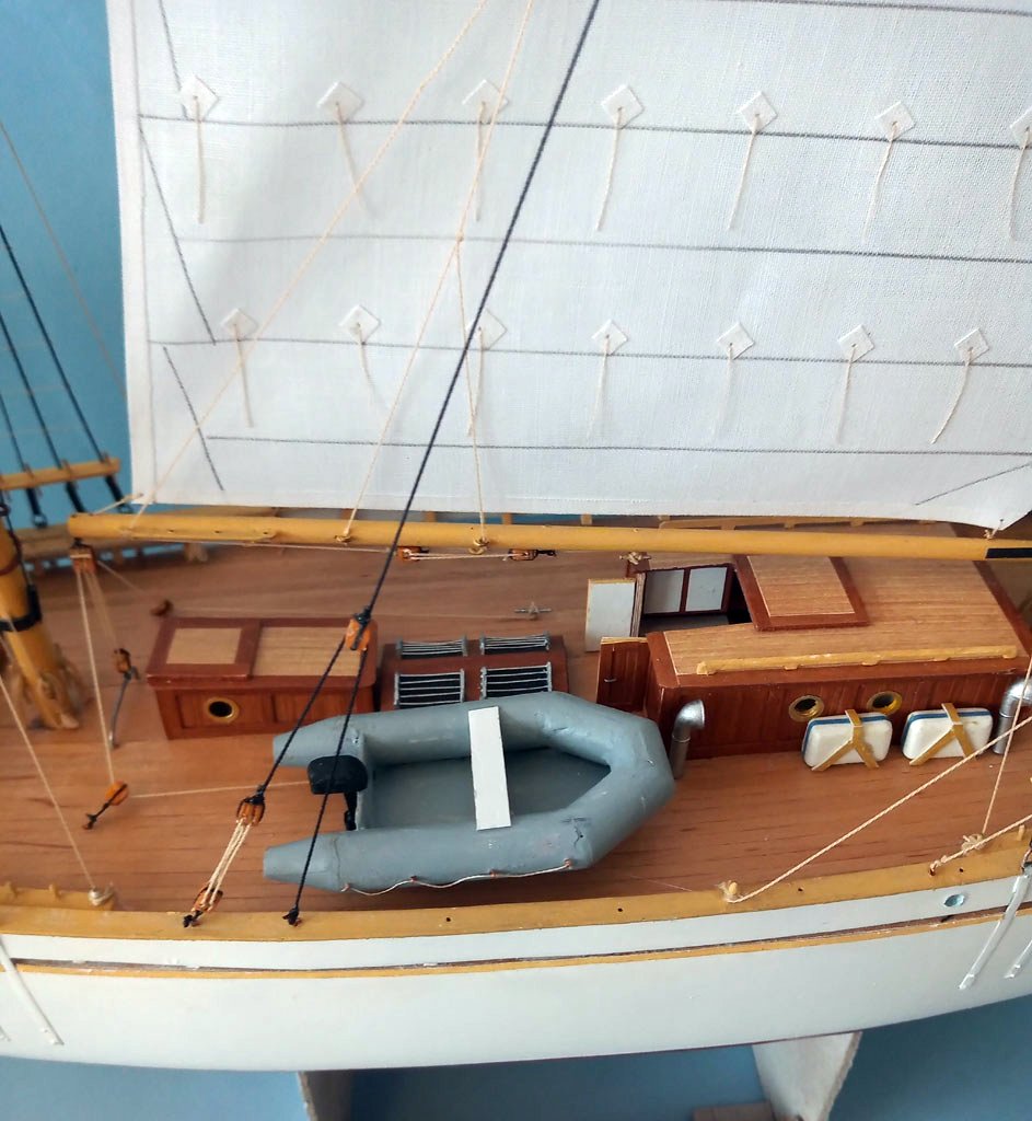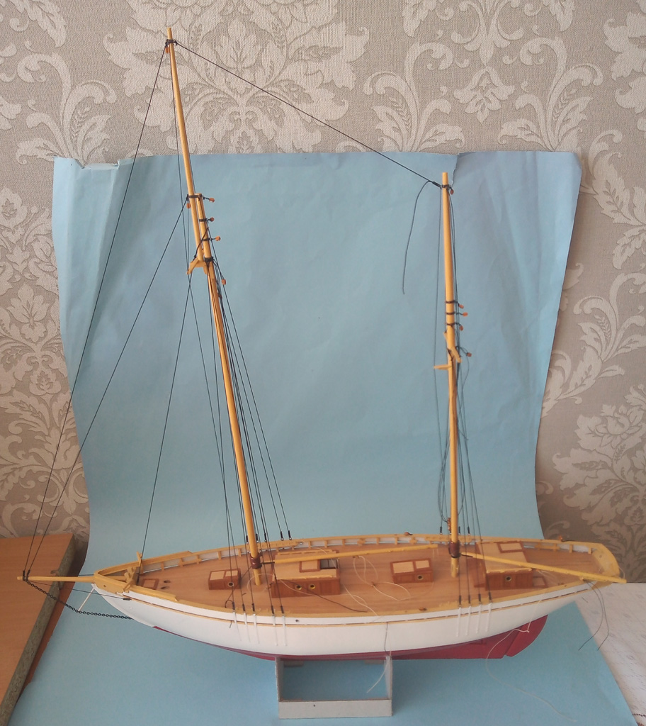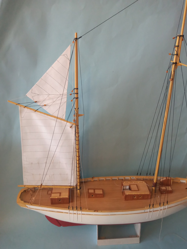 Maszty udało się postawić i zrobić część olinowania stałego . Zrobiłem dwa żagielki które musze uzbroić w bloczki przed zamocowaniem do masztów