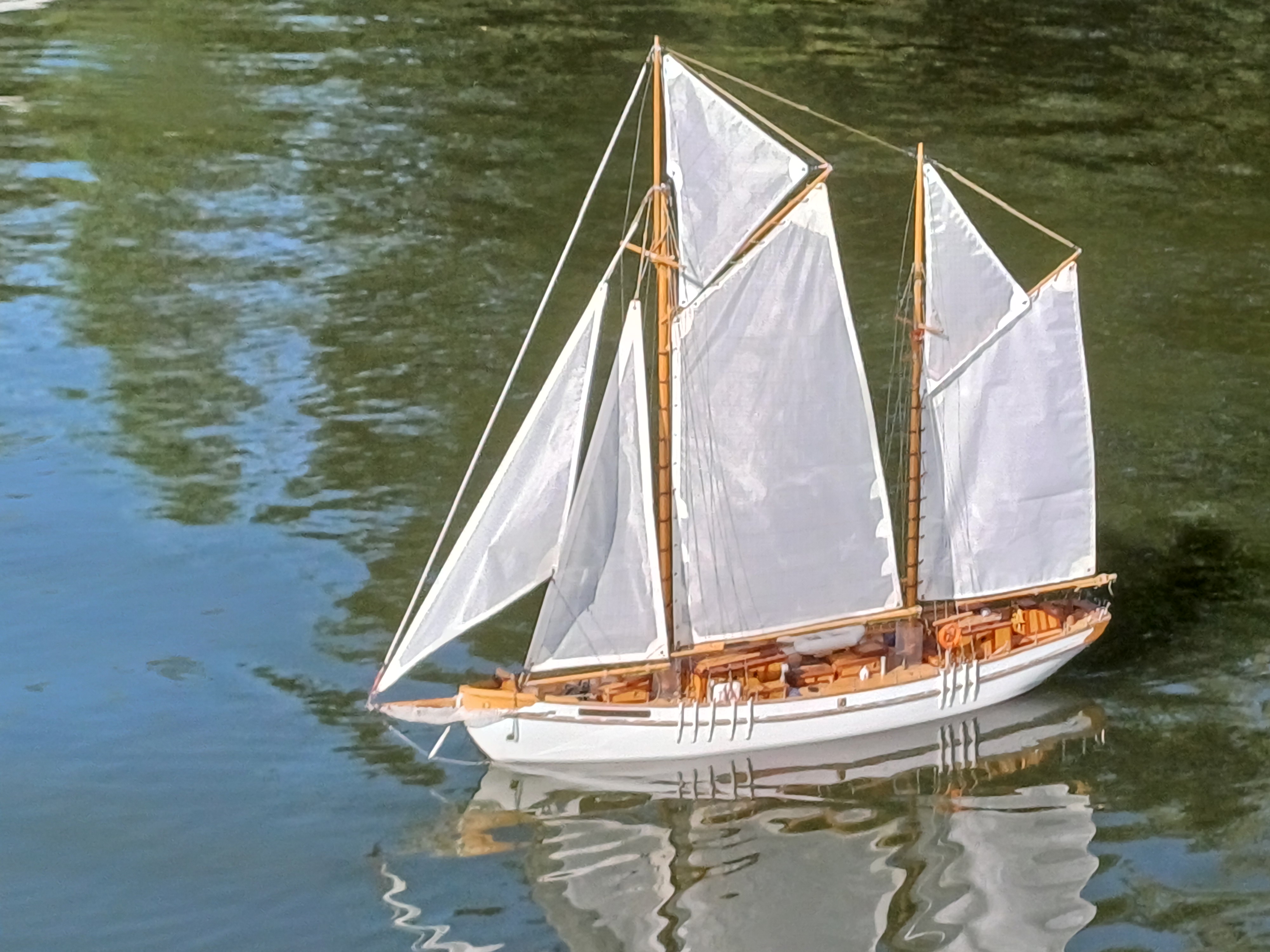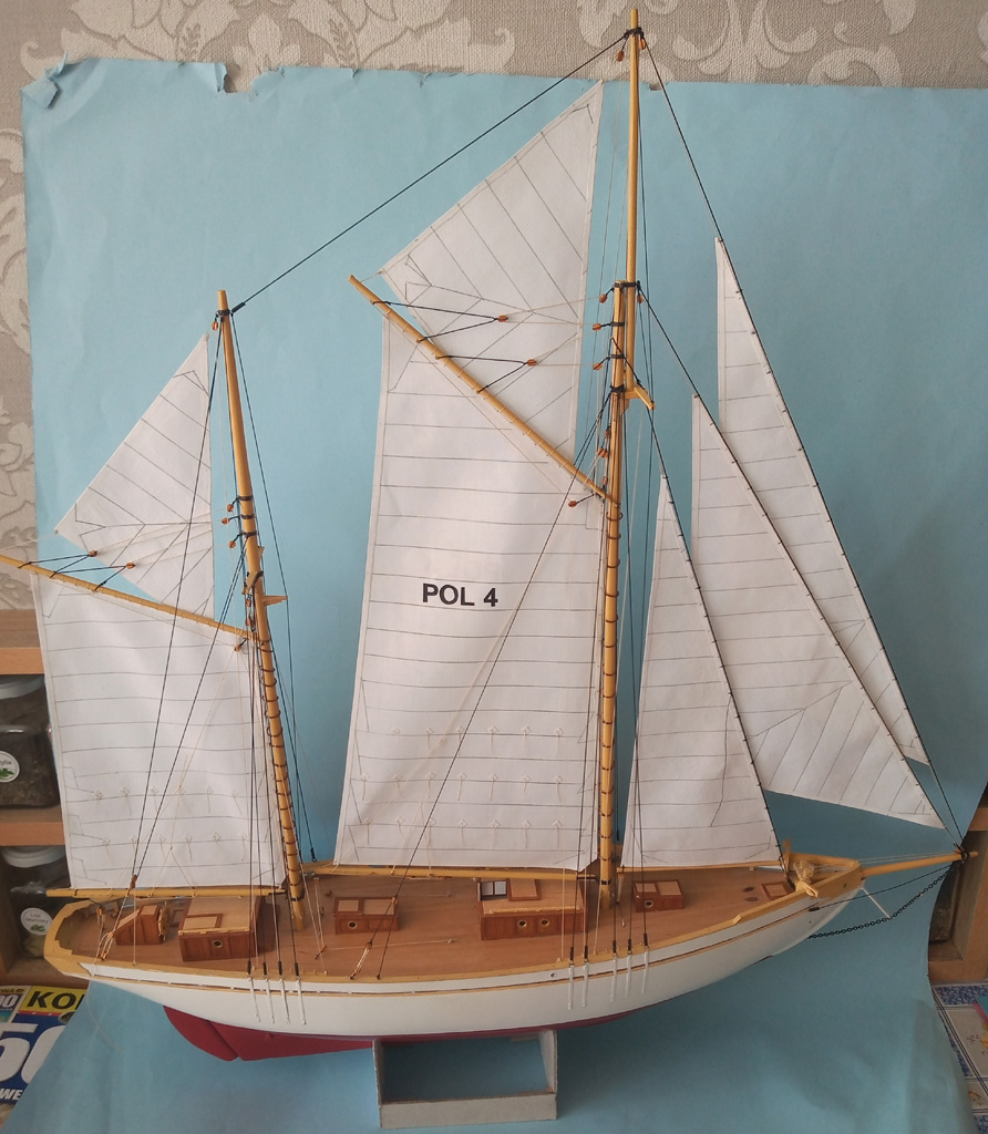 Kolega Janusz w tym roku skończył budowę Zaruskiego ale w wersji pływającej. Ładnie pływa na żaglach ale przy słabym wietrze zwroty wspomaga silnikiem. Zbudował specjalny wózek do wodowania i pobierania modelu z wody.