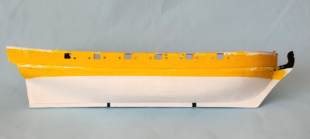 Pierw kadłub pomalowany farbą Renesans 01- biała (jako podkad) a dopiero żółtą Polycolor 118 . Żółty kolor słabo kryje dlatego biały podkład i kilka razy malowany żółtym