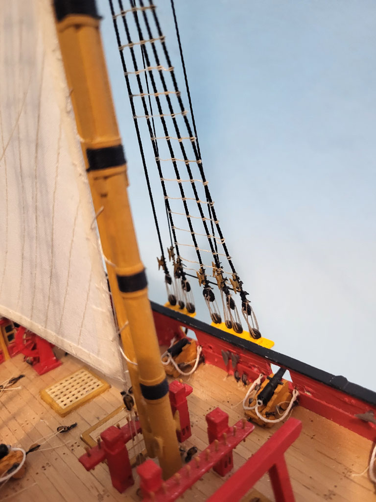 Następne "patyczki " zrobione - to pora na żagielki . Zamocowałem knagi wantowe oraz pierwszy żagielek .