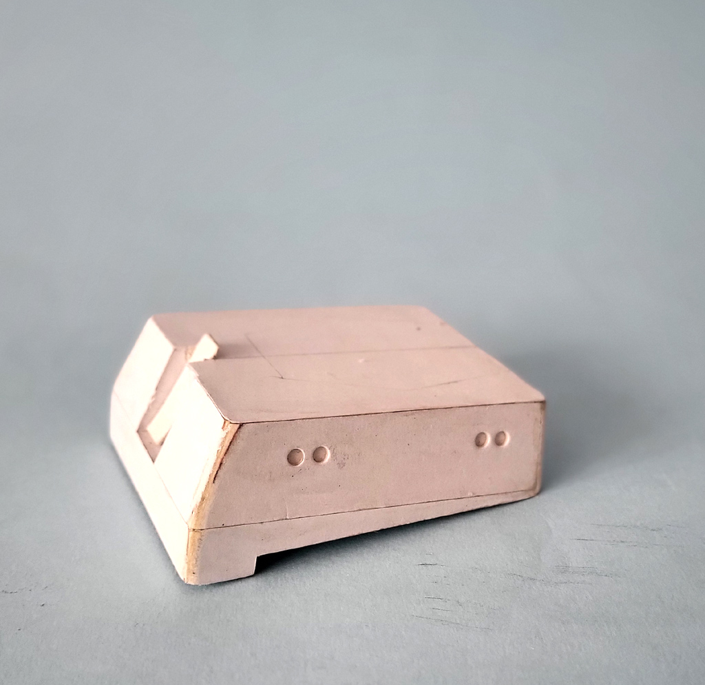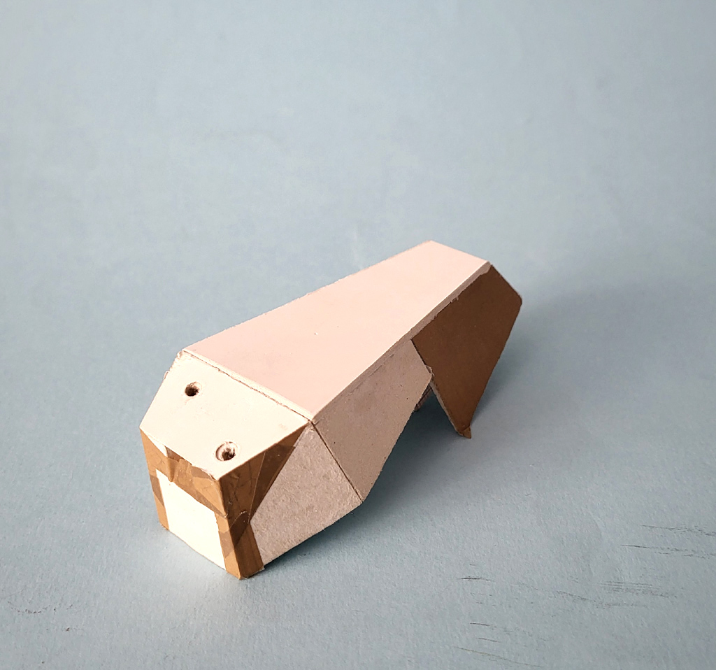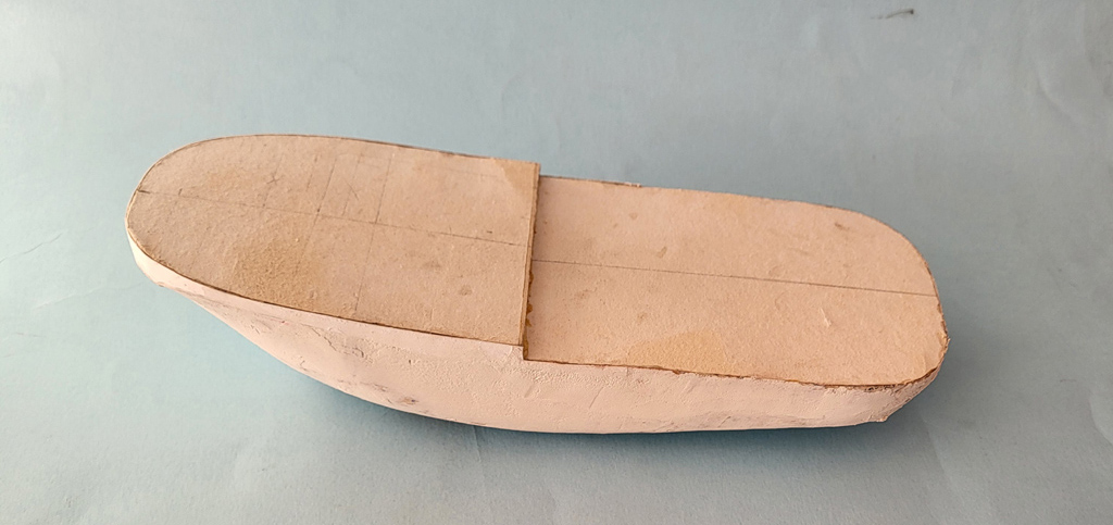 Po wyschnięciu szkieletu wkleiłem styrodur pomiędzy wręgi i oszlifowałem , następnie całość okleiłem jedną warstwą papieru a po wyschnięciu zaszpachlowałem . Powstała też jedna nadbudówka