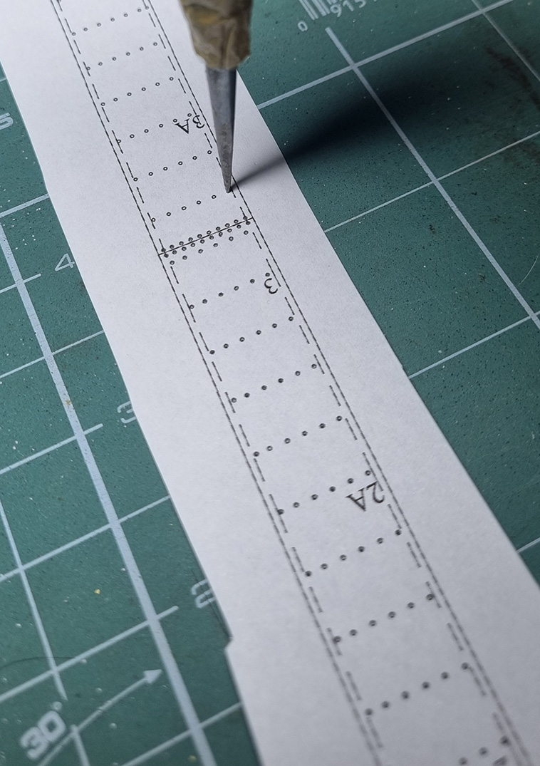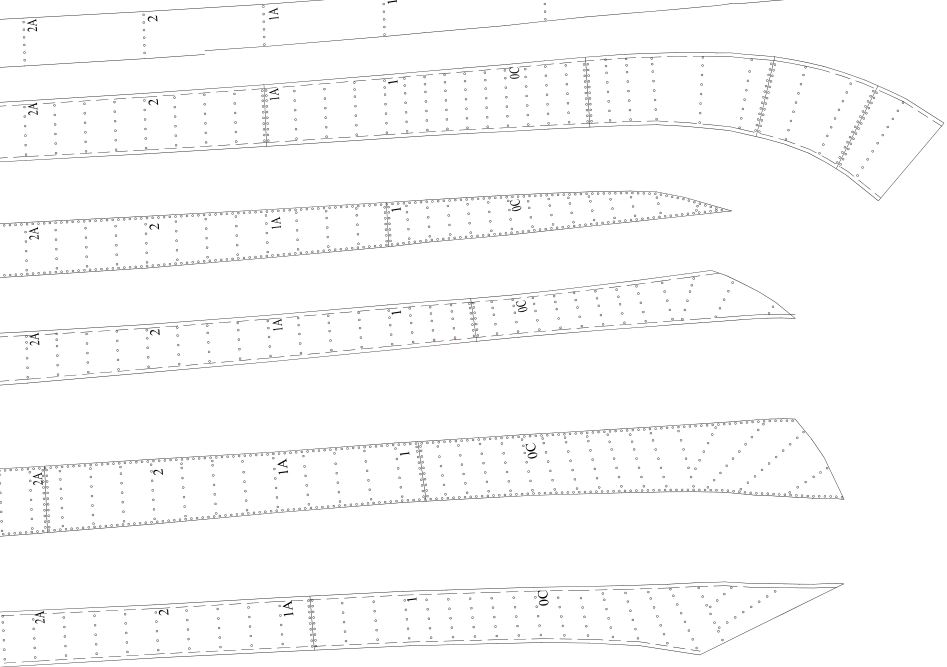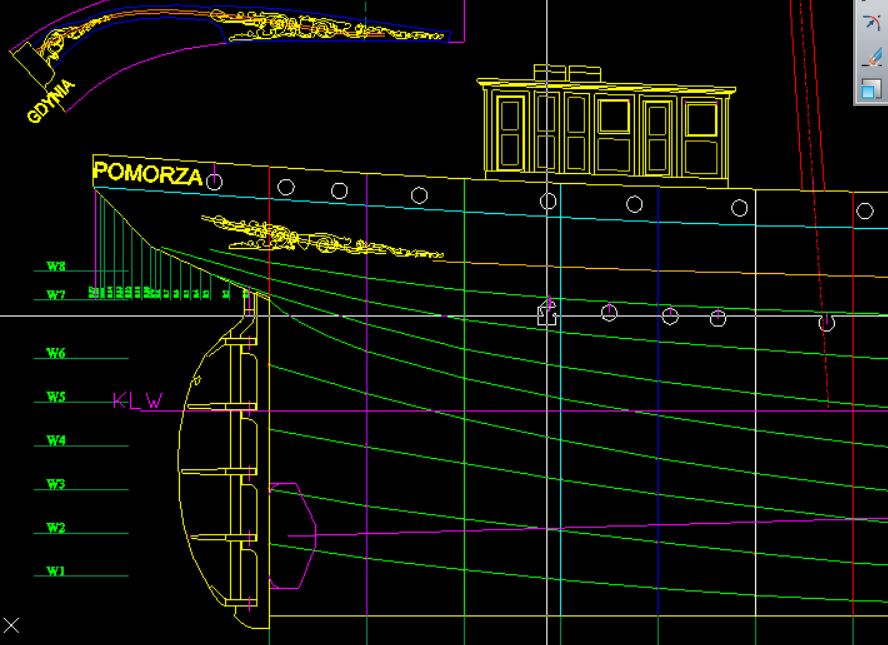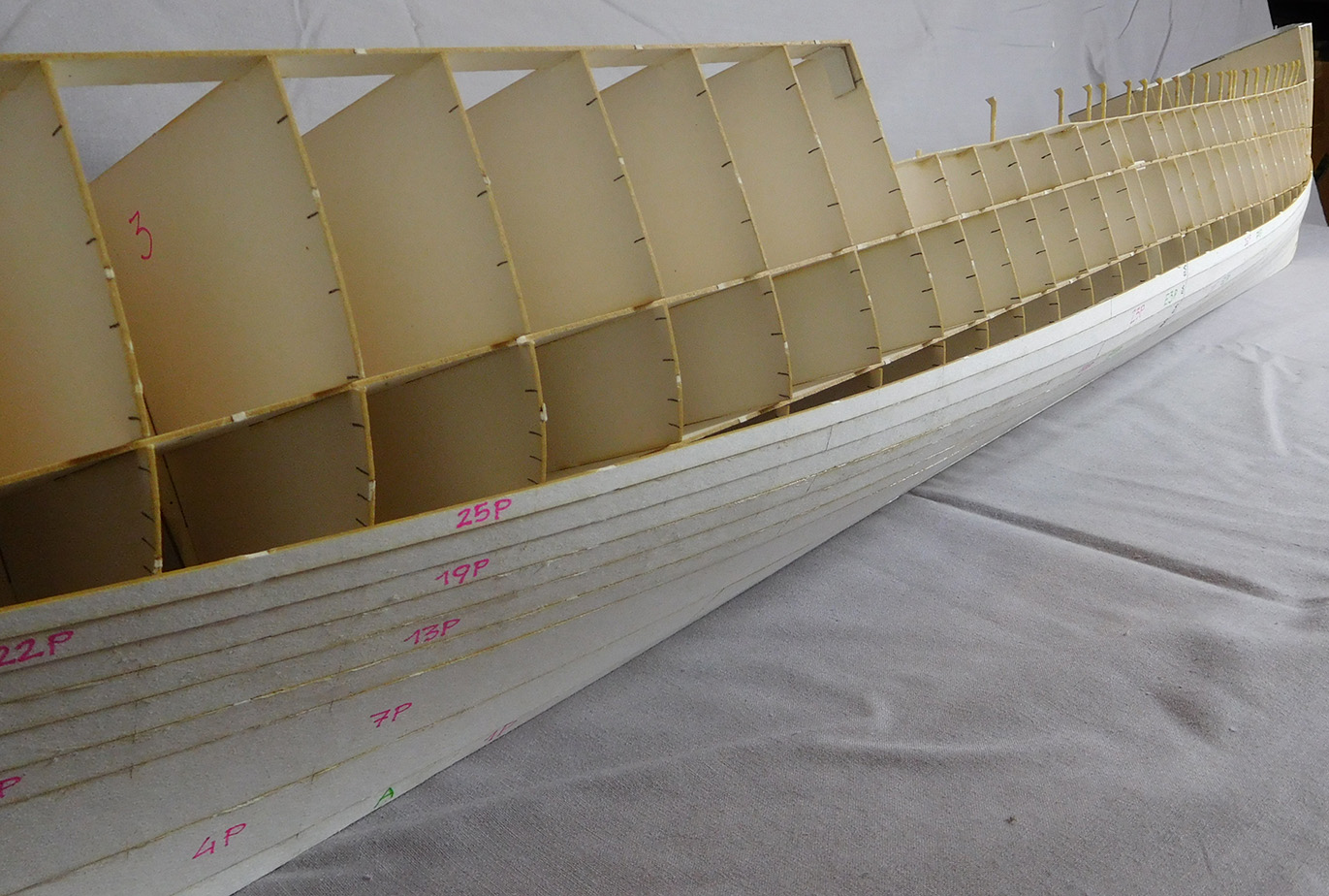 Zaczęło się od wstawienia skanów linii teoretycznych do CADa i narysowania ich od podstaw. Potem wyznaczyłem dodatkowe wręgi w potrzebnych mi miejscach oraz wg planów Kozaka naniosłem przebieg pasm blach poszycia. Po spasowaniu i „wygładzeniu” całości zaczęły powstawać rysunki elementów szkieletu i pokładów. W celu dokładnego wyznaczenia rozwinięć blach poszycia zbudowałem w blenderze siatkę połówki kadłuba i użyłem wtyczki „export model paper”. Po wyciągnięciu tych rozwinięć z blendera (robi to w fomacie pdf), wstawieniu do CAD-a i wyskalowaniu naniosłem linie nitów (CAD naliczył ich ponad 50 tyś.). Poszycie modelu składa się z dwóch warstw – pierwsza konstrukcyjna, elementy z tektury 1mm klejone do wręg i łączone podłużnie na styk oraz druga -imitacja blach, wydruk na papierze 90gr i „wydziobanymi” ręcznie liniami nitów. Pierwsza warstwa ma dodatkowe podłużne podziały na pasmach przypadających na wyobleniu dna ale niestety i tak widać delikatne podłużne załamania (nie wiem jak oni to robili w stoczni, że pasma z 14mm blachy nie mają żadnych załamań, są gięte w dwóch kierunkach – widać to wyraźnie na zdjęciach Daru w suchym doku) Druga warstwa naklejona na pierwszą z charakterystycznymi podłużnymi zakładkami.