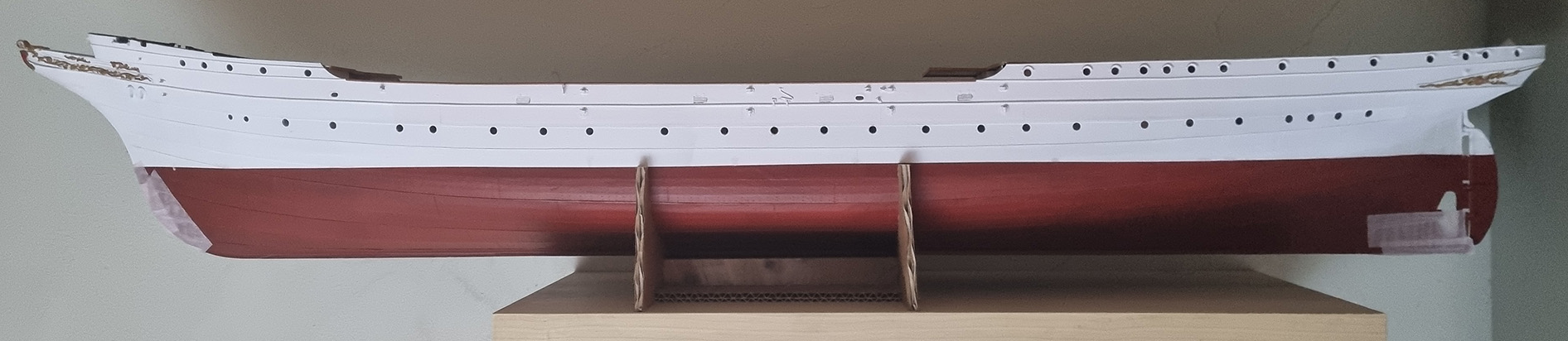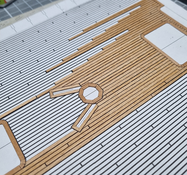 Elementy szkieletu i konstrukcji poszycia cięte laserem (ukłony dla p. Rafała z DRAF MODELU). Pokłady z tektury 0,5mm wykończone deseczkami szer.1,7mm z forniru bukowego 0,6mm również ciętymi laserem (są idealnie równe, ale przede wszystkim mają opalone, czarne krawędzie).