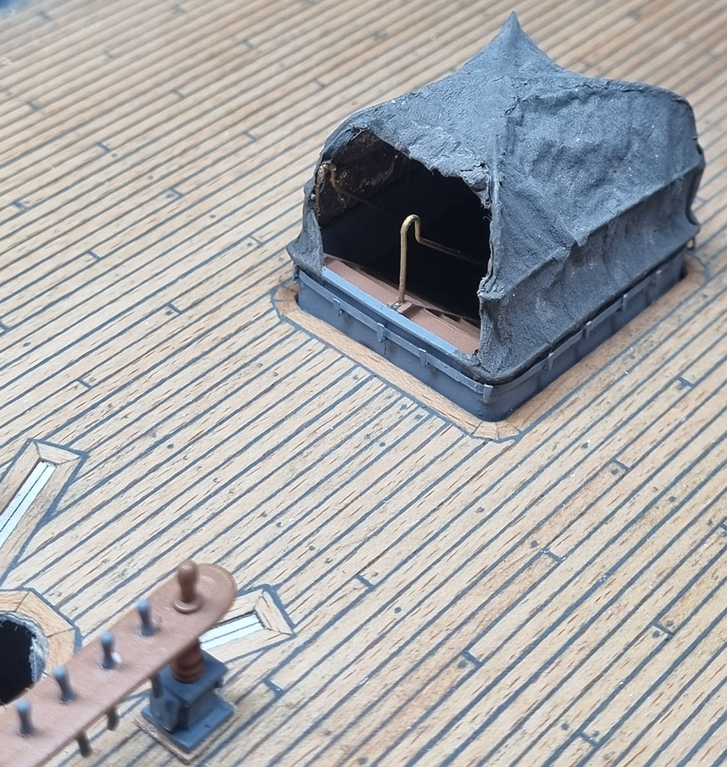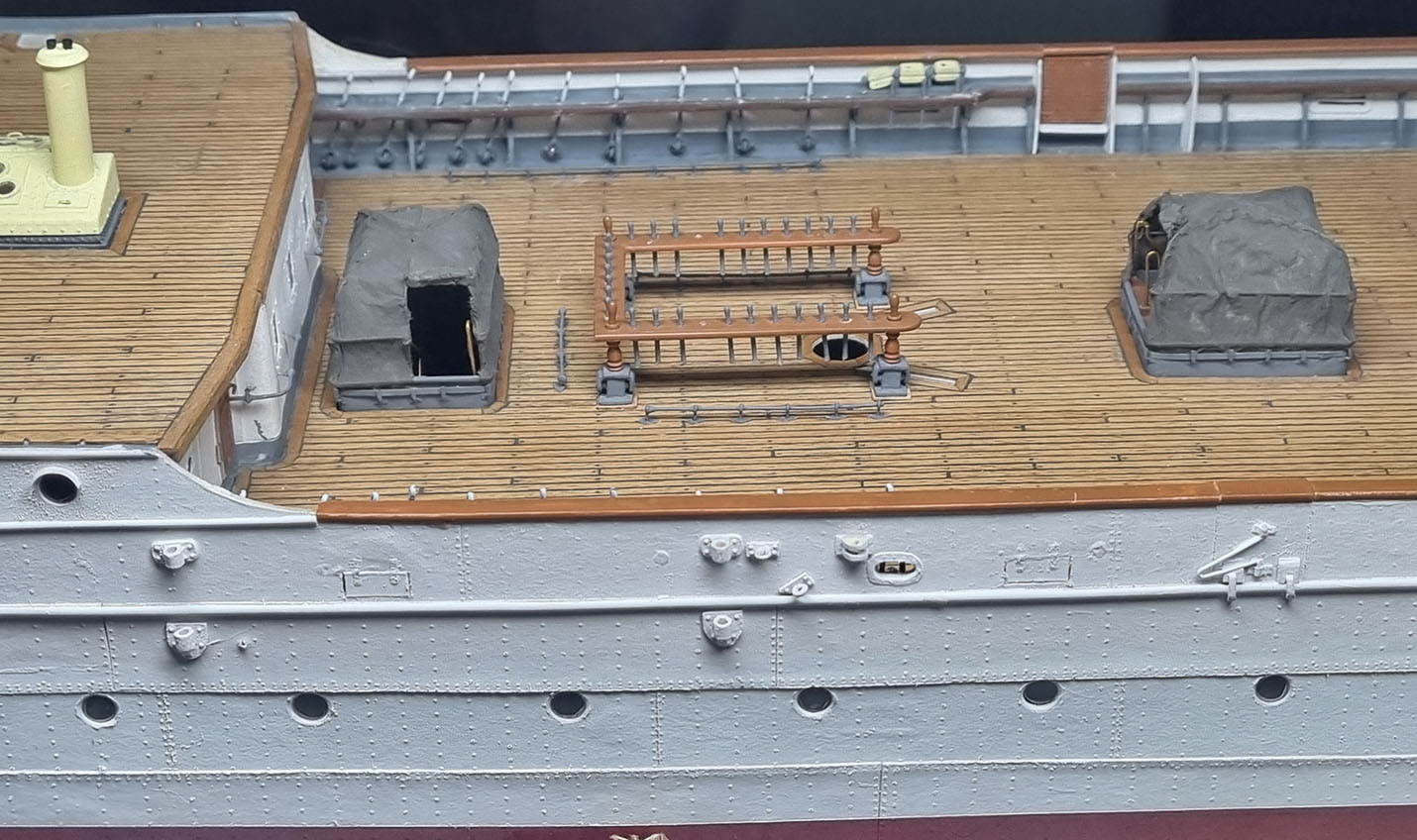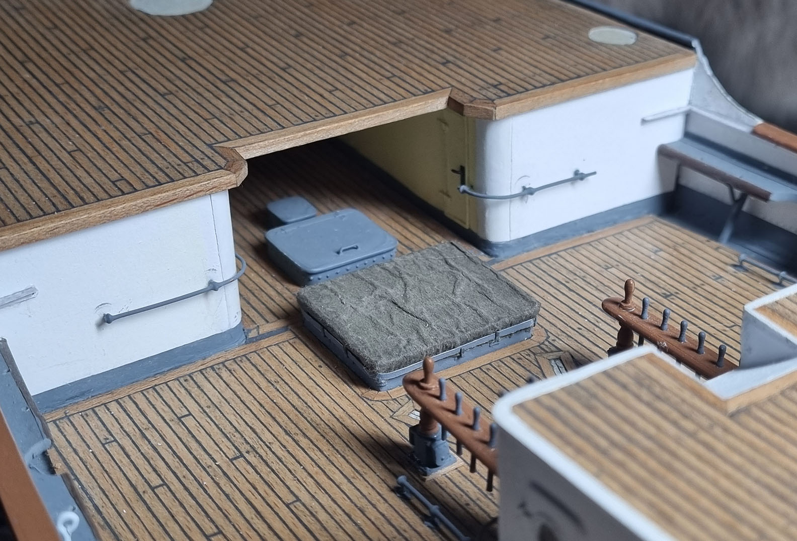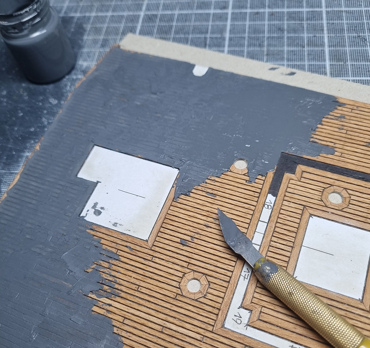 Na wszystkich pokładach szczeliny między plankami wypełniłem ciemnoszarą szpachlą akrylową a po wyschnięciu całość szlifowałem i delikatnie przetarłem olejem duńskim dla wydobycia głębi koloru.