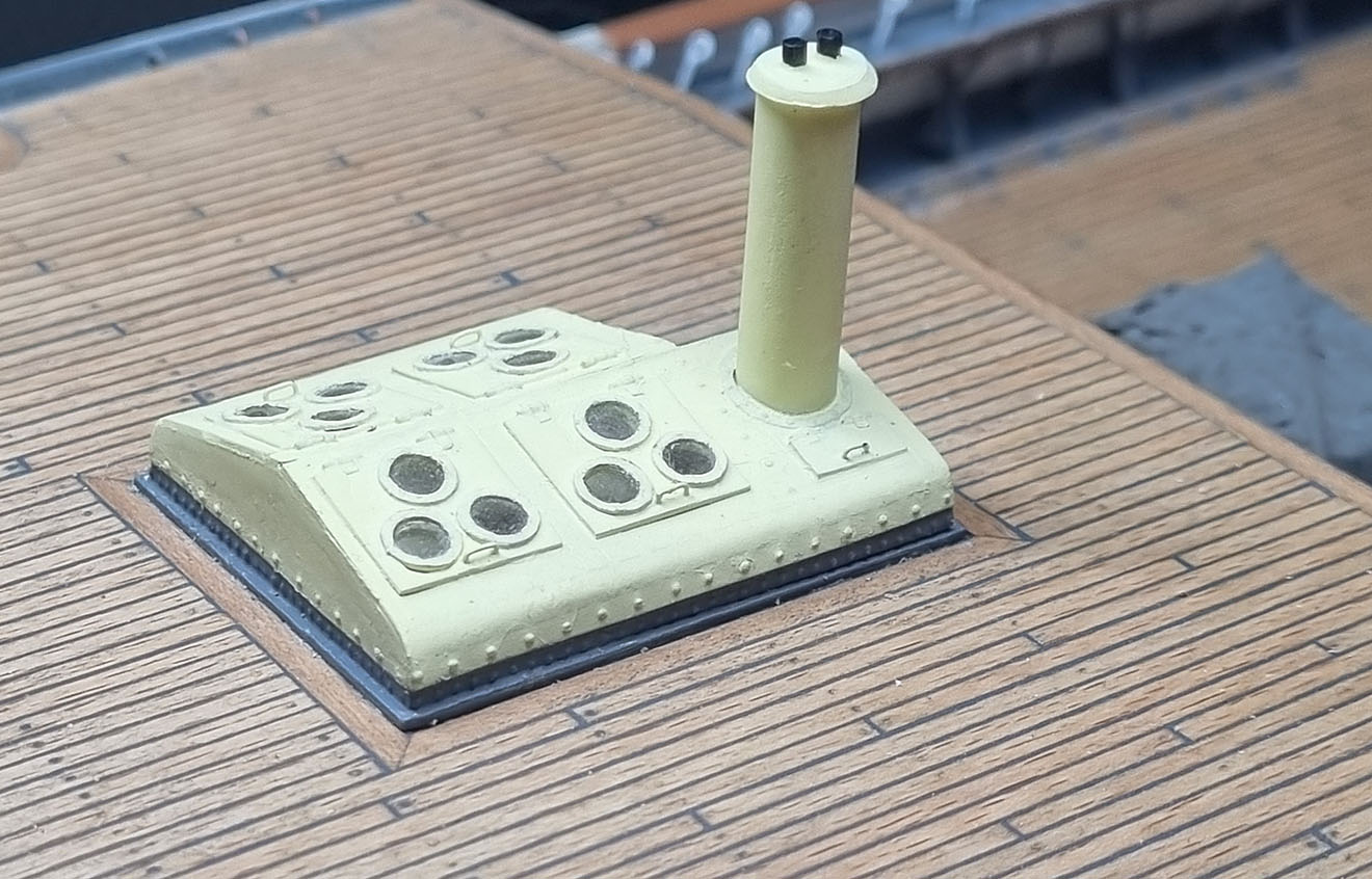 Dalsze części nadbudówek i wyposażenia sukcesywnie rysuję w CAD-zie i drukuję na drukarce laserowej na zwykłach kartkach A4 90gr. Dlatego też całość (z wyjątkiem oczywiście pokładu) po sklejeniu i obrobieniu jest malowana. Malowanie wyłącznie aerografami - pędzlem robię tylko poprawki. Używam farb akrylowych (Tamiya, Vallejo, AK).