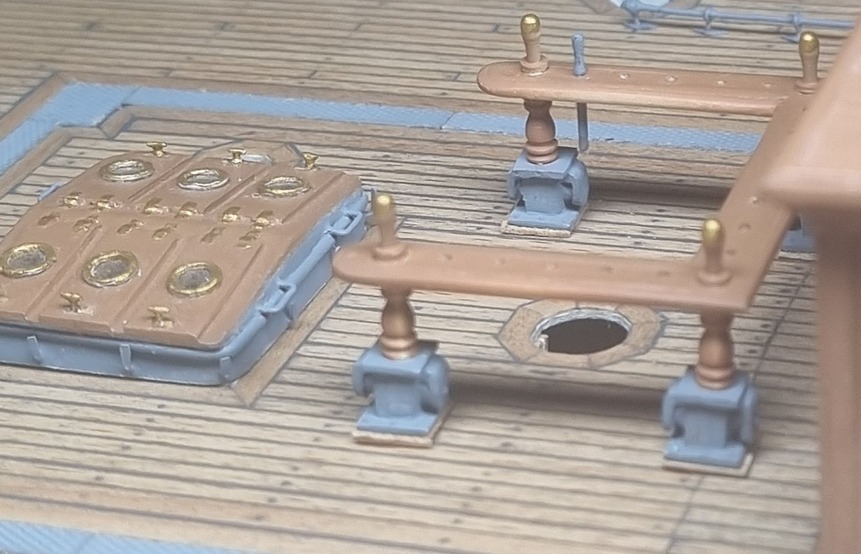 Podwięzie want i padun, wsporniki nagielbanków na rufówce i poręcze lutowane z drucików i blaszek miedzianych.