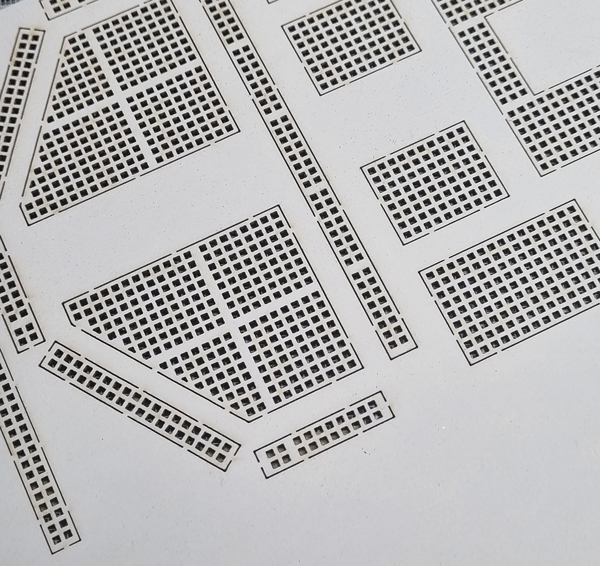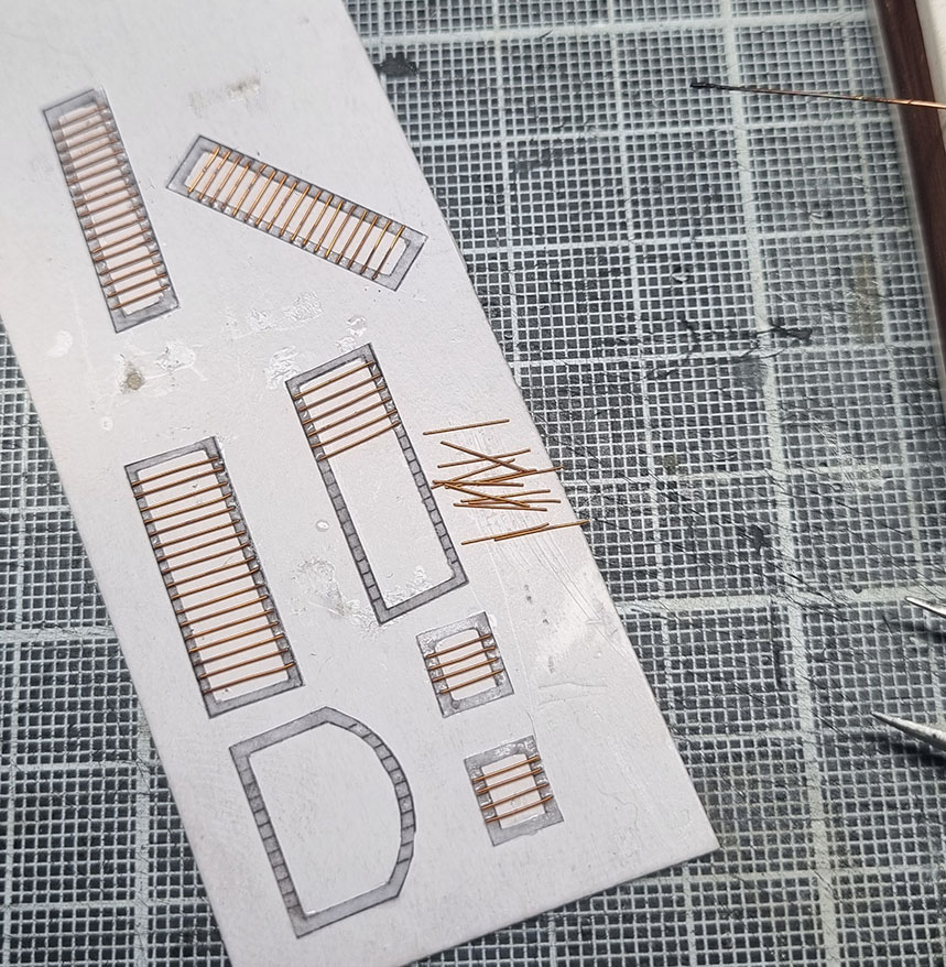 Gretingi –pierwotnie o oczku 0,8x0,8mm zostały zaprojektowane w CAD-zie i cięte laserem (ukłony dla p.Tomasza z wydawnictwa Seahorse) Jednak po zmontowaniu oczka 08x08 wydały mi się zbyt rzadkie. Ostatecznie gretingi o oczku 0,5x0,5mm posklejałem z pasków papieru 90gr ale już bez kwadracików 0,5x0,5 na skrzyżowaniach które już odpuściłem.