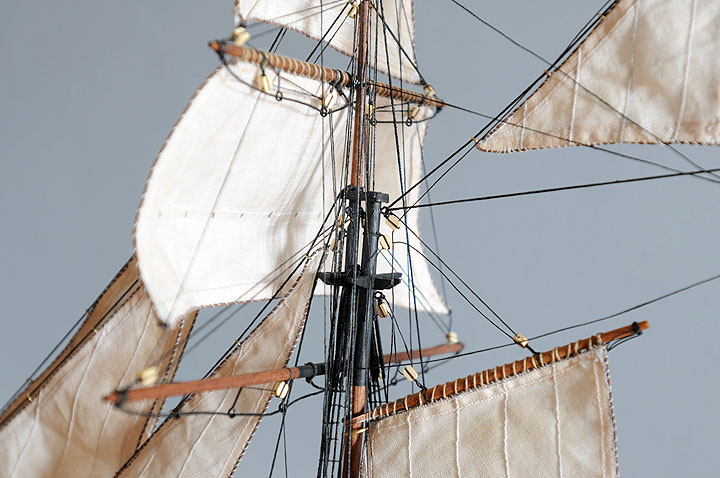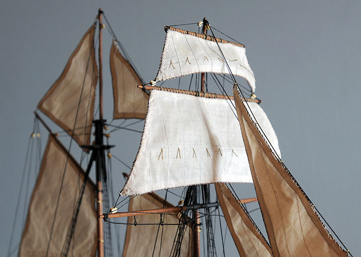 Nie żebym się czepiał ale czy nie powinno być więcej pierścieni mocujących żagiel do masztów . Z kolei chyba ciut za dużo przeszyć mocujących żagle do rei żagli gaflowych ( a tu plama nie wiem jak się zwą ) Tak efektwizualny jak dotąd b. ładny.