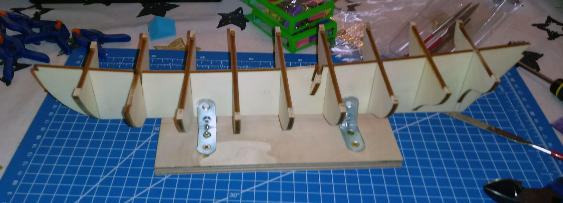 Szkielet: Tu widać wykonane przeze mnie kątowniki, które pomagają utrzymać wręgi pod kątem 90 stopni.