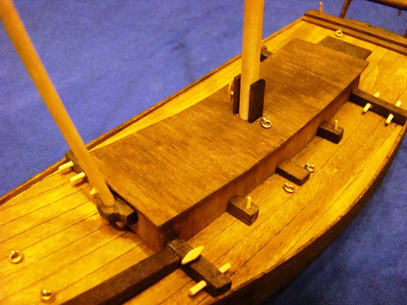 Budowa powoli idzie na przód. Rufę mam w dużej części zrobioną, ale jeszcze kilka elementów czeka na założenie, więc zdjęcie zamieszczę później. Dziś część dziobowa. Sorki za kilka paproszków. Nie zauważyłem ich, a teraz już mi się nie chce robić drugiego zdjęcia. Poprawię się