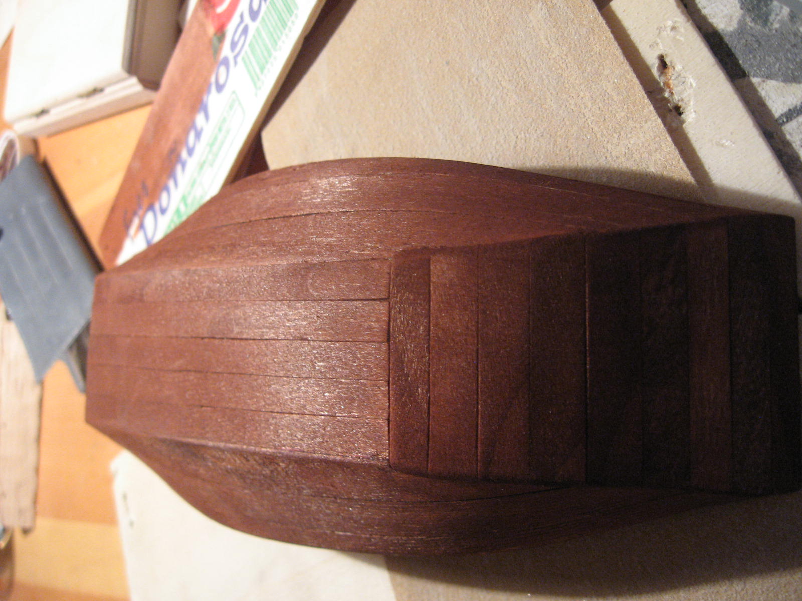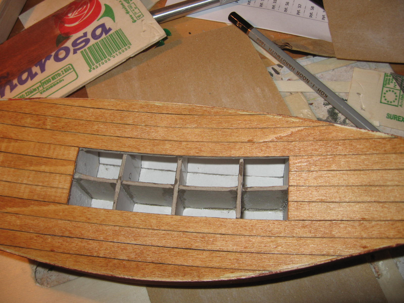 Tak jak pisałem w przywitalni zaczynam relację z budowy. Trochę od środka ale niestety wcześniej nie miałem dostępu do aparatu. Szkielet wykonałem z 2 mm tektury, natomiast poszycie z sklejki odzyskanej ze skrzynek po owocach. 3-mm sklejkę rozwarstwiłem i w ten sposób uzyskałem 1-mm grubości paski drewna. Nie wiem czy ten materiał nadaję się idealnie na tego typu prace, ale akurat nic innego nie miałem. Poniżej zdjęcia poszycia: